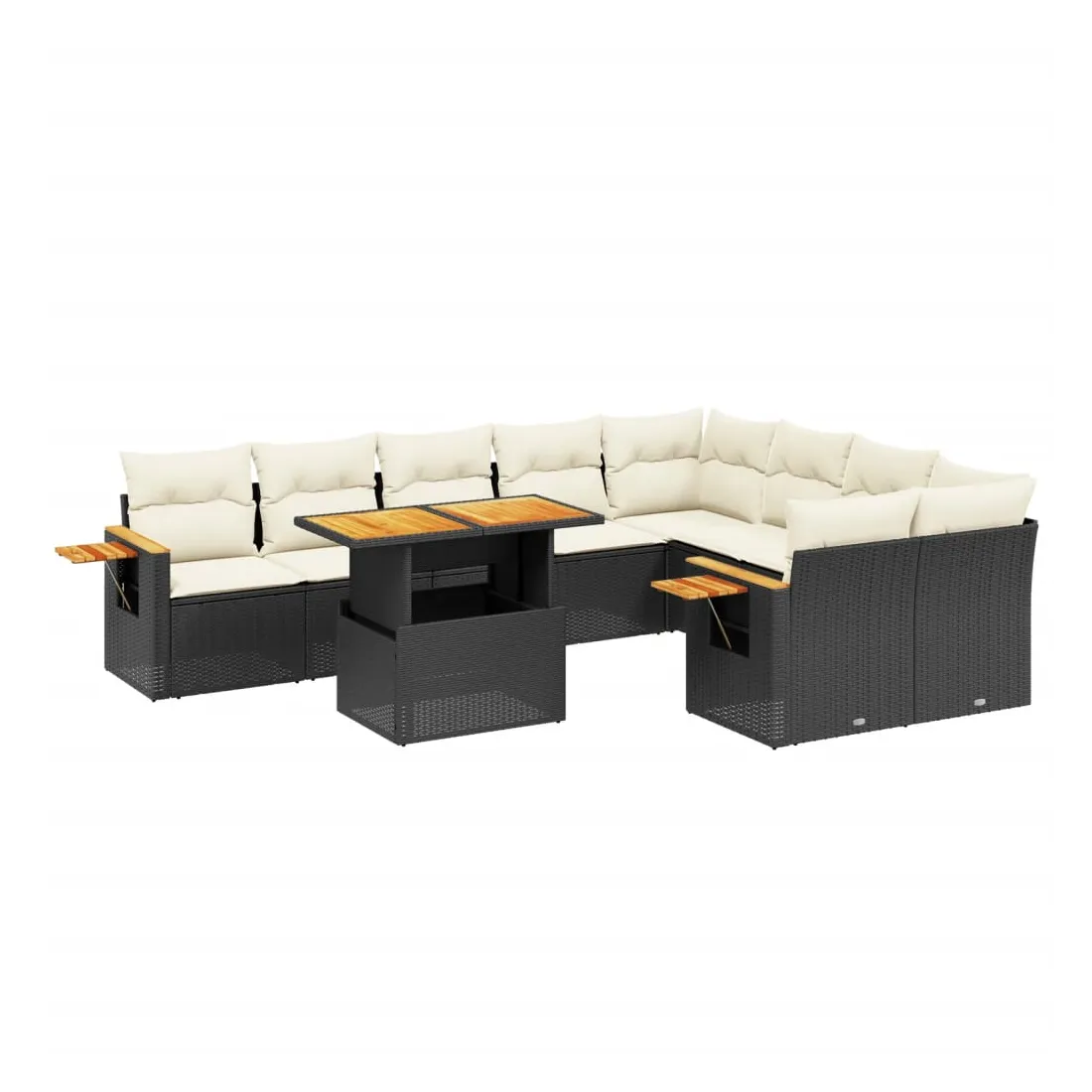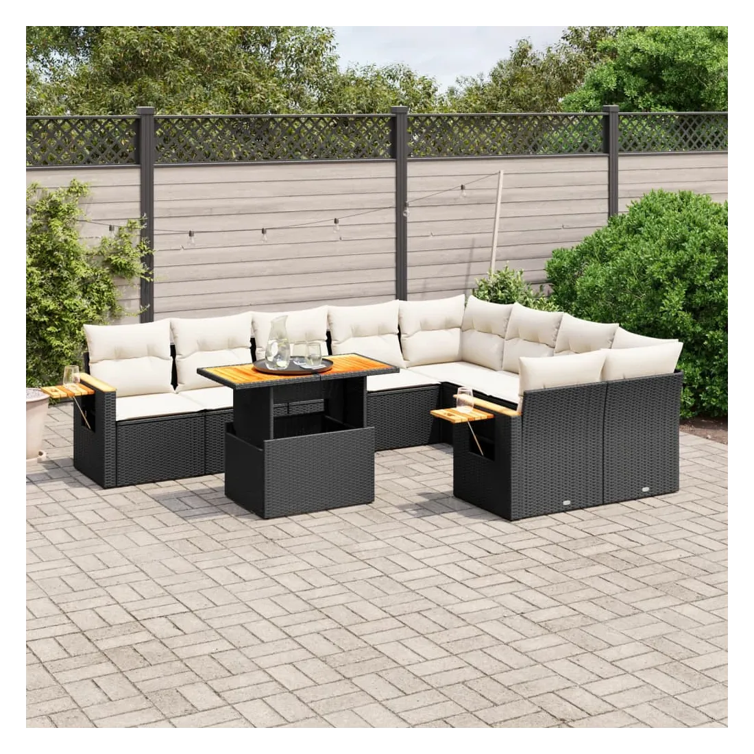 Cet ensemble de canapés de jardin est le complément parfait de votre arrière-cour, terrasse ou patio, offrant un espace confortable et accueillant pour discuter avec la famille et les amis ou simplement se détendre et profiter de l'extérieur. Matériau durable : la résine tressée, également connue sous le nom de poly rotin, est un matériau synthétique solide et nécessitant peu d'entretien qui ressemble au rotin naturel. Il est léger, facile à nettoyer et couramment utilisé pour les meubles d'extérieur en raison de sa durabilité et de ses propriétés de résistance aux intempéries.Dessus de table réglable : le dessus de table peut être soulevé pour rendre la table plus haute, ce qui transforme la table d'extérieur d'une table basse à une table de salle à manger. Elle est parfaite pour recevoir des invités ou prendre des repas à l'extérieur.Table d'appoint pratique : ce mobilier d'extérieur comprend une table d'appoint pliable avec un ressort à gaz sur les accoudoirs, offrant un endroit pratique pour garder vos essentiels à portée de main.Housse amovible et lavable : ces coussins de siège sont dotés de housses amovibles pour un lavage et un entretien faciles.Conception modulaire : cet ensemble de meubles d'extérieur a une conception modulaire, ce qui le rend complètement flexible et facile à déplacer, afin que vous puissiez créer un agencement de meubles d'extérieur personnalisé. Bon à savoir :Pour que vos meubles d'extérieur restent beaux, nous vous recommandons de les protéger avec une housse imperméable.