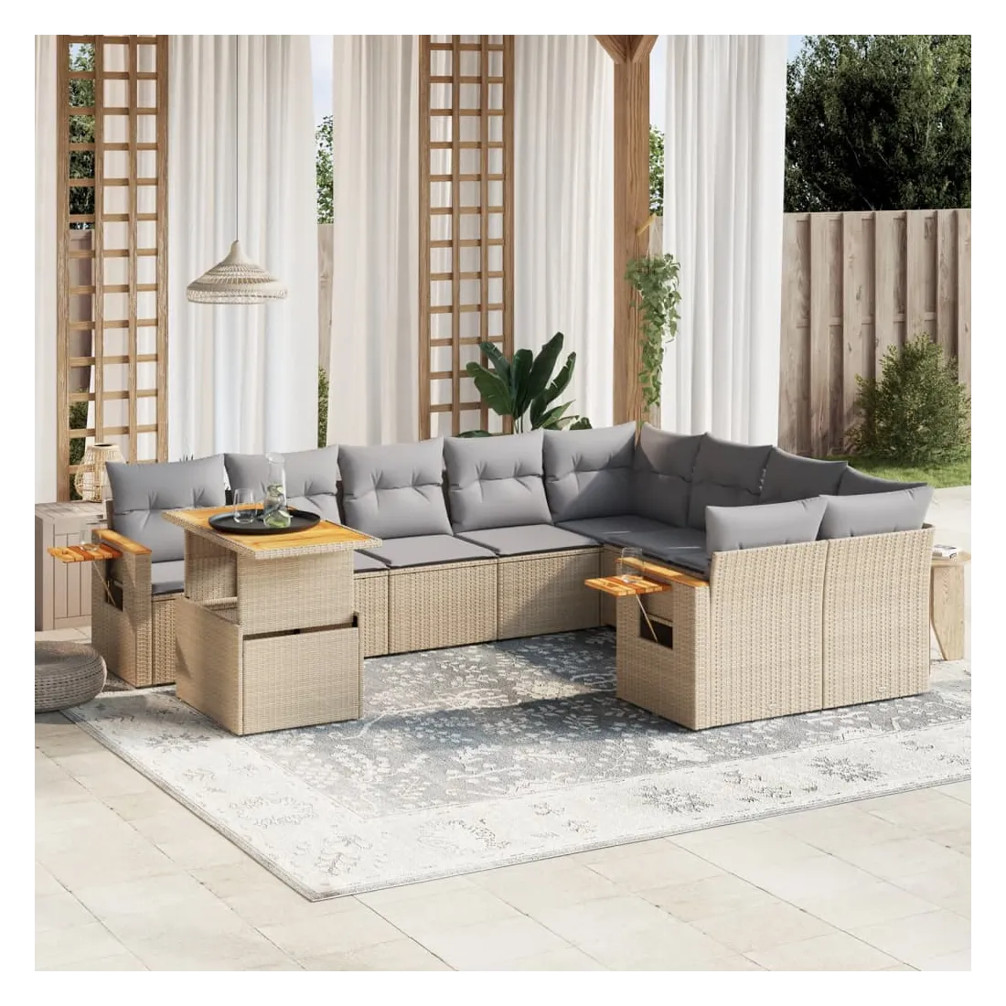 Cet ensemble de canapés de jardin est le complément parfait de votre arrière-cour, terrasse ou patio, offrant un espace confortable et accueillant pour discuter avec la famille et les amis ou simplement se détendre et profiter de l'extérieur. Matériau durable : la résine tressée, également connue sous le nom de poly rotin, est un matériau synthétique solide et nécessitant peu d'entretien qui ressemble au rotin naturel. Il est léger, facile à nettoyer et couramment utilisé pour les meubles d'extérieur en raison de sa durabilité et de ses propriétés de résistance aux intempéries.Dessus de table réglable : le dessus de table peut être soulevé pour rendre la table plus haute, ce qui transforme la table d'extérieur d'une table basse à une table de salle à manger. Elle est parfaite pour recevoir des invités ou prendre des repas à l'extérieur.Table d'appoint pratique : ce mobilier d'extérieur comprend une table d'appoint pliable avec un ressort à gaz sur les accoudoirs, offrant un endroit pratique pour garder vos essentiels à portée de main.Housse amovible et lavable : ces coussins de siège sont dotés de housses amovibles pour un lavage et un entretien faciles.Conception modulaire : cet ensemble de meubles d'extérieur a une conception modulaire, ce qui le rend complètement flexible et facile à déplacer, afin que vous puissiez créer un agencement de meubles d'extérieur personnalisé. Bon à savoir :Pour que vos meubles d'extérieur restent beaux, nous vous recommandons de les protéger avec une housse imperméable.