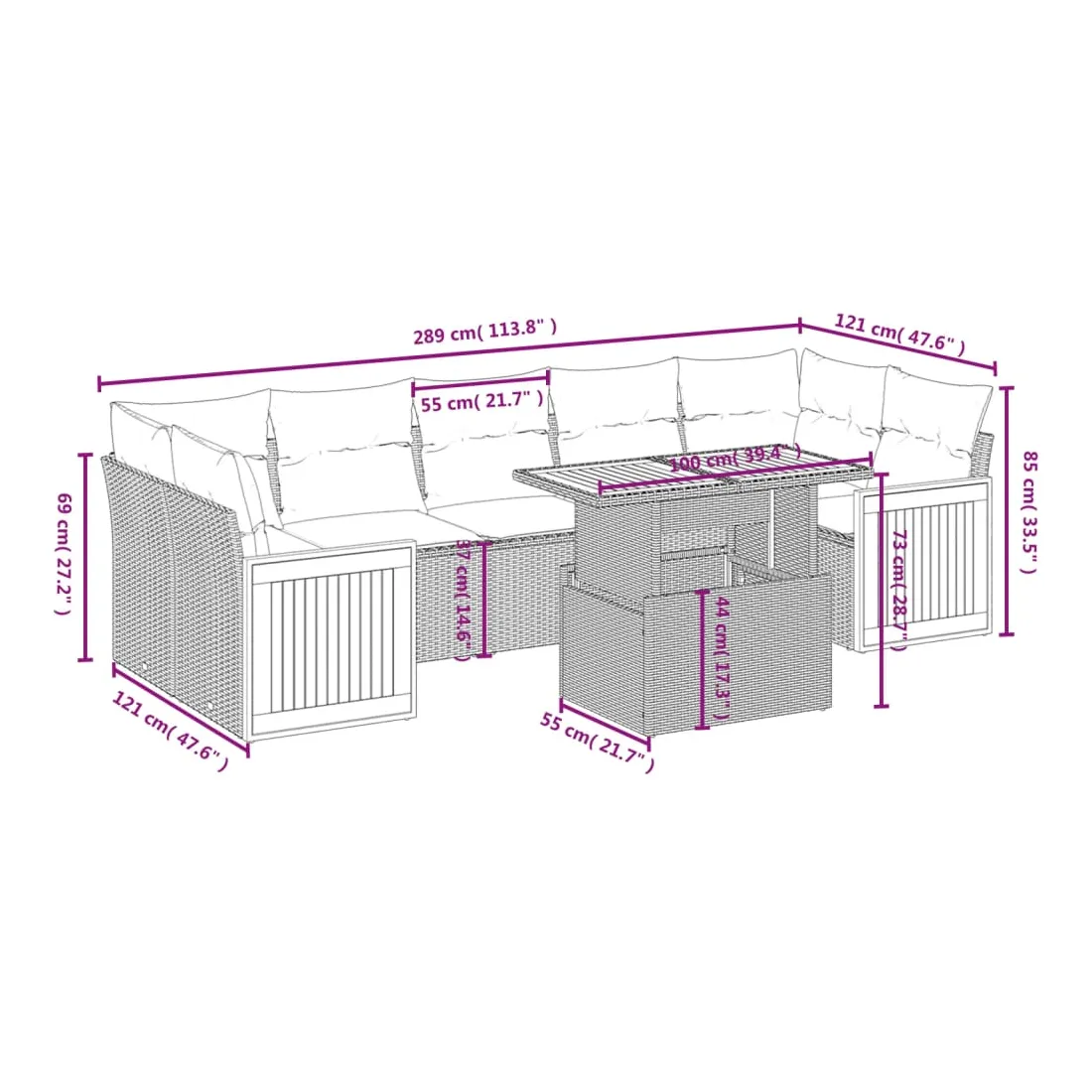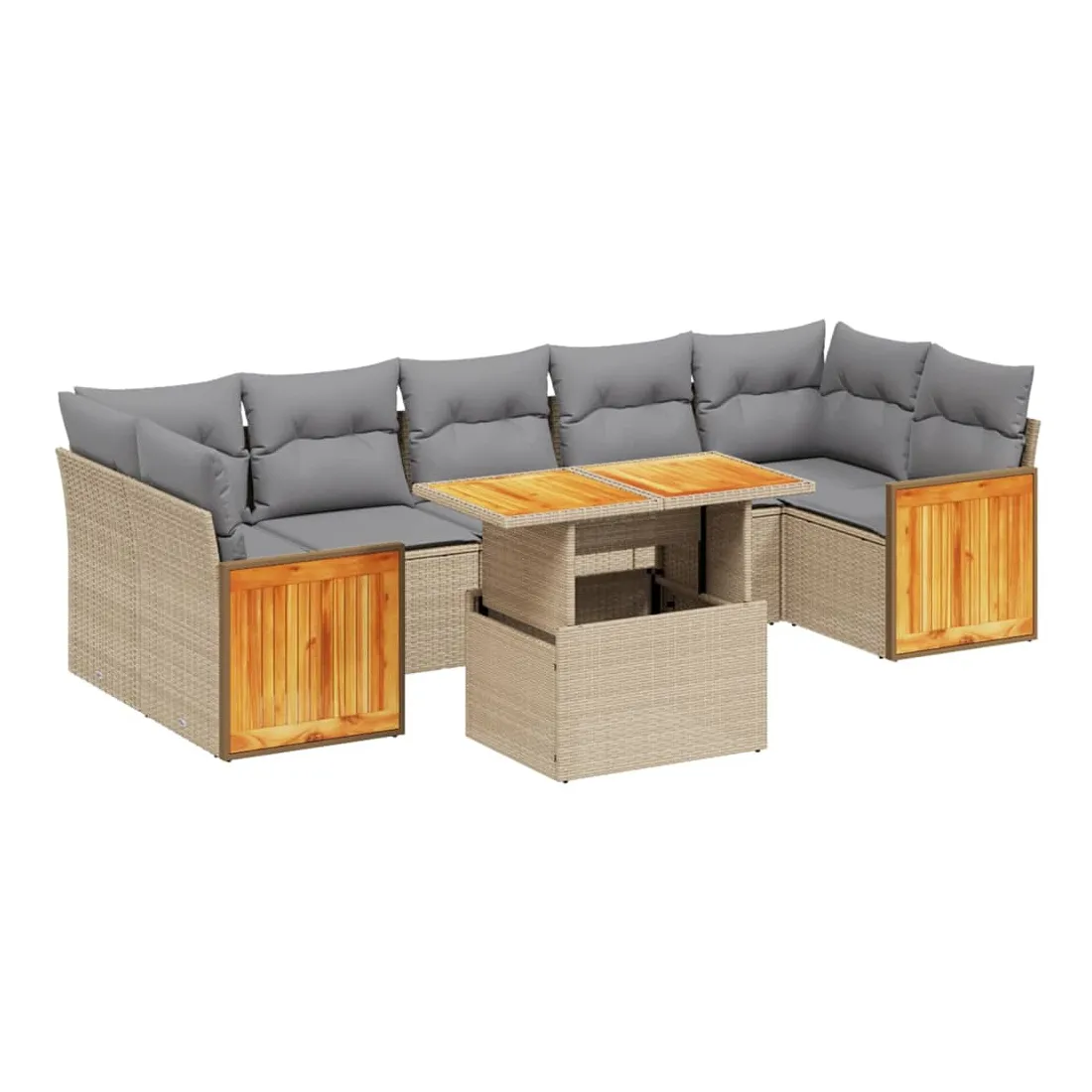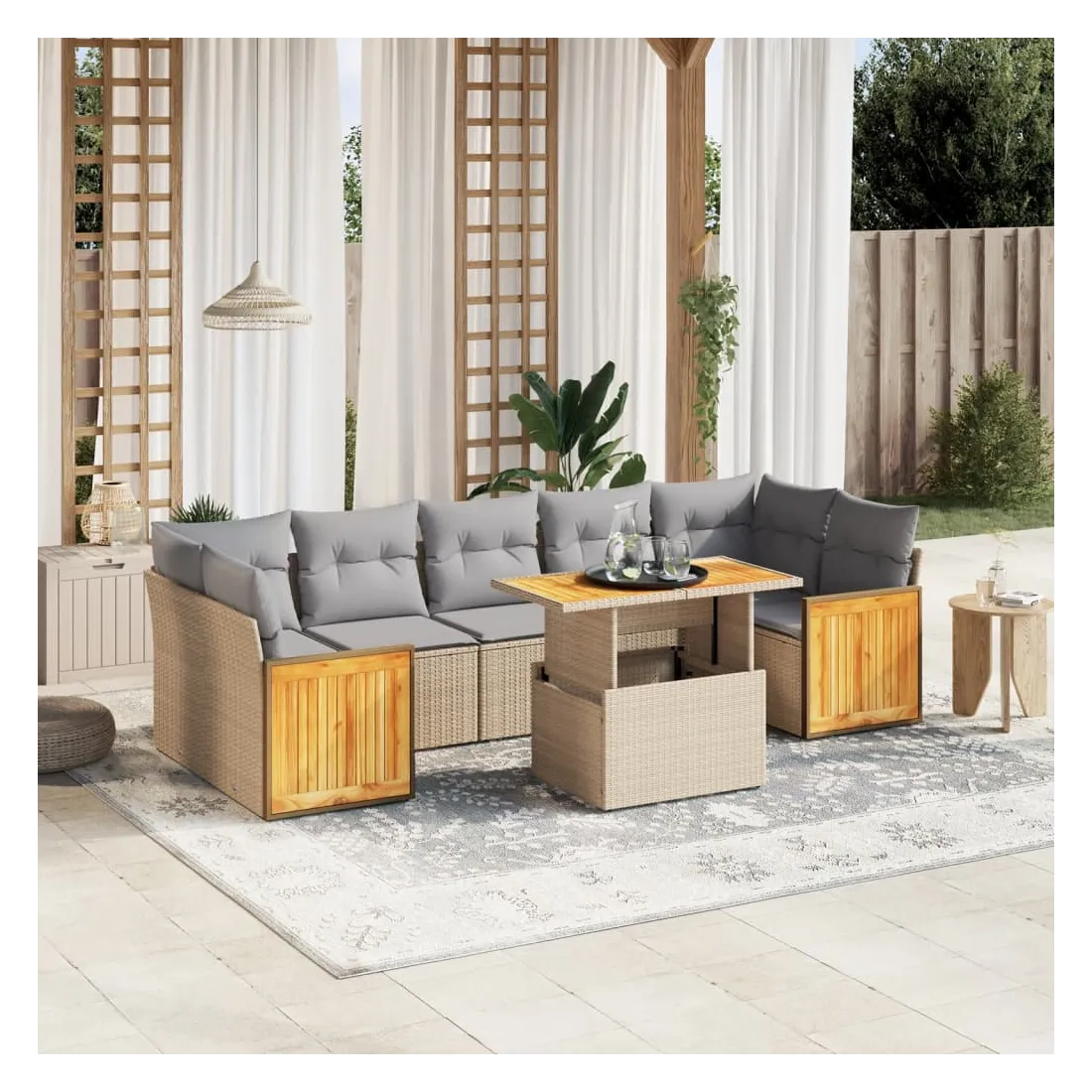 Cet ensemble de canapés de jardin est le complément parfait de votre arrière-cour, terrasse ou patio, offrant un espace confortable et accueillant pour discuter avec la famille et les amis ou simplement se détendre et profiter de l'extérieur. Matériau durable : la résine tressée, également connue sous le nom de poly rotin, est un matériau synthétique solide et nécessitant peu d'entretien qui ressemble au rotin naturel. Il est léger, facile à nettoyer et couramment utilisé pour les meubles d'extérieur en raison de sa durabilité et de ses propriétés de résistance aux intempéries.Dessus de table réglable : le dessus de table peut être soulevé pour rendre la table plus haute, ce qui transforme la table d'extérieur d'une table basse à une table de salle à manger. Elle est parfaite pour recevoir des invités ou prendre des repas à l'extérieur.Housse amovible et lavable : ces coussins de siège sont dotés de housses amovibles pour un lavage et un entretien faciles.Conception modulaire : cet ensemble de meubles d'extérieur a une conception modulaire, ce qui le rend complètement flexible et facile à déplacer, afin que vous puissiez créer un agencement de meubles d'extérieur personnalisé. Bon à savoir :Pour que vos meubles d'extérieur restent beaux, nous vous recommandons de les protéger avec une housse imperméable.