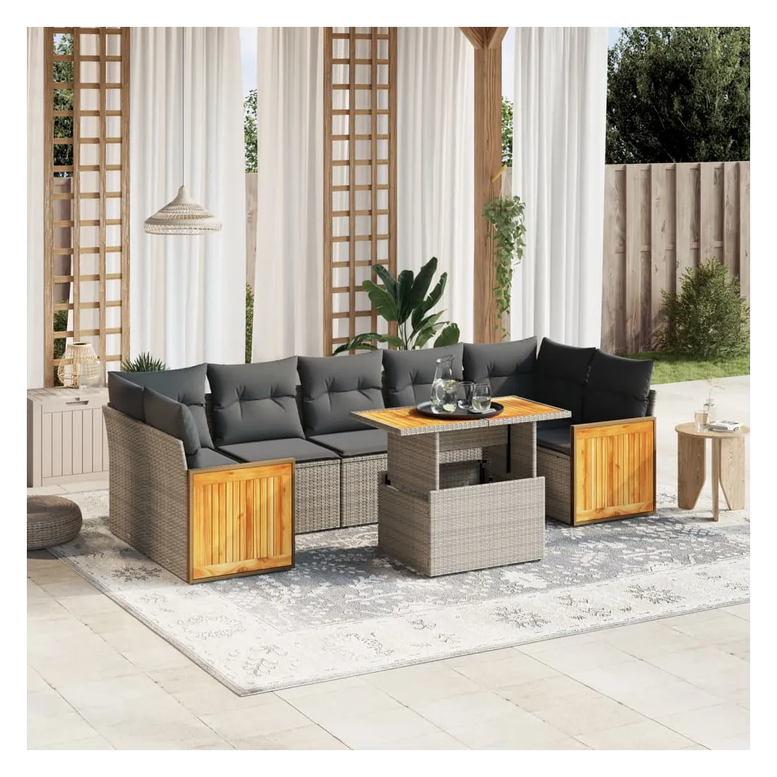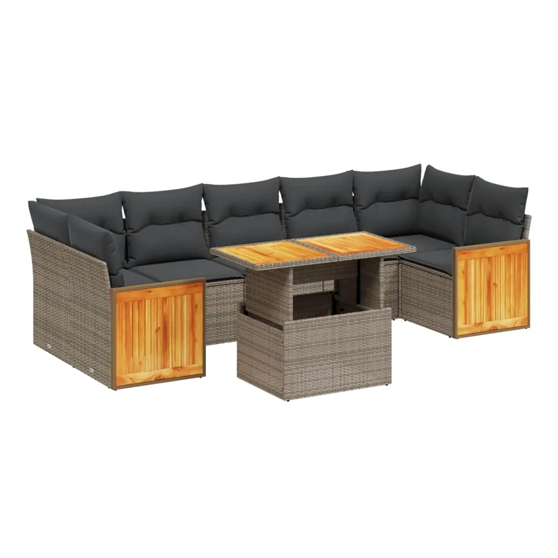 Cet ensemble de canapés de jardin est le complément parfait de votre arrière-cour, terrasse ou patio, offrant un espace confortable et accueillant pour discuter avec la famille et les amis ou simplement se détendre et profiter de l'extérieur. Matériau durable : la résine tressée, également connue sous le nom de poly rotin, est un matériau synthétique solide et nécessitant peu d'entretien qui ressemble au rotin naturel. Il est léger, facile à nettoyer et couramment utilisé pour les meubles d'extérieur en raison de sa durabilité et de ses propriétés de résistance aux intempéries.Dessus de table réglable : le dessus de table peut être soulevé pour rendre la table plus haute, ce qui transforme la table d'extérieur d'une table basse à une table de salle à manger. Elle est parfaite pour recevoir des invités ou prendre des repas à l'extérieur.Housse amovible et lavable : ces coussins de siège sont dotés de housses amovibles pour un lavage et un entretien faciles.Conception modulaire : cet ensemble de meubles d'extérieur a une conception modulaire, ce qui le rend complètement flexible et facile à déplacer, afin que vous puissiez créer un agencement de meubles d'extérieur personnalisé. Bon à savoir :Pour que vos meubles d'extérieur restent beaux, nous vous recommandons de les protéger avec une housse imperméable.