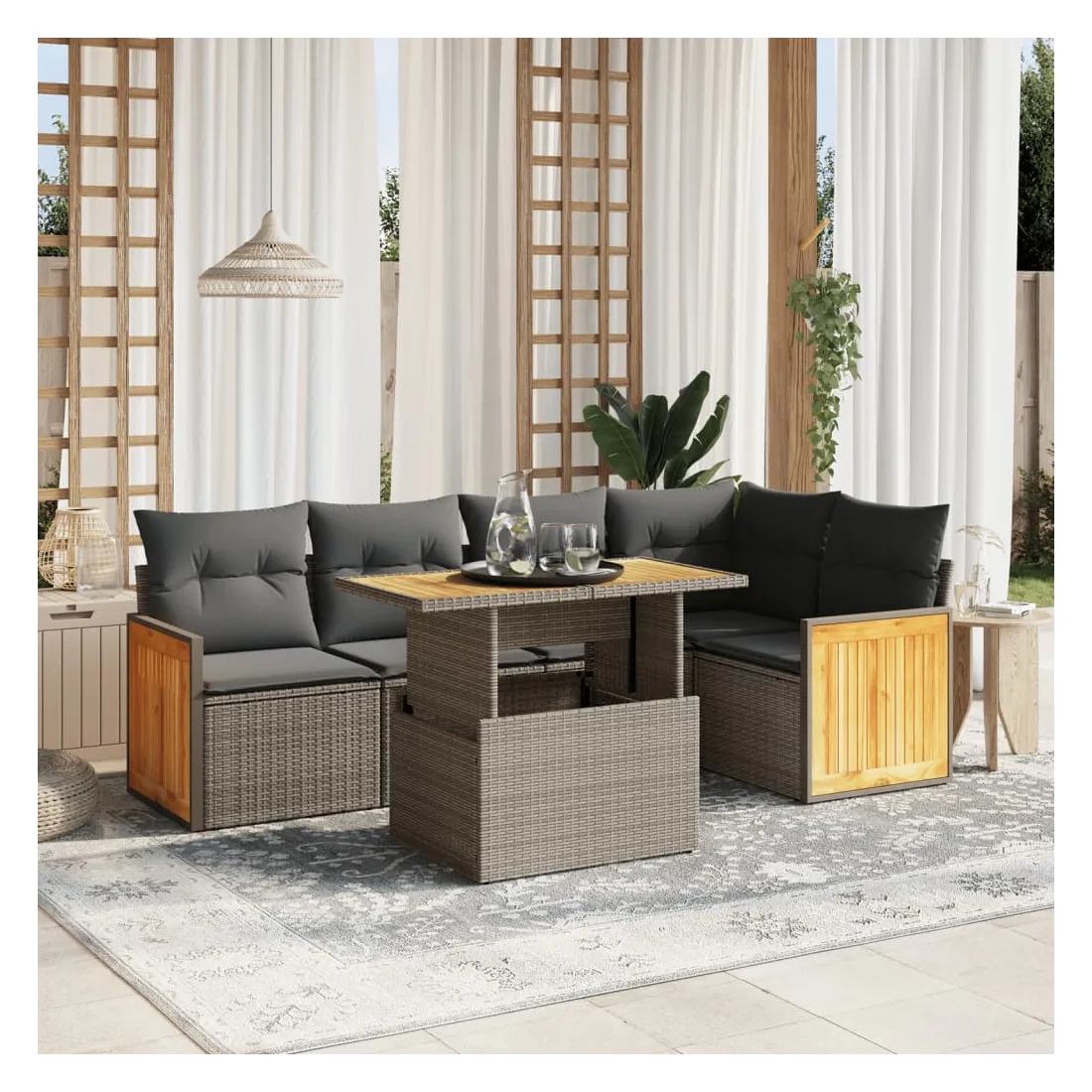 Cet ensemble de canapés de jardin est le complément parfait de votre arrière-cour, terrasse ou patio, offrant un espace confortable et accueillant pour discuter avec la famille et les amis ou simplement se détendre et profiter de l'extérieur. Matériau durable : la résine tressée, également connue sous le nom de poly rotin, est un matériau synthétique solide et nécessitant peu d'entretien qui ressemble au rotin naturel. Il est léger, facile à nettoyer et couramment utilisé pour les meubles d'extérieur en raison de sa durabilité et de ses propriétés de résistance aux intempéries.Dessus de table réglable : le dessus de table peut être soulevé pour rendre la table plus haute, ce qui transforme la table d'extérieur d'une table basse à une table de salle à manger. Elle est parfaite pour recevoir des invités ou prendre des repas à l'extérieur.Housse amovible et lavable : ces coussins de siège sont dotés de housses amovibles pour un lavage et un entretien faciles.Conception modulaire : cet ensemble de meubles d'extérieur a une conception modulaire, ce qui le rend complètement flexible et facile à déplacer, afin que vous puissiez créer un agencement de meubles d'extérieur personnalisé. Bon à savoir :Pour que vos meubles d'extérieur restent beaux, nous vous recommandons de les protéger avec une housse imperméable.