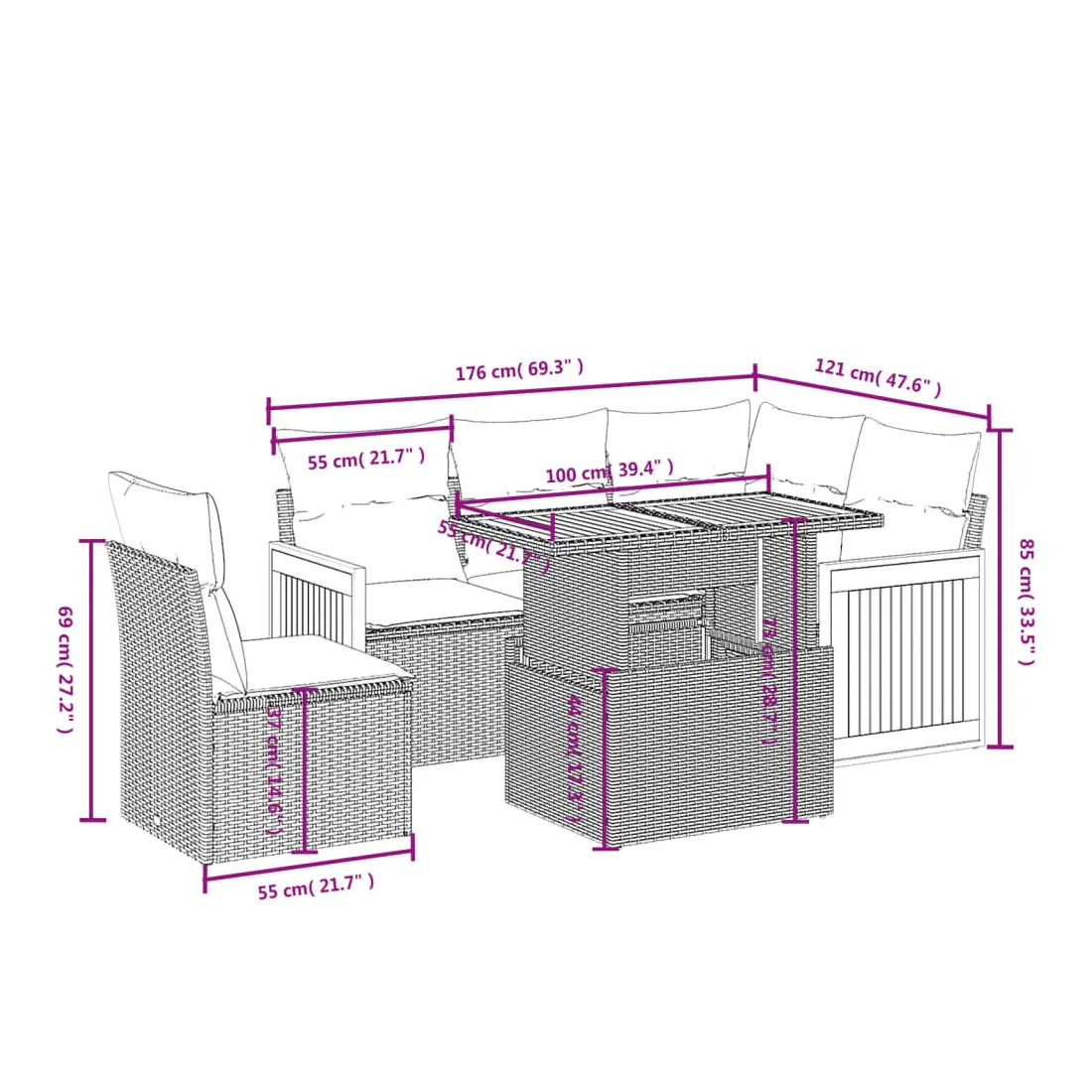 Cet ensemble de canapés de jardin est le complément parfait de votre arrière-cour, terrasse ou patio, offrant un espace confortable et accueillant pour discuter avec la famille et les amis ou simplement se détendre et profiter de l'extérieur. Matériau durable : la résine tressée, également connue sous le nom de poly rotin, est un matériau synthétique solide et nécessitant peu d'entretien qui ressemble au rotin naturel. Il est léger, facile à nettoyer et couramment utilisé pour les meubles d'extérieur en raison de sa durabilité et de ses propriétés de résistance aux intempéries.Dessus de table réglable : le dessus de table peut être soulevé pour rendre la table plus haute, ce qui transforme la table d'extérieur d'une table basse à une table de salle à manger. Elle est parfaite pour recevoir des invités ou prendre des repas à l'extérieur.Housse amovible et lavable : ces coussins de siège sont dotés de housses amovibles pour un lavage et un entretien faciles.Conception modulaire : cet ensemble de meubles d'extérieur a une conception modulaire, ce qui le rend complètement flexible et facile à déplacer, afin que vous puissiez créer un agencement de meubles d'extérieur personnalisé. Bon à savoir :Pour que vos meubles d'extérieur restent beaux, nous vous recommandons de les protéger avec une housse imperméable.