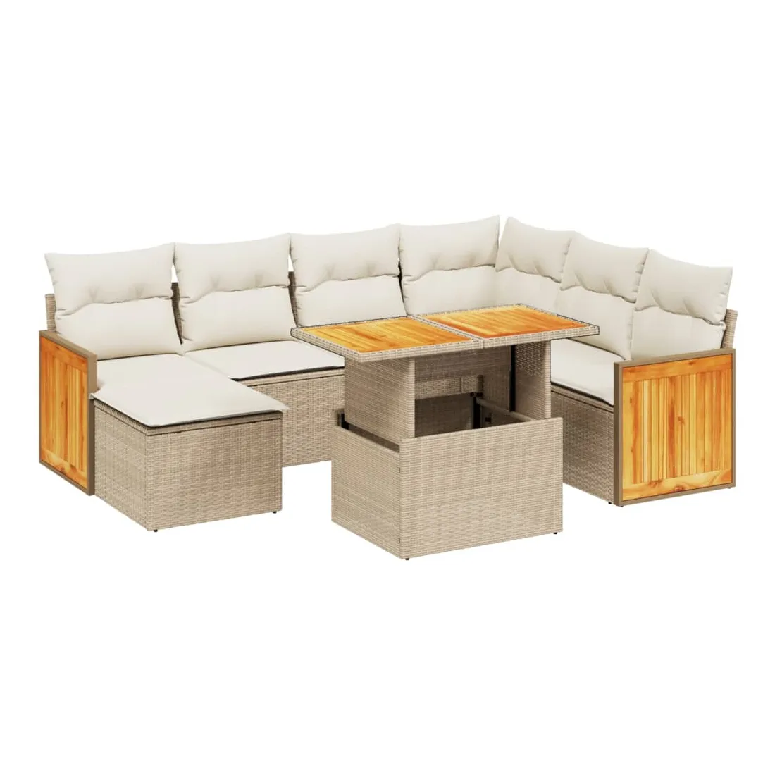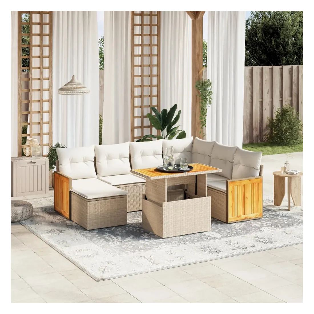 Cet ensemble de canapés de jardin est le complément parfait de votre arrière-cour, terrasse ou patio, offrant un espace confortable et accueillant pour discuter avec la famille et les amis ou simplement se détendre et profiter de l'extérieur. Matériau durable : la résine tressée, également connue sous le nom de poly rotin, est un matériau synthétique solide et nécessitant peu d'entretien qui ressemble au rotin naturel. Il est léger, facile à nettoyer et couramment utilisé pour les meubles d'extérieur en raison de sa durabilité et de ses propriétés de résistance aux intempéries.Dessus de table réglable : le dessus de table peut être soulevé pour rendre la table plus haute, ce qui transforme la table d'extérieur d'une table basse à une table de salle à manger. Elle est parfaite pour recevoir des invités ou prendre des repas à l'extérieur.Housse amovible et lavable : ces coussins de siège sont dotés de housses amovibles pour un lavage et un entretien faciles.Conception modulaire : cet ensemble de meubles d'extérieur a une conception modulaire, ce qui le rend complètement flexible et facile à déplacer, afin que vous puissiez créer un agencement de meubles d'extérieur personnalisé. Bon à savoir :Pour que vos meubles d'extérieur restent beaux, nous vous recommandons de les protéger avec une housse imperméable.