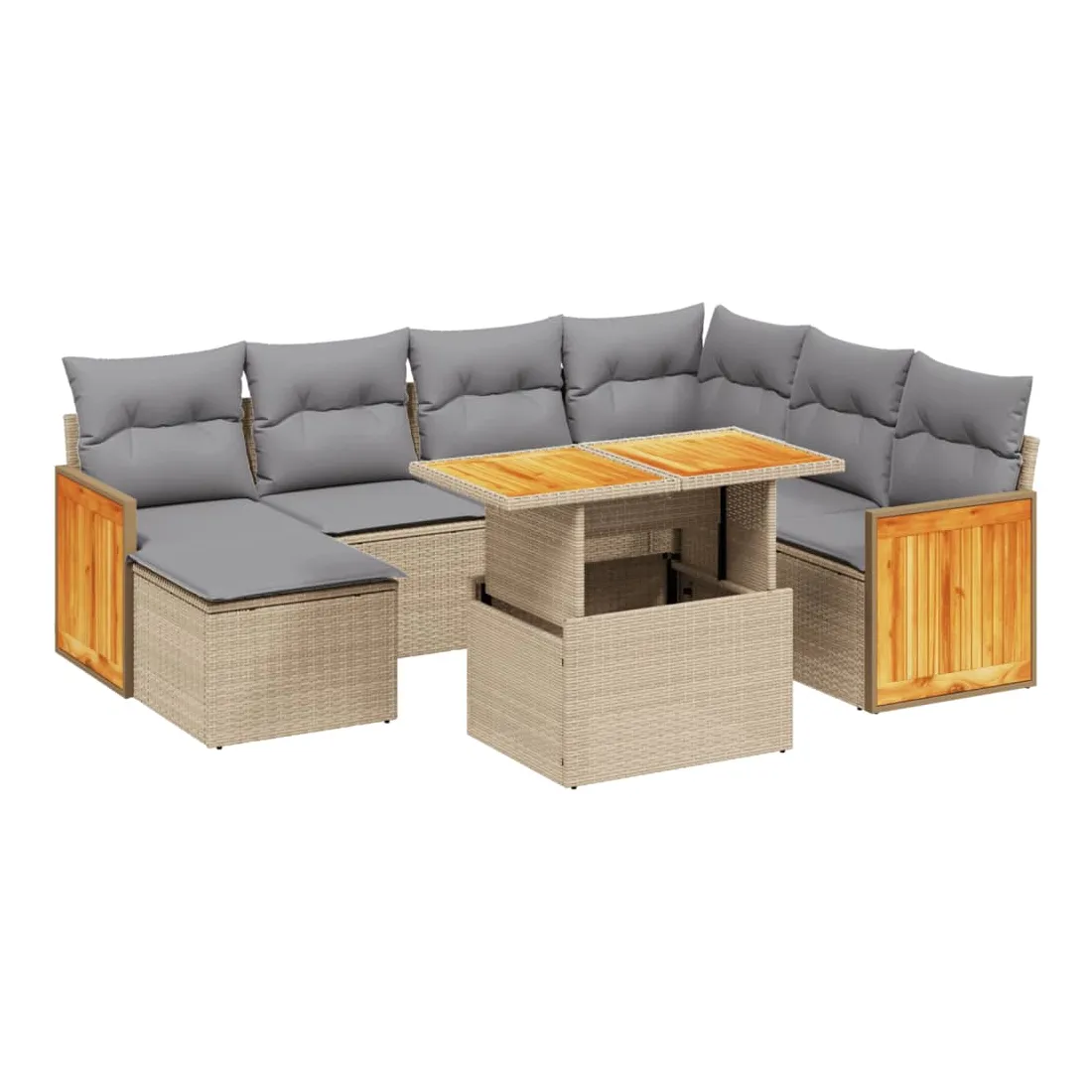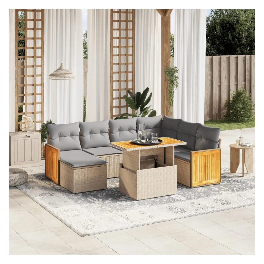 Cet ensemble de canapés de jardin est le complément parfait de votre arrière-cour, terrasse ou patio, offrant un espace confortable et accueillant pour discuter avec la famille et les amis ou simplement se détendre et profiter de l'extérieur. Matériau durable : la résine tressée, également connue sous le nom de poly rotin, est un matériau synthétique solide et nécessitant peu d'entretien qui ressemble au rotin naturel. Il est léger, facile à nettoyer et couramment utilisé pour les meubles d'extérieur en raison de sa durabilité et de ses propriétés de résistance aux intempéries.Dessus de table réglable : le dessus de table peut être soulevé pour rendre la table plus haute, ce qui transforme la table d'extérieur d'une table basse à une table de salle à manger. Elle est parfaite pour recevoir des invités ou prendre des repas à l'extérieur.Housse amovible et lavable : ces coussins de siège sont dotés de housses amovibles pour un lavage et un entretien faciles.Conception modulaire : cet ensemble de meubles d'extérieur a une conception modulaire, ce qui le rend complètement flexible et facile à déplacer, afin que vous puissiez créer un agencement de meubles d'extérieur personnalisé. Bon à savoir :Pour que vos meubles d'extérieur restent beaux, nous vous recommandons de les protéger avec une housse imperméable.