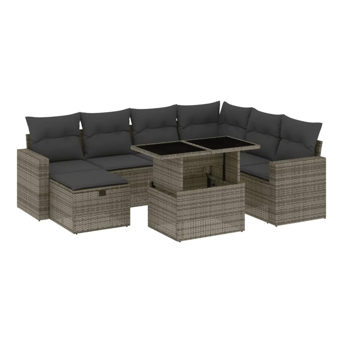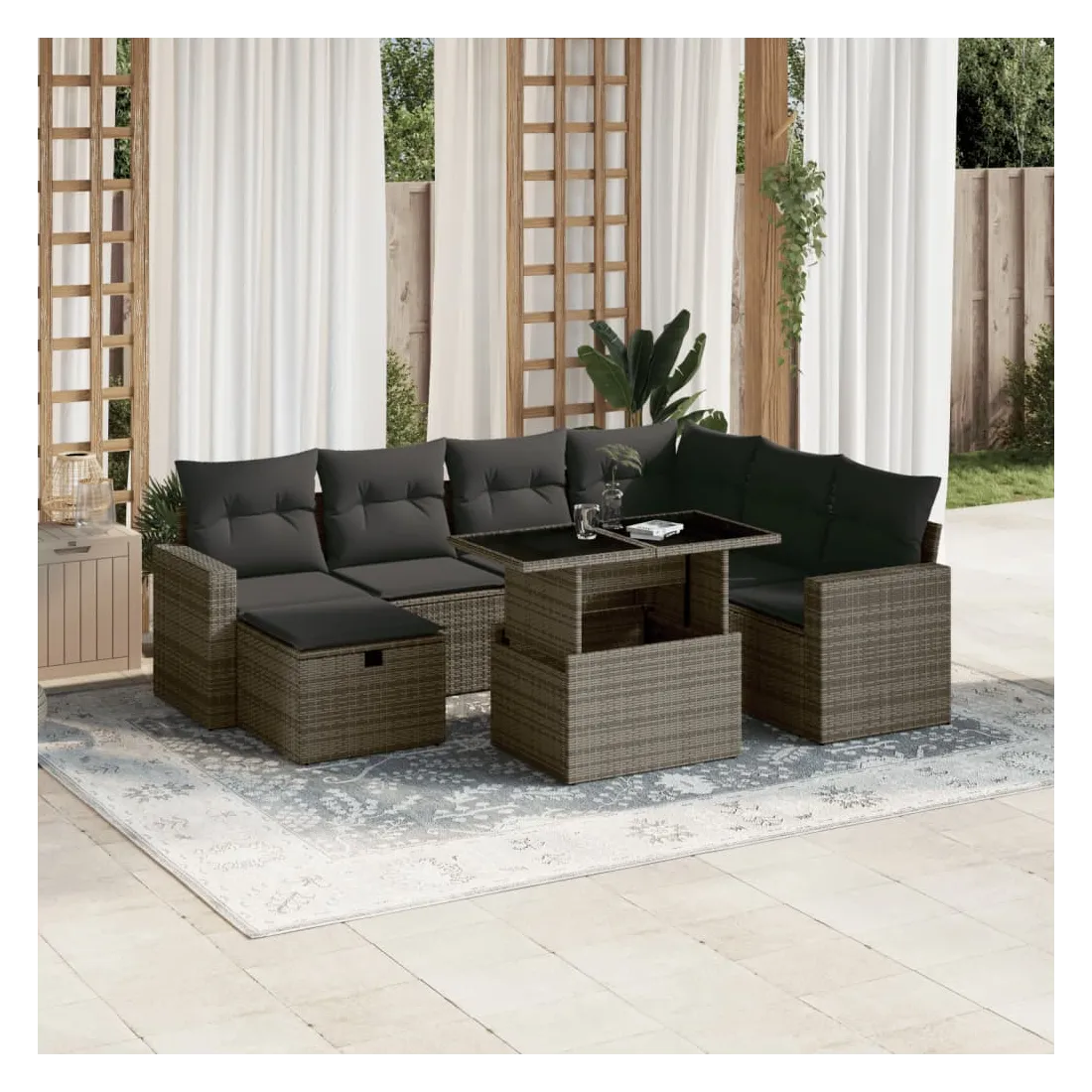 Cet ensemble de canapés de jardin est le complément parfait de votre arrière-cour, terrasse ou patio, offrant un espace confortable et accueillant pour discuter avec la famille et les amis ou simplement se détendre et profiter de l'extérieur. Matériau durable : la résine tressée, également connue sous le nom de poly rotin, est un matériau synthétique solide et nécessitant peu d'entretien qui ressemble au rotin naturel. Il est léger, facile à nettoyer et couramment utilisé pour les meubles d'extérieur en raison de sa durabilité et de ses propriétés de résistance aux intempéries.Dessus de table réglable : le dessus de table peut être soulevé pour rendre la table plus haute, ce qui transforme la table d'extérieur d'une table basse à une table de salle à manger. Elle est parfaite pour recevoir des invités ou prendre des repas à l'extérieur.Housse amovible et lavable : ces coussins de siège sont dotés de housses amovibles pour un lavage et un entretien faciles.Conception modulaire : cet ensemble de meubles d'extérieur a une conception modulaire, ce qui le rend complètement flexible et facile à déplacer, afin que vous puissiez créer un agencement de meubles d'extérieur personnalisé. Bon à savoir :Pour que vos meubles d'extérieur restent beaux, nous vous recommandons de les protéger avec une housse imperméable.