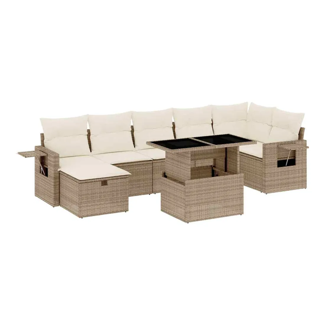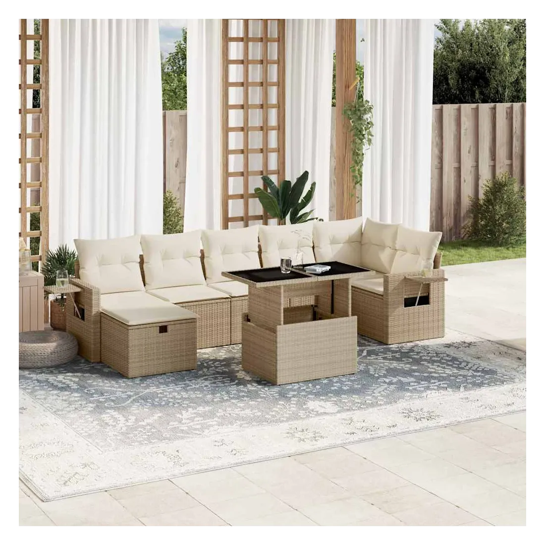 Cet ensemble de canapés de jardin est le complément parfait de votre arrière-cour, terrasse ou patio, offrant un espace confortable et accueillant pour discuter avec la famille et les amis ou simplement se détendre et profiter de l'extérieur. Matériau durable : la résine tressée, également connue sous le nom de poly rotin, est un matériau synthétique solide et nécessitant peu d'entretien qui ressemble au rotin naturel. Il est léger, facile à nettoyer et couramment utilisé pour les meubles d'extérieur en raison de sa durabilité et de ses propriétés de résistance aux intempéries.Dessus de table réglable : le dessus de table peut être soulevé pour rendre la table plus haute, ce qui transforme la table d'extérieur d'une table basse à une table de salle à manger. Elle est parfaite pour recevoir des invités ou prendre des repas à l'extérieur.Housse amovible et lavable : ces coussins de siège sont dotés de housses amovibles pour un lavage et un entretien faciles.Conception modulaire : cet ensemble de meubles d'extérieur a une conception modulaire, ce qui le rend complètement flexible et facile à déplacer, afin que vous puissiez créer un agencement de meubles d'extérieur personnalisé. Bon à savoir :Pour que vos meubles d'extérieur restent beaux, nous vous recommandons de les protéger avec une housse imperméable.