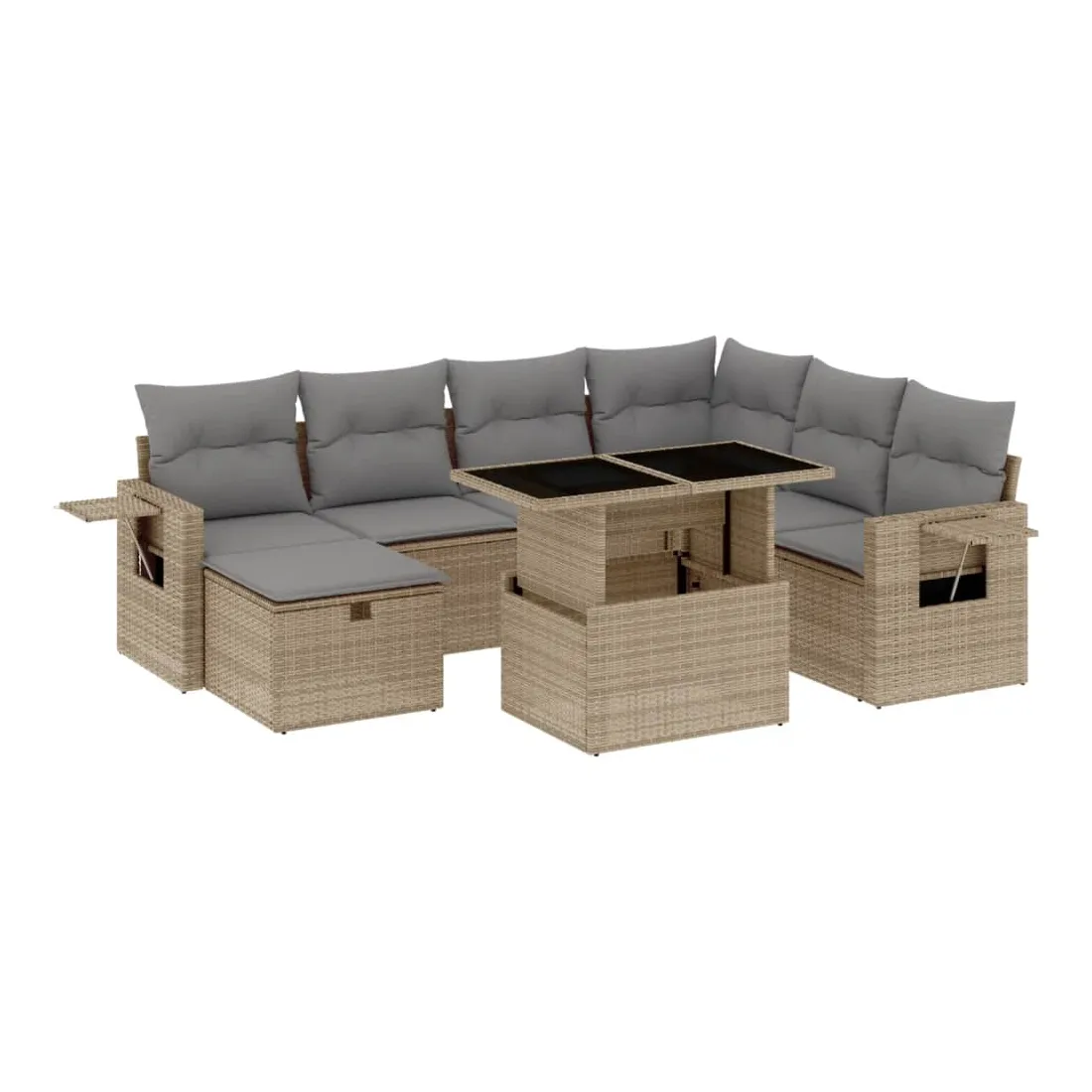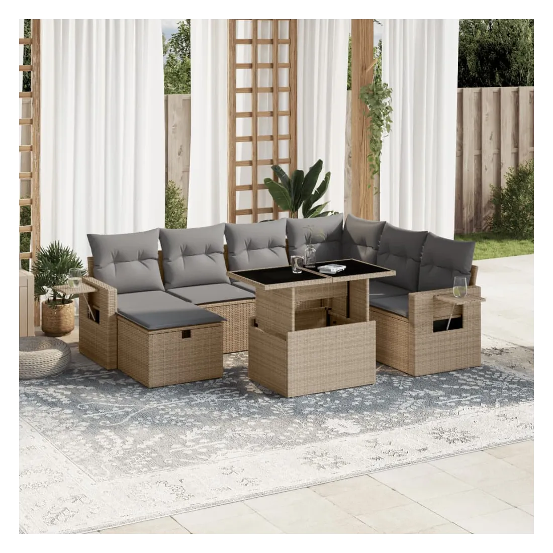Cet ensemble de canapés de jardin est le complément parfait de votre arrière-cour, terrasse ou patio, offrant un espace confortable et accueillant pour discuter avec la famille et les amis ou simplement se détendre et profiter de l'extérieur. Matériau durable : la résine tressée, également connue sous le nom de poly rotin, est un matériau synthétique solide et nécessitant peu d'entretien qui ressemble au rotin naturel. Il est léger, facile à nettoyer et couramment utilisé pour les meubles d'extérieur en raison de sa durabilité et de ses propriétés de résistance aux intempéries.Dessus de table réglable : le dessus de table peut être soulevé pour rendre la table plus haute, ce qui transforme la table d'extérieur d'une table basse à une table de salle à manger. Elle est parfaite pour recevoir des invités ou prendre des repas à l'extérieur.Housse amovible et lavable : ces coussins de siège sont dotés de housses amovibles pour un lavage et un entretien faciles.Conception modulaire : cet ensemble de meubles d'extérieur a une conception modulaire, ce qui le rend complètement flexible et facile à déplacer, afin que vous puissiez créer un agencement de meubles d'extérieur personnalisé. Bon à savoir :Pour que vos meubles d'extérieur restent beaux, nous vous recommandons de les protéger avec une housse imperméable.