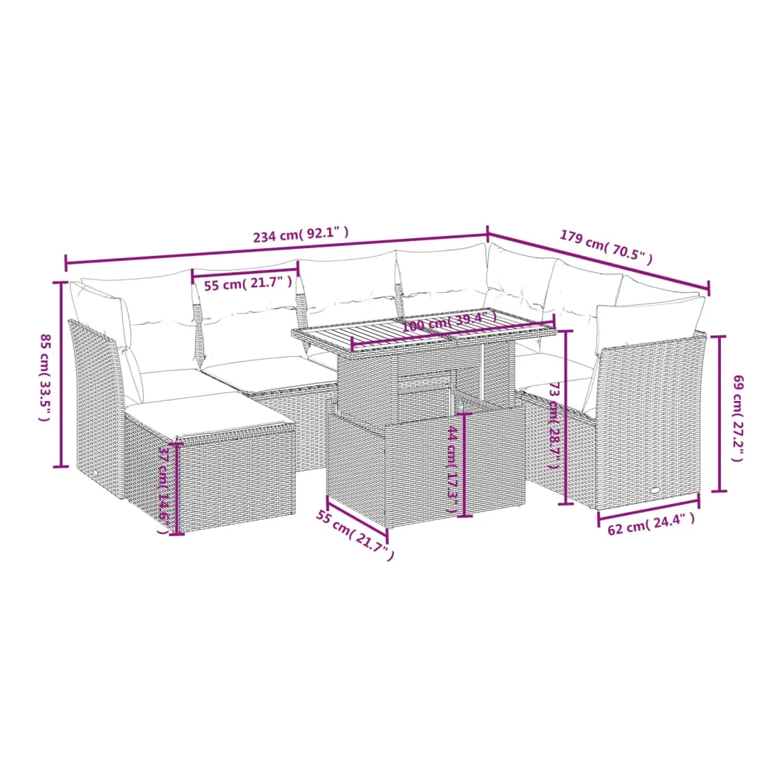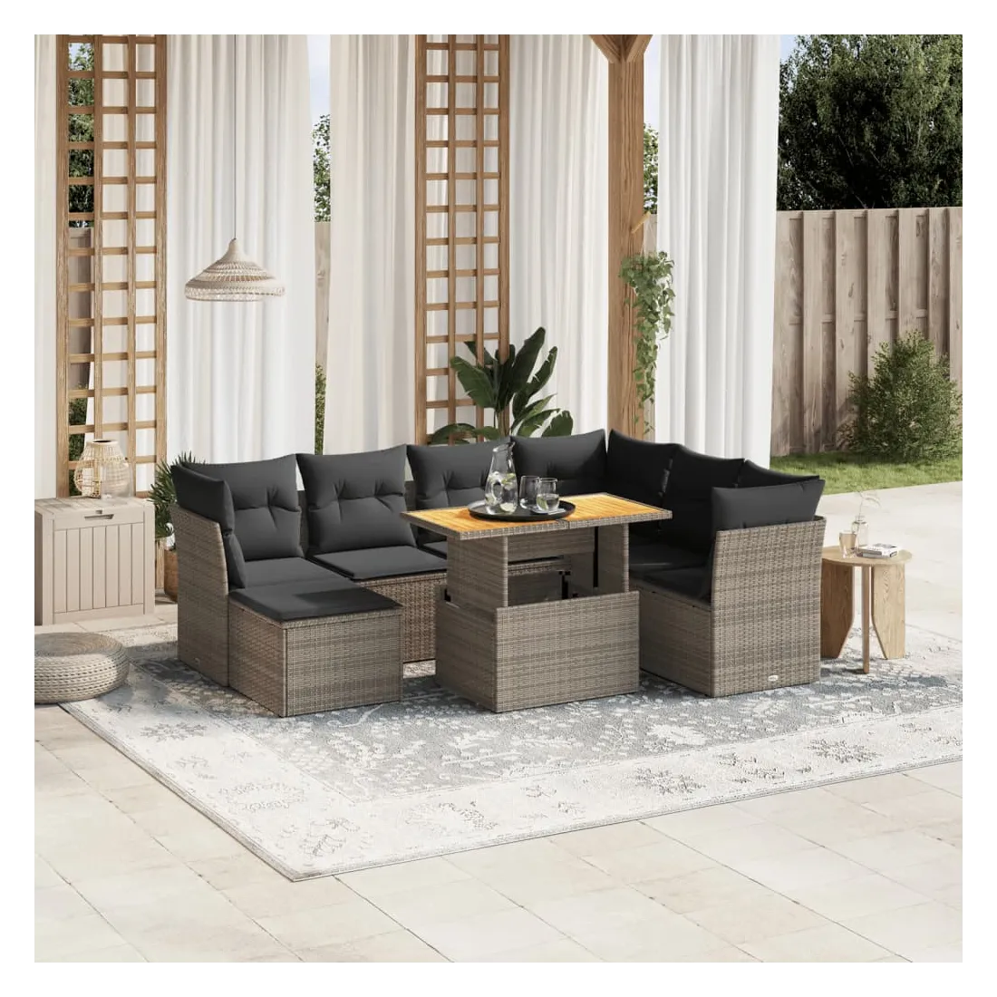 Cet ensemble de canapés de jardin est le complément parfait de votre arrière-cour, terrasse ou patio, offrant un espace confortable et accueillant pour discuter avec la famille et les amis ou simplement se détendre et profiter de l'extérieur. Matériau durable : la résine tressée, également connue sous le nom de poly rotin, est un matériau synthétique solide et nécessitant peu d'entretien qui ressemble au rotin naturel. Il est léger, facile à nettoyer et couramment utilisé pour les meubles d'extérieur en raison de sa durabilité et de ses propriétés de résistance aux intempéries.Dessus de table réglable : le dessus de table peut être soulevé pour rendre la table plus haute, ce qui transforme la table d'extérieur d'une table basse à une table de salle à manger. Elle est parfaite pour recevoir des invités ou prendre des repas à l'extérieur.Housse amovible et lavable : ces coussins de siège sont dotés de housses amovibles pour un lavage et un entretien faciles.Conception modulaire : cet ensemble de meubles d'extérieur a une conception modulaire, ce qui le rend complètement flexible et facile à déplacer, afin que vous puissiez créer un agencement de meubles d'extérieur personnalisé. Bon à savoir :Pour que vos meubles d'extérieur restent beaux, nous vous recommandons de les protéger avec une housse imperméable.