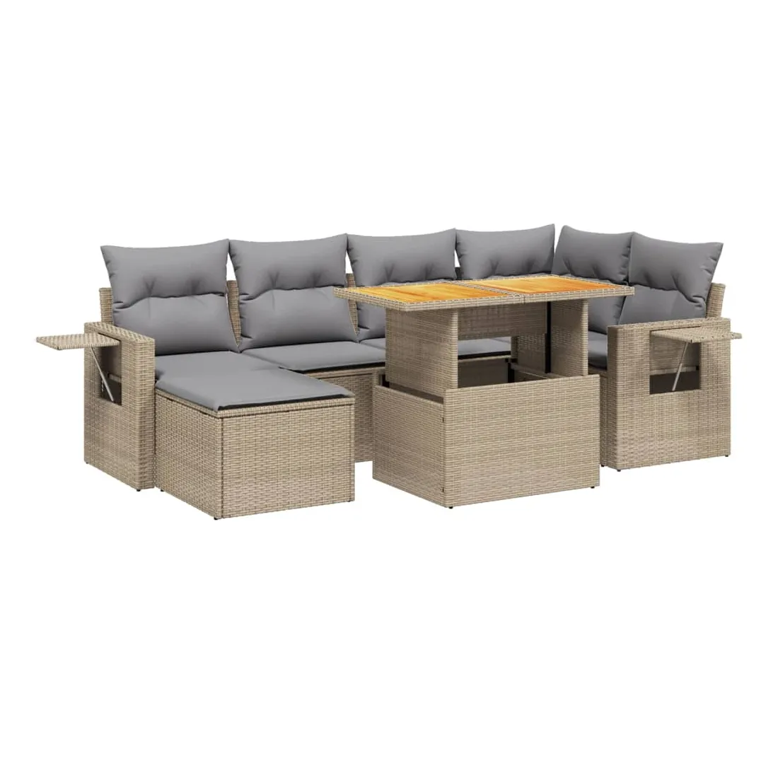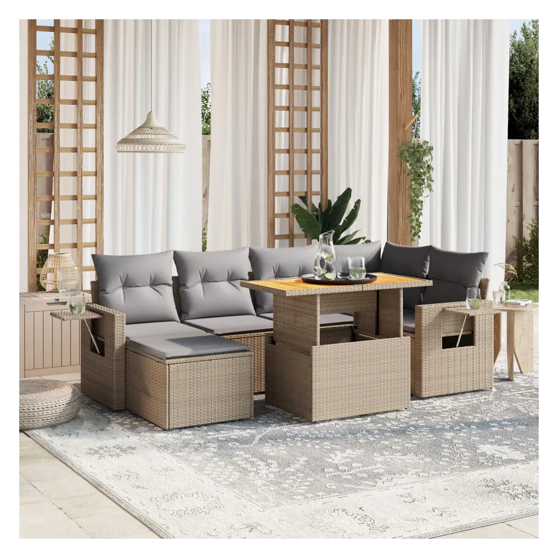 Cet ensemble de canapés de jardin est le complément parfait de votre arrière-cour, terrasse ou patio, offrant un espace confortable et accueillant pour discuter avec la famille et les amis ou simplement se détendre et profiter de l'extérieur. Matériau durable : la résine tressée, également connue sous le nom de poly rotin, est un matériau synthétique solide et nécessitant peu d'entretien qui ressemble au rotin naturel. Il est léger, facile à nettoyer et couramment utilisé pour les meubles d'extérieur en raison de sa durabilité et de ses propriétés de résistance aux intempéries.Dessus de table réglable : le dessus de table peut être soulevé pour rendre la table plus haute, ce qui transforme la table d'extérieur d'une table basse à une table de salle à manger. Elle est parfaite pour recevoir des invités ou prendre des repas à l'extérieur.Table d'appoint pratique : ce mobilier d'extérieur comprend une table d'appoint pliable avec un ressort à gaz sur les accoudoirs, offrant un endroit pratique pour garder vos essentiels à portée de main.Housse amovible et lavable : ces coussins de siège sont dotés de housses amovibles pour un lavage et un entretien faciles.Conception modulaire : cet ensemble de meubles d'extérieur a une conception modulaire, ce qui le rend complètement flexible et facile à déplacer, afin que vous puissiez créer un agencement de meubles d'extérieur personnalisé. Bon à savoir :Pour que vos meubles d'extérieur restent beaux, nous vous recommandons de les protéger avec une housse imperméable.