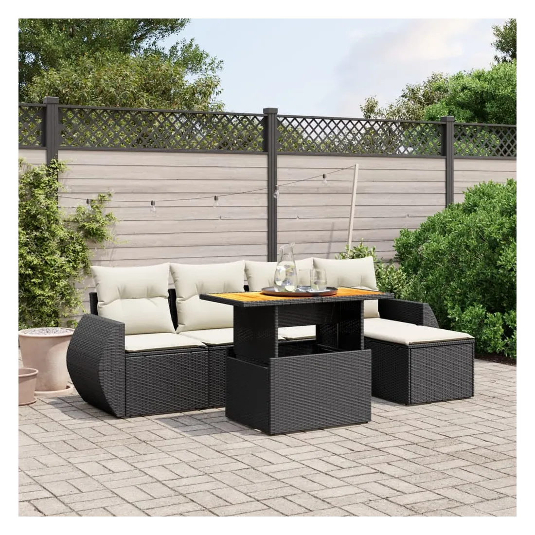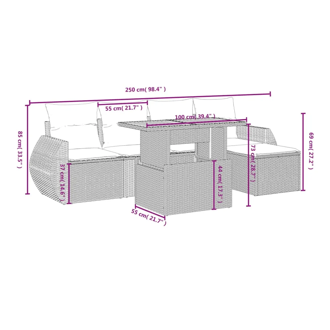 Cet ensemble de canapés de jardin est le complément parfait de votre arrière-cour, terrasse ou patio, offrant un espace confortable et accueillant pour discuter avec la famille et les amis ou simplement se détendre et profiter de l'extérieur. Matériau durable : la résine tressée, également connue sous le nom de poly rotin, est un matériau synthétique solide et nécessitant peu d'entretien qui ressemble au rotin naturel. Il est léger, facile à nettoyer et couramment utilisé pour les meubles d'extérieur en raison de sa durabilité et de ses propriétés de résistance aux intempéries.Dessus de table réglable : le dessus de table peut être soulevé pour rendre la table plus haute, ce qui transforme la table d'extérieur d'une table basse à une table de salle à manger. Elle est parfaite pour recevoir des invités ou prendre des repas à l'extérieur.Housse amovible et lavable : ces coussins de siège sont dotés de housses amovibles pour un lavage et un entretien faciles.Conception modulaire : cet ensemble de meubles d'extérieur a une conception modulaire, ce qui le rend complètement flexible et facile à déplacer, afin que vous puissiez créer un agencement de meubles d'extérieur personnalisé. Bon à savoir :Pour que vos meubles d'extérieur restent beaux, nous vous recommandons de les protéger avec une housse imperméable.