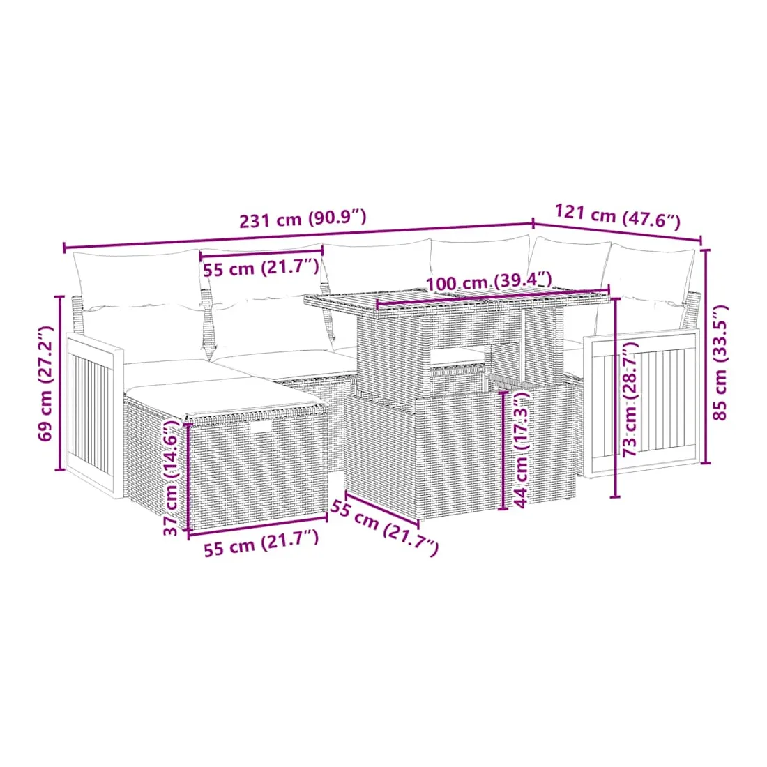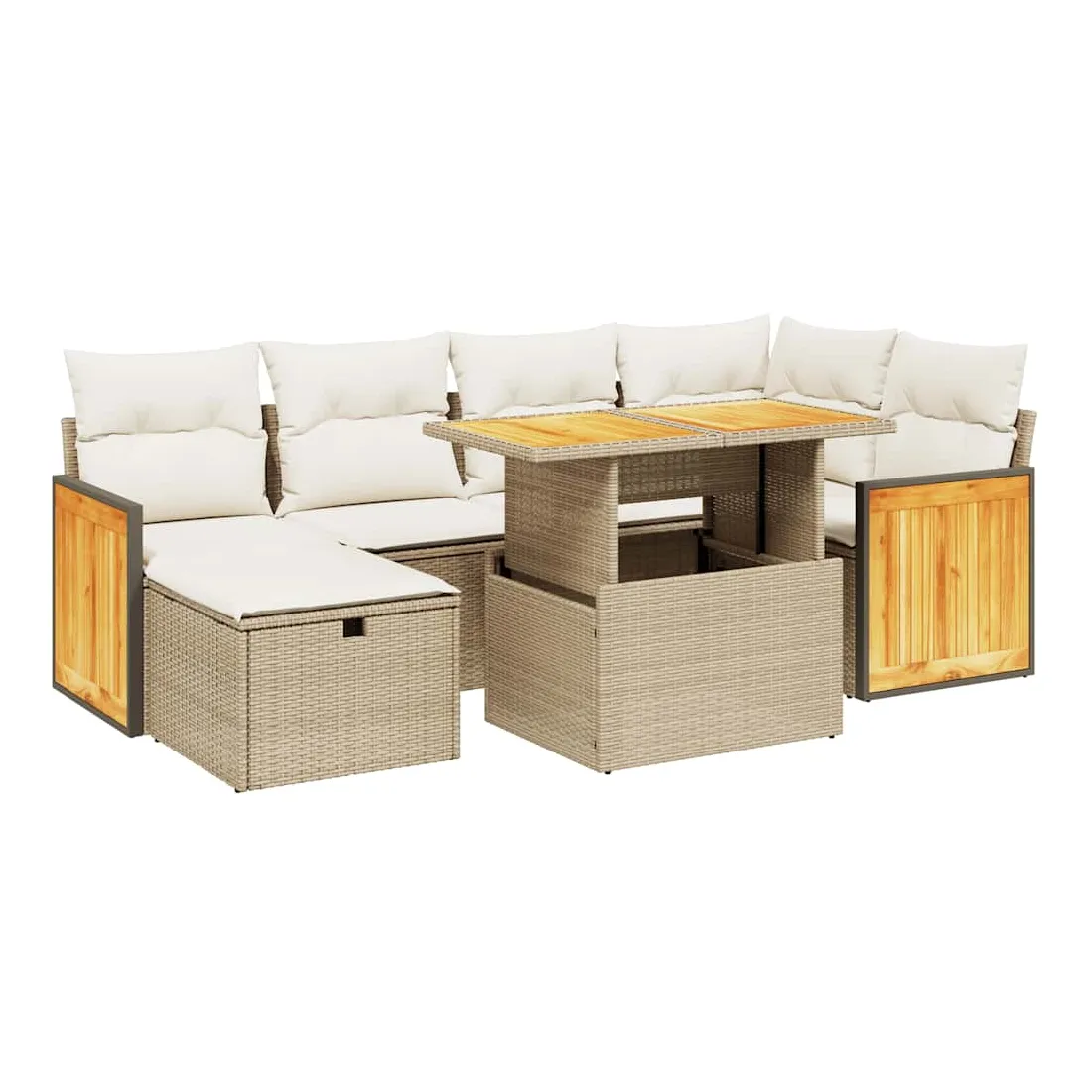 Cet ensemble de canapés de jardin est le complément parfait de votre arrière-cour, terrasse ou patio, offrant un espace confortable et accueillant pour discuter avec la famille et les amis ou simplement se détendre et profiter de l'extérieur. Matériau durable : la résine tressée, également connue sous le nom de poly rotin, est un matériau synthétique solide et nécessitant peu d'entretien qui ressemble au rotin naturel. Il est léger, facile à nettoyer et couramment utilisé pour les meubles d'extérieur en raison de sa durabilité et de ses propriétés de résistance aux intempéries.Dessus de table réglable : le dessus de table peut être soulevé pour rendre la table plus haute, ce qui transforme la table d'extérieur d'une table basse à une table de salle à manger. Elle est parfaite pour recevoir des invités ou prendre des repas à l'extérieur.Housse amovible et lavable : ces coussins de siège sont dotés de housses amovibles pour un lavage et un entretien faciles.Conception modulaire : cet ensemble de meubles d'extérieur a une conception modulaire, ce qui le rend complètement flexible et facile à déplacer, afin que vous puissiez créer un agencement de meubles d'extérieur personnalisé. Bon à savoir :Pour que vos meubles d'extérieur restent beaux, nous vous recommandons de les protéger avec une housse imperméable.