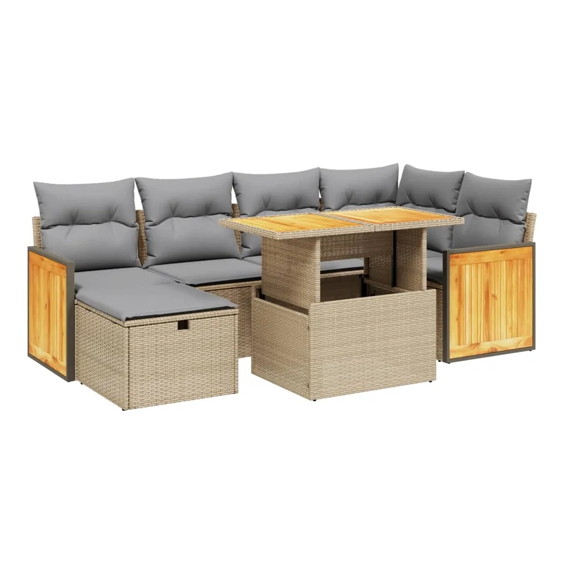 Cet ensemble de canapés de jardin est le complément parfait de votre arrière-cour, terrasse ou patio, offrant un espace confortable et accueillant pour discuter avec la famille et les amis ou simplement se détendre et profiter de l'extérieur. Matériau durable : la résine tressée, également connue sous le nom de poly rotin, est un matériau synthétique solide et nécessitant peu d'entretien qui ressemble au rotin naturel. Il est léger, facile à nettoyer et couramment utilisé pour les meubles d'extérieur en raison de sa durabilité et de ses propriétés de résistance aux intempéries.Dessus de table réglable : le dessus de table peut être soulevé pour rendre la table plus haute, ce qui transforme la table d'extérieur d'une table basse à une table de salle à manger. Elle est parfaite pour recevoir des invités ou prendre des repas à l'extérieur.Housse amovible et lavable : ces coussins de siège sont dotés de housses amovibles pour un lavage et un entretien faciles.Conception modulaire : cet ensemble de meubles d'extérieur a une conception modulaire, ce qui le rend complètement flexible et facile à déplacer, afin que vous puissiez créer un agencement de meubles d'extérieur personnalisé. Bon à savoir :Pour que vos meubles d'extérieur restent beaux, nous vous recommandons de les protéger avec une housse imperméable.