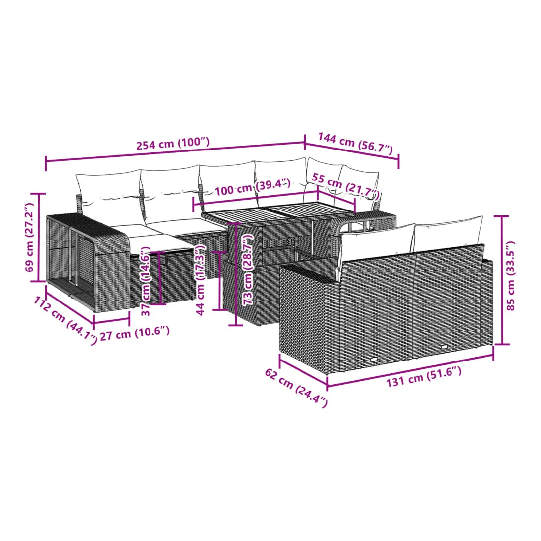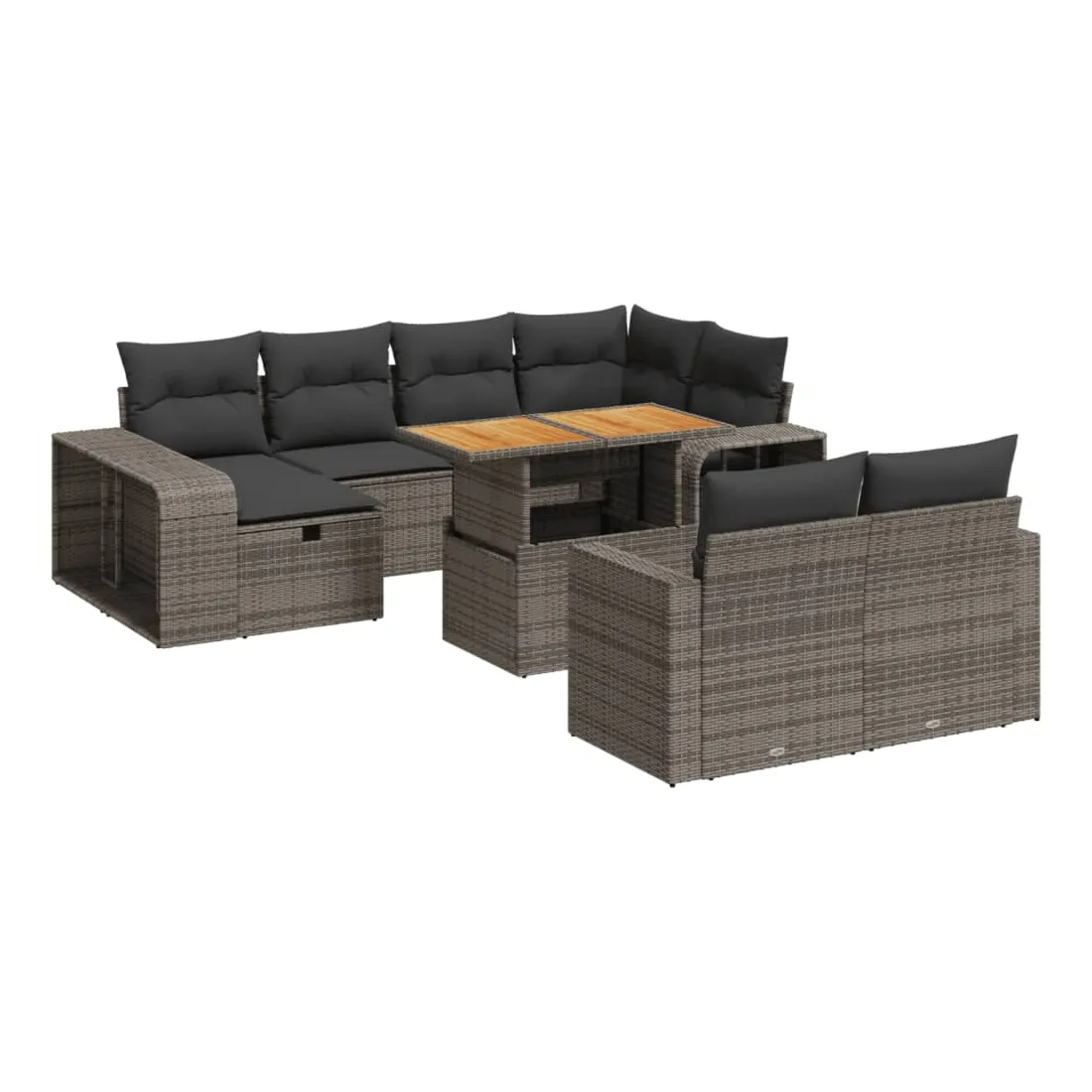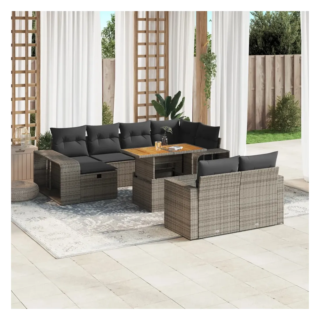 Cet ensemble de canapés de jardin est le complément parfait de votre arrière-cour, terrasse ou patio, offrant un espace confortable et accueillant pour discuter avec la famille et les amis ou simplement se détendre et profiter de l'extérieur. Matériau durable : la résine tressée, également connue sous le nom de poly rotin, est un matériau synthétique solide et nécessitant peu d'entretien qui ressemble au rotin naturel. Il est léger, facile à nettoyer et couramment utilisé pour les meubles d'extérieur en raison de sa durabilité et de ses propriétés de résistance aux intempéries.Dessus de table réglable : le dessus de table peut être soulevé pour rendre la table plus haute, ce qui transforme la table d'extérieur d'une table basse à une table de salle à manger. Elle est parfaite pour recevoir des invités ou prendre des repas à l'extérieur.Grand espace de rangement : avec un espace de rangement intégré, ce meuble d'extérieur offre un grand espace de rangement pour garder vos objets essentiels organisés et facilement accessibles.Housse amovible et lavable : ces coussins de siège sont dotés de housses amovibles pour un lavage et un entretien faciles.Conception modulaire : cet ensemble de meubles d'extérieur a une conception modulaire, ce qui le rend complètement flexible et facile à déplacer, afin que vous puissiez créer un agencement de meubles d'extérieur personnalisé. Bon à savoir :Pour que vos meubles d'extérieur restent beaux, nous vous recommandons de les protéger avec une housse imperméable.