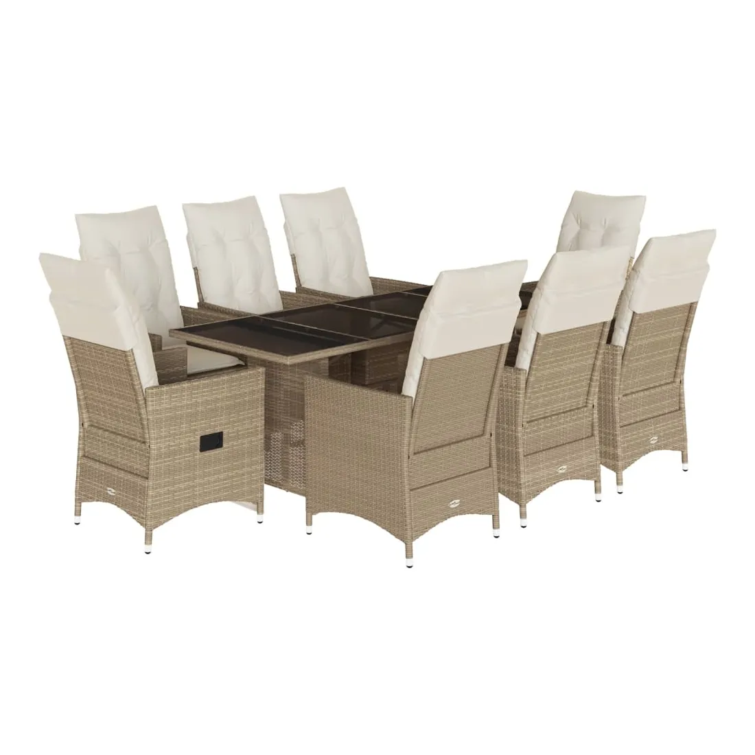 Cet ensemble de salle à manger de jardin est un excellent choix pour les repas en plein air ou simplement pour se détendre dans le jardin, la cour arrière ou sur la terrasse. Matériau durable : le rotin PE, également appelé polyrotin, est un matériau synthétique solide et facile d'entretien qui ressemble au rotin naturel. Il est léger, facile à nettoyer et couramment utilisé pour les meubles d'extérieur en raison de sa durabilité et de sa résistance aux intempéries. Dossier réglable : ce siège de jardin est équipé d'une poignée. Vous pouvez régler le dossier dans n'importe quelle position en tirant sur la poignée, puis le remettre rapidement dans sa position d'origine. Plateau en verre : le plateau de la table d'extérieur est en verre trempé solide et durable, ce qui le rend facile à nettoyer avec un chiffon humide et ajoute une touche d'élégance à votre espace extérieur. Assise confortable : cet ensemble de mobilier d'extérieur, doté de coussins épais et rembourrés, offre une assise confortable. Housse amovible et lavable : ces coussins d'assise sont dotés de housses amovibles pour faciliter le lavage et l'entretien. Les coussins de dossier sont munis d'un rabat à l'arrière pour faciliter leur fixation aux dossiers. Bon à savoir :Pour que votre mobilier d'extérieur reste beau, nous vous recommandons de le protéger avec une housse imperméable.