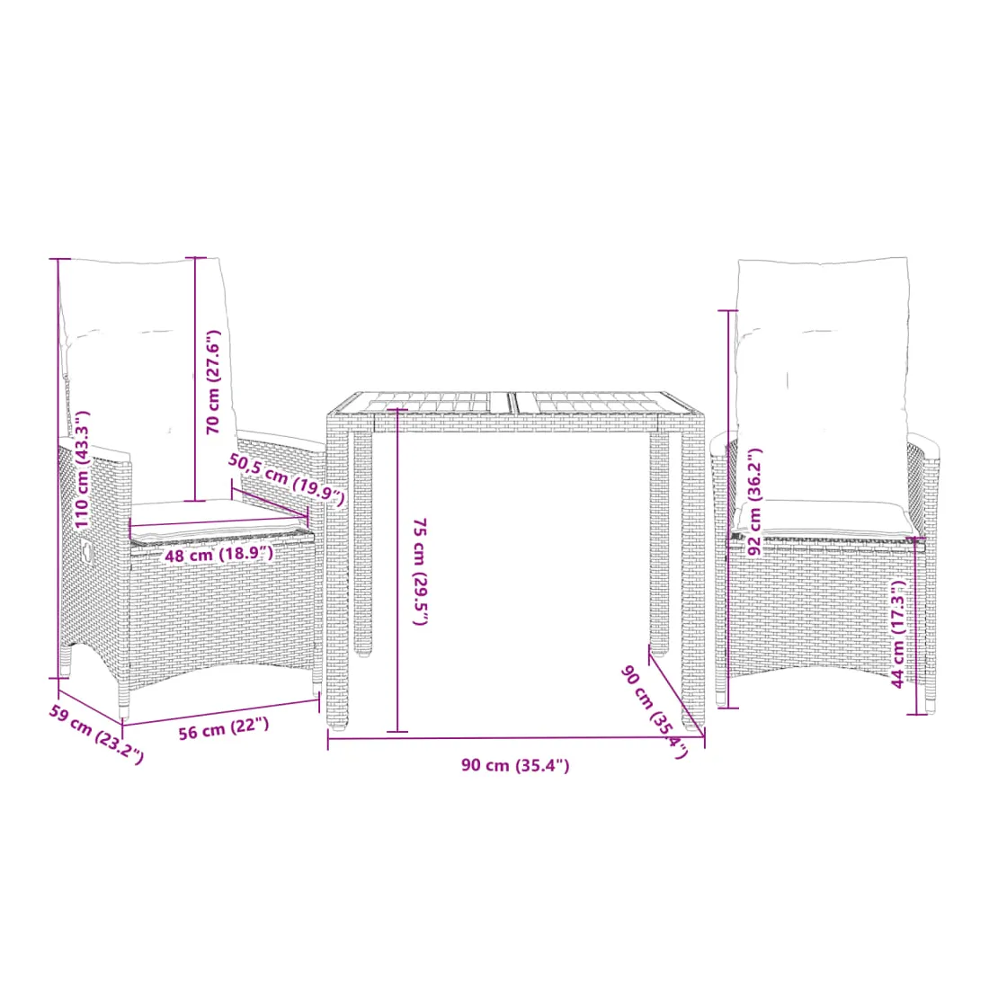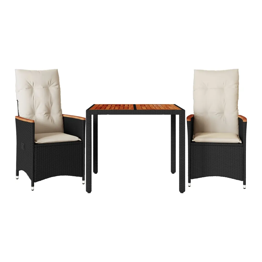 Savourez un café ou discutez avec votre famille et vos amis dans le jardin, l'arrière-cour ou sur le balcon avec cet ensemble de bistro confortable ! Matériau durable : la résine tressée, également connue sous le nom de poly rotin, est un matériau synthétique solide et nécessitant peu d'entretien qui ressemble au rotin naturel. Il est léger, facile à nettoyer et couramment utilisé pour les meubles d'extérieur en raison de sa durabilité et de ses propriétés de résistance aux intempéries.Dossier réglable : ce siège de jardin est doté d'une poignée. Vous pouvez régler le dossier dans n'importe quelle position en tirant sur la poignée et le remettre rapidement dans sa position initiale.Dessus stable et facile à nettoyer : cette table de jardin a un dessus en bois d'acacia robuste, durable et facile à nettoyer avec un chiffon humide.Expérience d'assise confortable : cet ensemble de meubles d'extérieur, doté de coussins épais, offre une expérience d'assise confortable.Housse amovible et lavable : ces coussins de siège sont dotés de housses amovibles pour un lavage et un entretien faciles. Les coussins de dossier ont un rabat à l'arrière pour une fixation facile aux dossiers. Bon à savoir :Pour que vos meubles d'extérieur restent beaux, nous vous recommandons de les protéger avec une housse imperméable.
