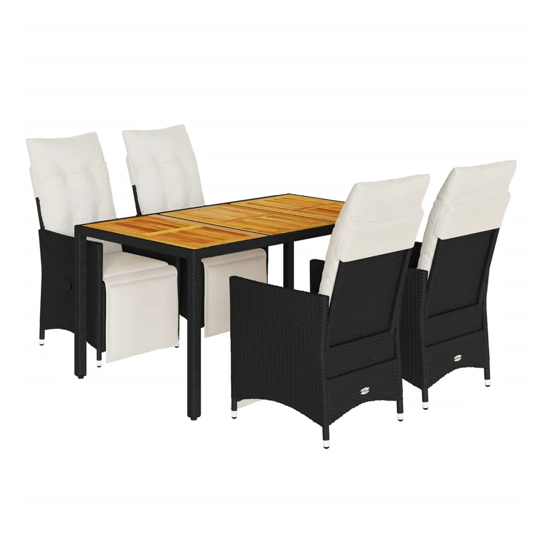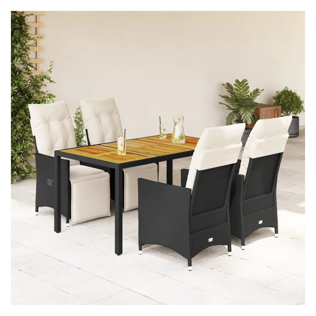 Cet ensemble de salle à manger de jardin est un excellent choix pour les repas en plein air ou pour vous détendre dans le jardin, dans l'arrière-cour ou sur la terrasse. Matériau durable : la résine tressée, également connue sous le nom de poly rotin, est un matériau synthétique solide et nécessitant peu d'entretien qui ressemble au rotin naturel. Il est léger, facile à nettoyer et couramment utilisé pour les meubles d'extérieur en raison de sa durabilité et de ses propriétés de résistance aux intempéries.Dossier et repose-pied réglables : ce siège de jardin est doté d'une poignée. Vous pouvez régler le dossier et le repose-pied dans n'importe quelle position en tirant sur la poignée, et les remettre rapidement dans leur position initiale.Dessus stable et facile à nettoyer : cette table de jardin a un dessus en bois d'acacia robuste, durable et facile à nettoyer avec un chiffon humide.Expérience d'assise confortable : cet ensemble de meubles d'extérieur, doté de coussins épais, offre une expérience d'assise confortable.Housse amovible et lavable : ces coussins de siège sont dotés de housses amovibles pour un lavage et un entretien faciles. Les coussins de dossier ont un rabat à l'arrière pour une fixation facile aux dossiers. Bon à savoir :Pour que vos meubles d'extérieur restent beaux, nous vous recommandons de les protéger avec une housse imperméable.