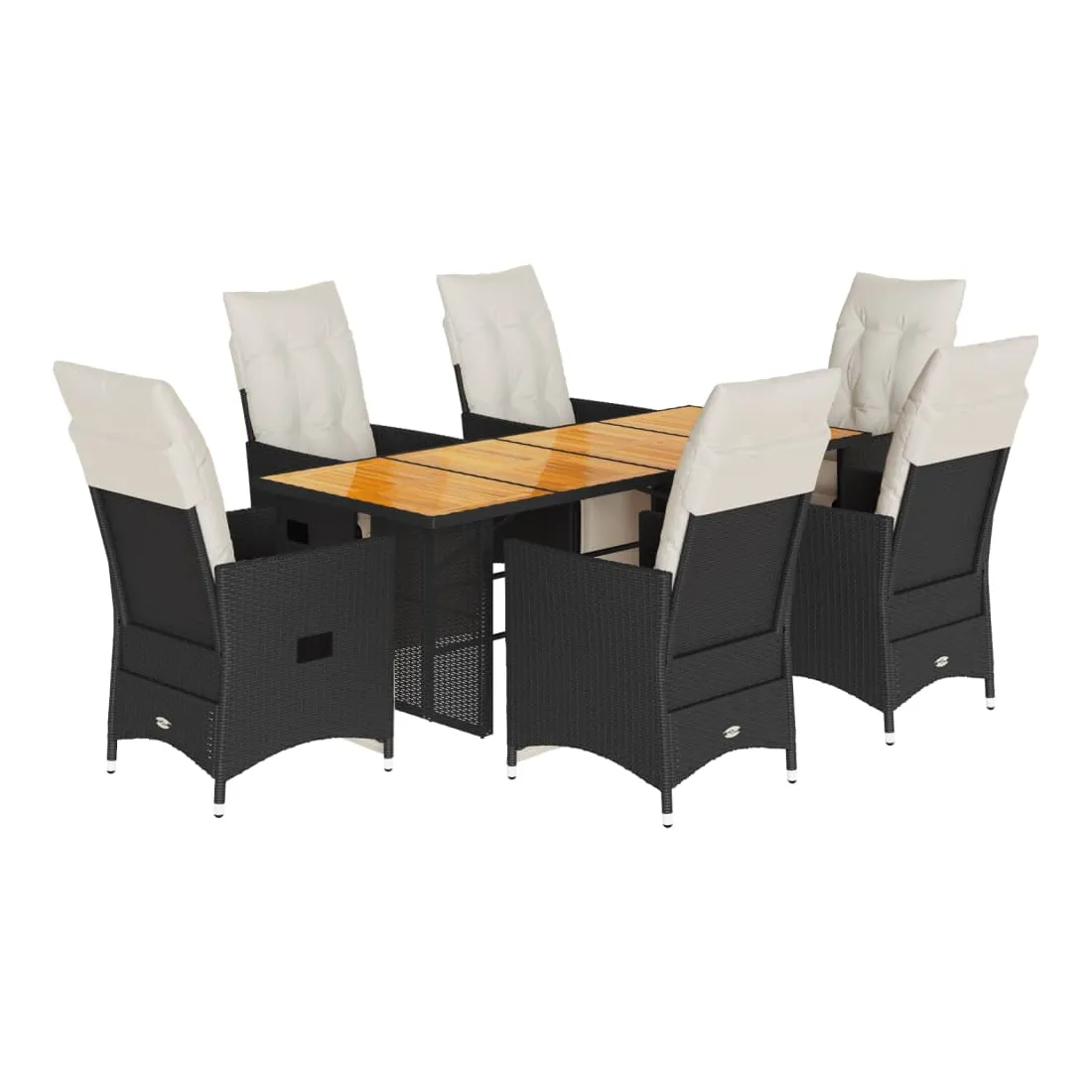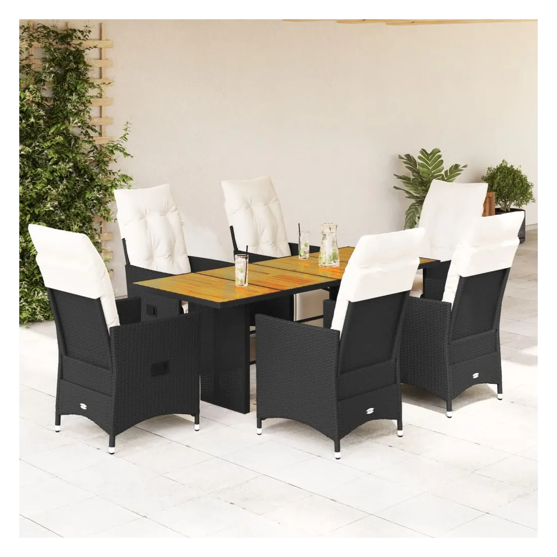 Cet ensemble de salle à manger de jardin est un excellent choix pour les repas en plein air ou pour vous détendre dans le jardin, dans l'arrière-cour ou sur la terrasse. Matériau durable : la résine tressée, également connue sous le nom de poly rotin, est un matériau synthétique solide et nécessitant peu d'entretien qui ressemble au rotin naturel. Elle est légère, facile à nettoyer et couramment utilisée pour les meubles d'extérieur en raison de sa durabilité et de ses propriétés de résistance aux intempéries.Dossier et repose-pied réglables : ce siège de jardin est doté d'une poignée. Vous pouvez régler le dossier et le repose-pied dans n'importe quelle position en tirant sur la poignée, et les remettre rapidement dans leur position initiale.Dessus stable et facile à nettoyer : cette table de jardin a un dessus en bois d'acacia robuste, durable et facile à nettoyer avec un chiffon humide.Expérience d'assise confortable : cet ensemble de meubles d'extérieur, doté de coussins épais, offre une expérience d'assise confortable.Housse amovible et lavable : ces coussins de siège sont dotés de housses amovibles pour un lavage et un entretien faciles. Les coussins de dossier ont un rabat à l'arrière pour une fixation facile aux dossiers. Bon à savoir :Pour que vos meubles d'extérieur restent beaux, nous vous recommandons de les protéger avec une housse imperméable.