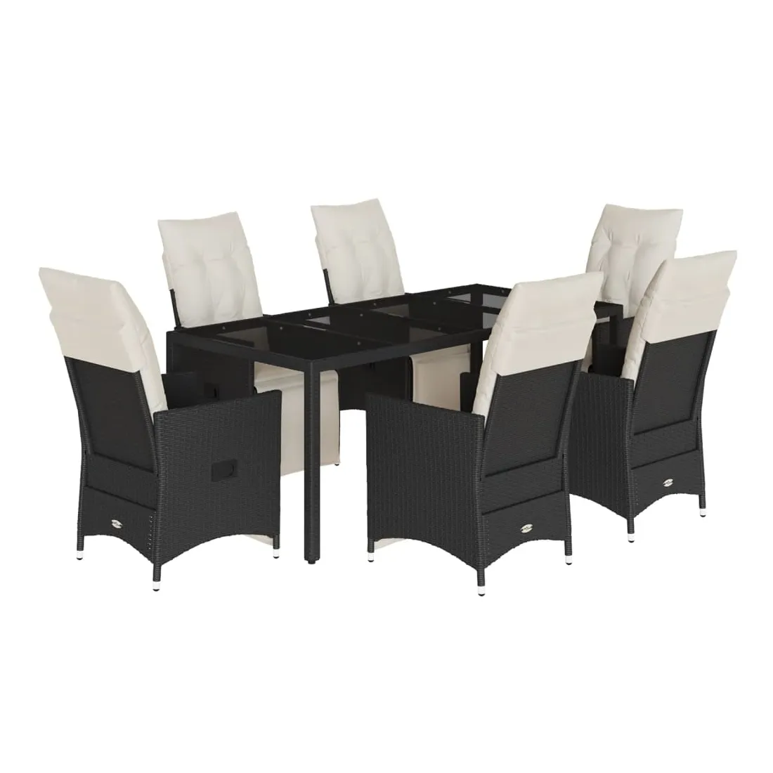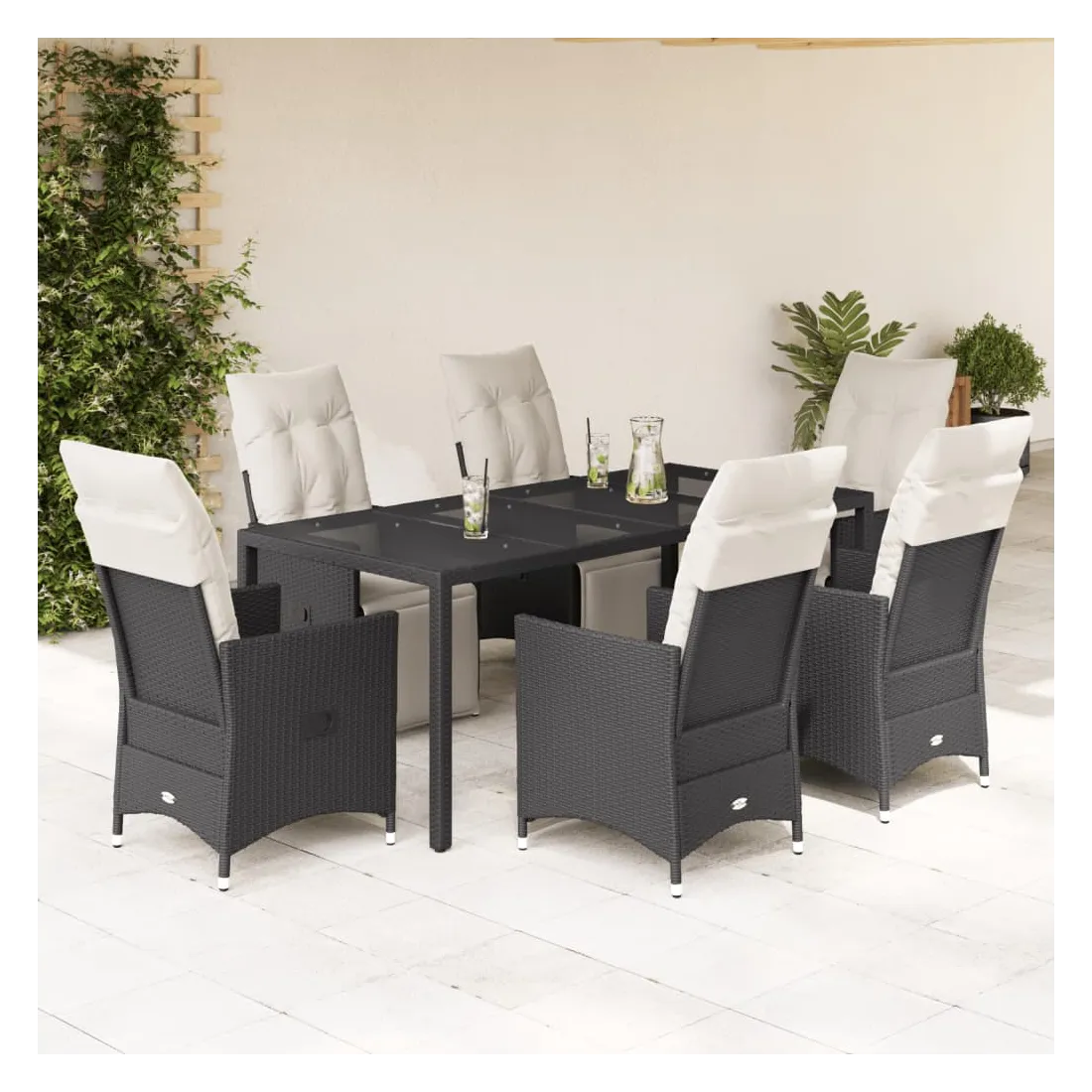 Cet ensemble de salle à manger de jardin est un excellent choix pour les repas en plein air ou pour vous détendre dans le jardin, dans l'arrière-cour ou sur la terrasse. Matériau durable : la résine tressée, également connue sous le nom de poly rotin, est un matériau synthétique solide et nécessitant peu d'entretien qui ressemble au rotin naturel. Il est léger, facile à nettoyer et couramment utilisé pour les meubles d'extérieur en raison de sa durabilité et de ses propriétés de résistance aux intempéries.Dossier et repose-pied réglables : ce siège de jardin est doté d'une poignée. Vous pouvez régler le dossier et le repose-pied dans n'importe quelle position en tirant sur la poignée, et les remettre rapidement dans leur position initiale.Dessus en verre : le dessus de la table d'extérieur est fabriqué en verre trempé solide et durable, ce qui le rend facile à nettoyer avec un chiffon humide et ajoute une touche d'élégance à votre espace extérieur.Expérience d'assise confortable : cet ensemble de meubles d'extérieur, doté de coussins épais, offre une expérience d'assise confortable.Housse amovible et lavable : ces coussins de siège sont dotés de housses amovibles pour un lavage et un entretien faciles. Les coussins de dossier ont un rabat à l'arrière pour une fixation facile aux dossiers. Bon à savoir :Pour que vos meubles d'extérieur restent beaux, nous vous recommandons de les protéger avec une housse imperméable.