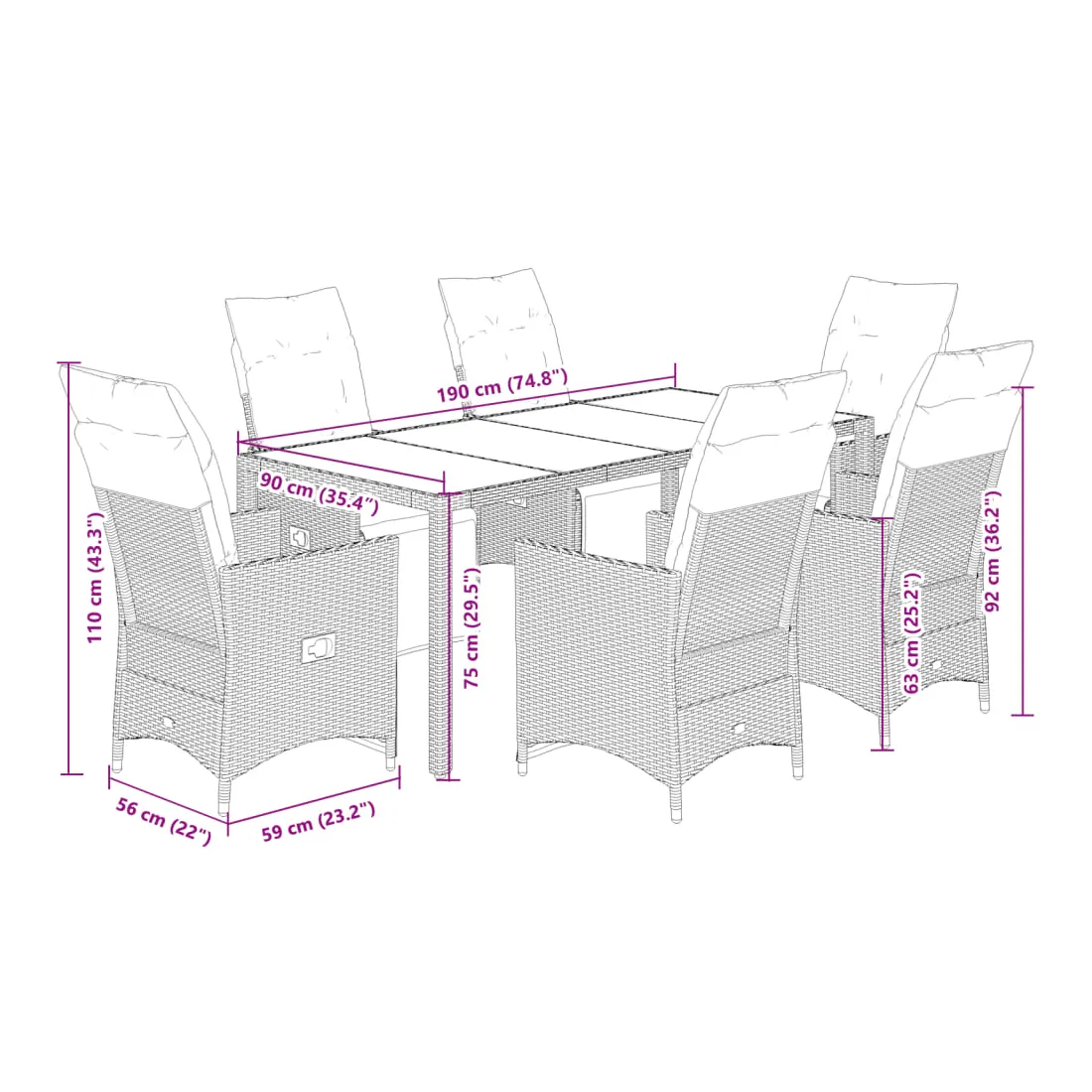 - 6 x coussin de siège avec housse amovible et lavable
