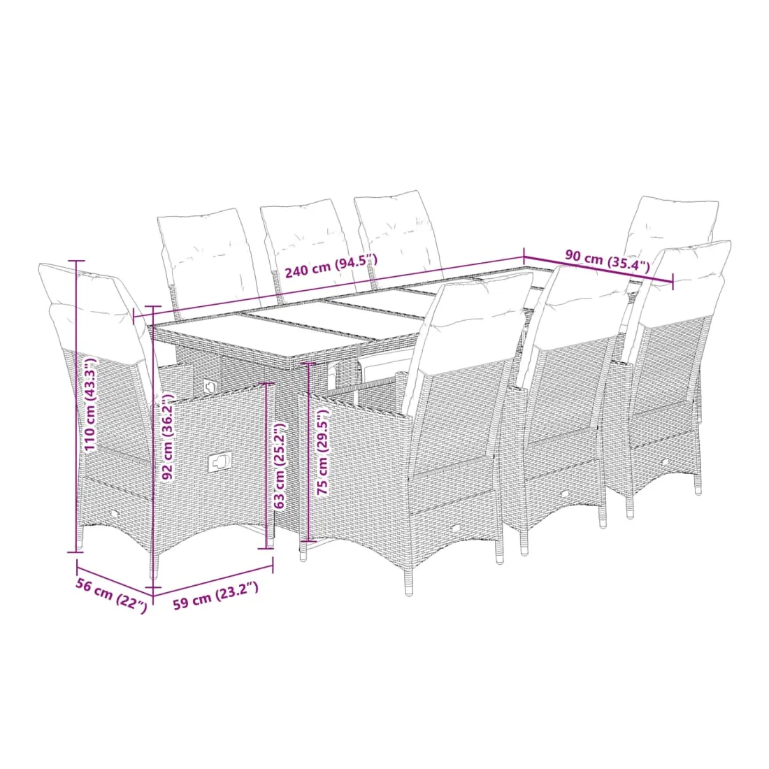 - Dimensions : 240 x 90 x 75 cm (L x l x H)