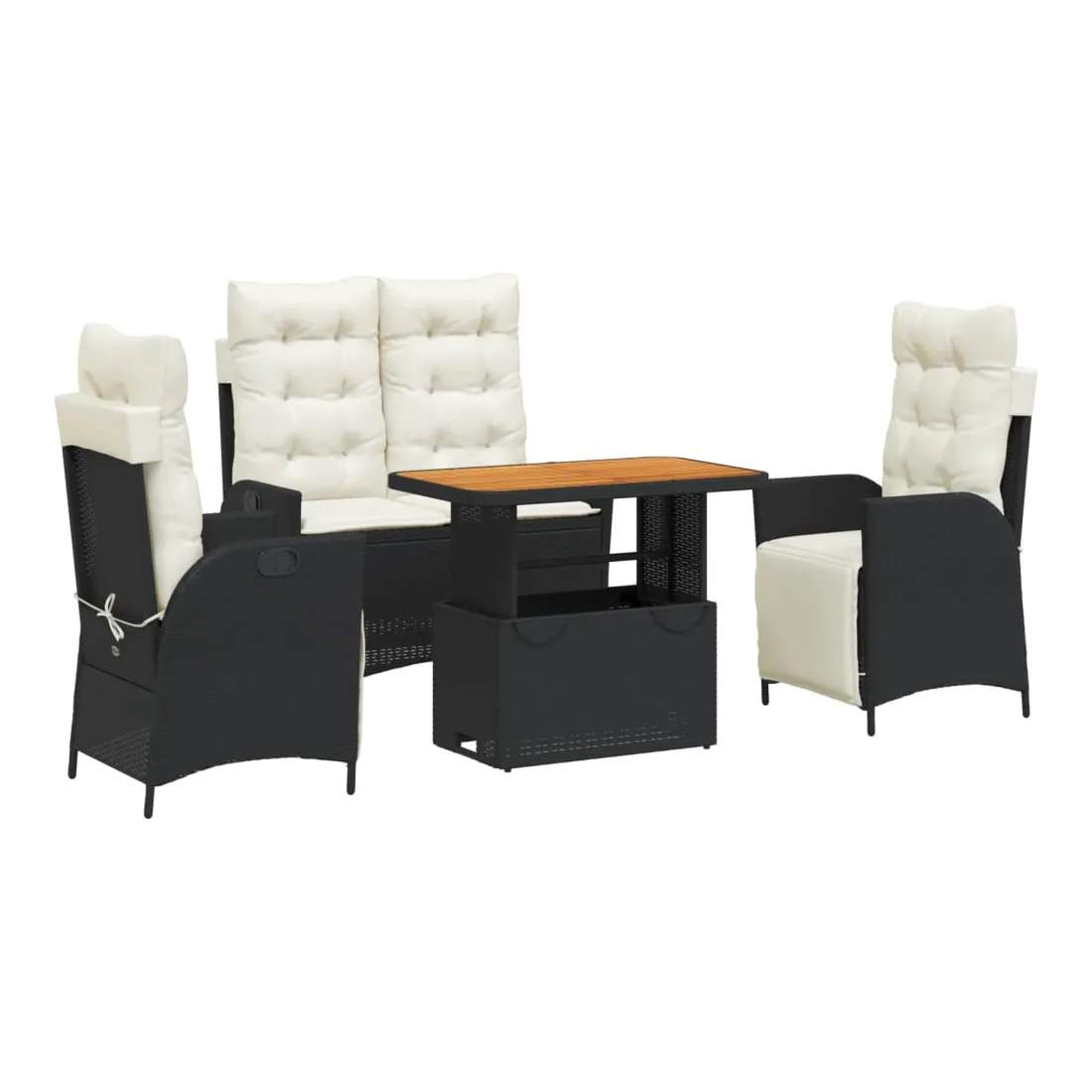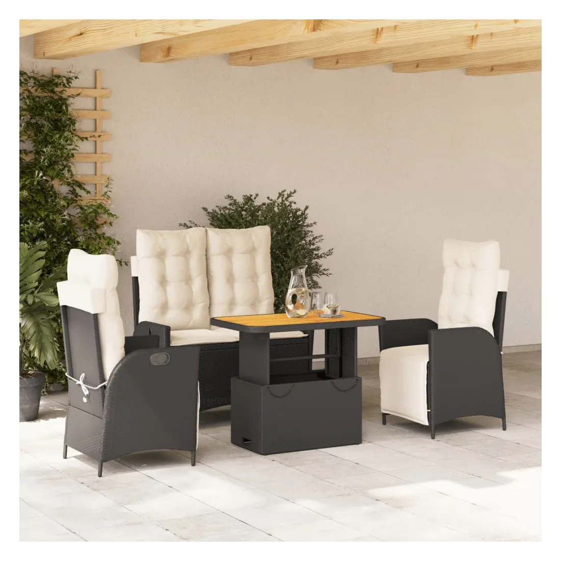 Cet ensemble de salle à manger de jardin est un excellent choix pour les repas en plein air ou simplement pour se détendre dans le jardin, la cour arrière ou sur la terrasse. Matériau durable : le rotin PE, également connu sous le nom de polyrotin, est un matériau synthétique solide et facile d'entretien qui ressemble au rotin naturel. Il est léger, facile à nettoyer et couramment utilisé pour les meubles d'extérieur en raison de sa durabilité et de ses propriétés de résistance aux intempéries. Dossier réglable : ce siège de jardin est équipé d'une poignée. Vous pouvez régler le dossier dans n'importe quelle position en tirant sur la poignée, puis le remettre rapidement dans sa position d'origine. Plateau réglable : le plateau peut être relevé pour rehausser la table, ce qui transforme la table d'extérieur en table basse ou en table à manger. Elle est parfaite pour recevoir des invités ou prendre des repas à l'extérieur. Housse amovible et lavable : ces coussins d'assise sont dotés de housses amovibles pour faciliter le lavage et l'entretien. Les coussins de dossier sont munis d'un rabat à l'arrière pour faciliter leur fixation aux dossiers. Assise confortable : Ce mobilier d'extérieur, doté de coussins épais et rembourrés, offre une assise confortable. Bon à savoir :Pour que votre mobilier d'extérieur reste beau, nous vous recommandons de le protéger avec une housse imperméable.