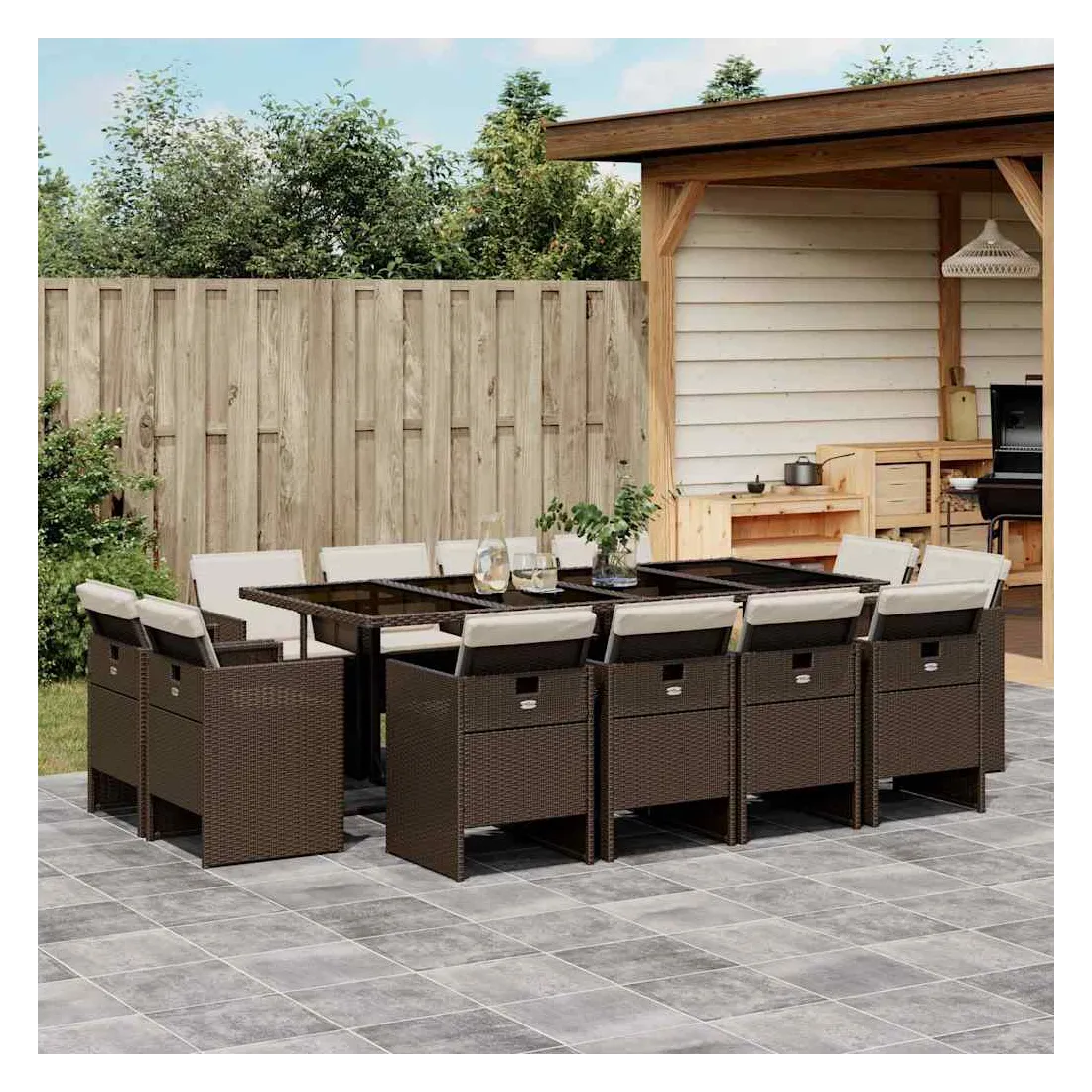 Cet ensemble de salle à manger de jardin est un excellent choix pour les repas en plein air ou pour vous détendre dans le jardin, dans l'arrière-cour ou sur la terrasse. Matériau durable : la résine tressée, également connue sous le nom de poly rotin, est un matériau synthétique solide et nécessitant peu d'entretien qui ressemble au rotin naturel. Il est léger, facile à nettoyer et couramment utilisé pour les meubles d'extérieur en raison de sa durabilité et de ses propriétés de résistance aux intempéries.Rangement compact : ces chaises sont dotées d'un dossier rabattable, ce qui permet de les ranger facilement sous la table. Une fois pliées, elles se rangent parfaitement sous la table, formant un cube peu encombrant. Expérience d'assise confortable : ce mobilier d'extérieur, doté de coussins épais, offre une expérience d'assise confortable.Housse amovible et lavable : ces coussins de siège sont dotés de housses amovibles pour un lavage et un entretien faciles.Dessus en verre : le dessus de la table d'extérieur est fabriqué en verre trempé solide et durable, ce qui le rend facile à nettoyer avec un chiffon humide et ajoute une touche d'élégance à votre espace extérieur. Bon à savoir : Pour que vos meubles d'extérieur restent beaux, nous vous recommandons de les protéger avec une housse imperméable.