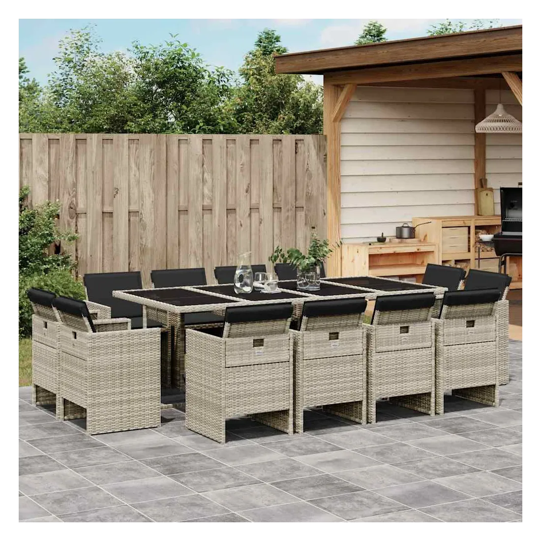 Cet ensemble de salle à manger de jardin est un excellent choix pour les repas en plein air ou pour vous détendre dans le jardin, dans l'arrière-cour ou sur la terrasse. Matériau durable : la résine tressée, également connue sous le nom de poly rotin, est un matériau synthétique solide et nécessitant peu d'entretien qui ressemble au rotin naturel. Il est léger, facile à nettoyer et couramment utilisé pour les meubles d'extérieur en raison de sa durabilité et de ses propriétés de résistance aux intempéries.Rangement compact : ces chaises sont dotées d'un dossier rabattable, ce qui permet de les ranger facilement sous la table. Une fois pliées, elles se rangent parfaitement sous la table, formant un cube peu encombrant. Expérience d'assise confortable : ce mobilier d'extérieur, doté de coussins épais, offre une expérience d'assise confortable.Housse amovible et lavable : ces coussins de siège sont dotés de housses amovibles pour un lavage et un entretien faciles.Dessus en verre : le dessus de la table d'extérieur est fabriqué en verre trempé solide et durable, ce qui le rend facile à nettoyer avec un chiffon humide et ajoute une touche d'élégance à votre espace extérieur. Bon à savoir : Pour que vos meubles d'extérieur restent beaux, nous vous recommandons de les protéger avec une housse imperméable.