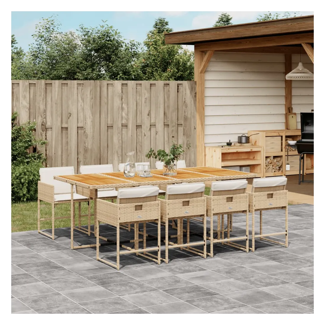 Cet ensemble de salle à manger de jardin est un excellent choix pour les repas en plein air ou pour vous détendre dans le jardin, dans l'arrière-cour ou sur la terrasse. Matériau durable : la résine tressée, également connue sous le nom de poly rotin, est un matériau synthétique solide et nécessitant peu d'entretien qui ressemble au rotin naturel. Il est léger, facile à nettoyer et couramment utilisé pour les meubles d'extérieur en raison de sa durabilité et de ses propriétés de résistance aux intempéries.Rangement compact : ces chaises sont dotées d'un dossier rabattable, ce qui permet de les ranger facilement sous la table. Une fois pliées, elles se rangent parfaitement sous la table, formant un cube peu encombrant.Expérience d'assise confortable : ce mobilier d'extérieur, doté de coussins épais, offre une expérience d'assise confortable.Housse amovible et lavable : ces coussins de siège sont dotés de housses amovibles pour un lavage et un entretien faciles. Les housses de coussin ont un rabat à l'arrière pour une fixation facile aux dossiers.Dessus stable et facile à nettoyer : cette table de jardin a un dessus en bois d'acacia robuste, durable et facile à nettoyer avec un chiffon humide. Bon à savoir :Pour que vos meubles d'extérieur restent beaux, nous vous recommandons de les protéger avec une housse imperméable.