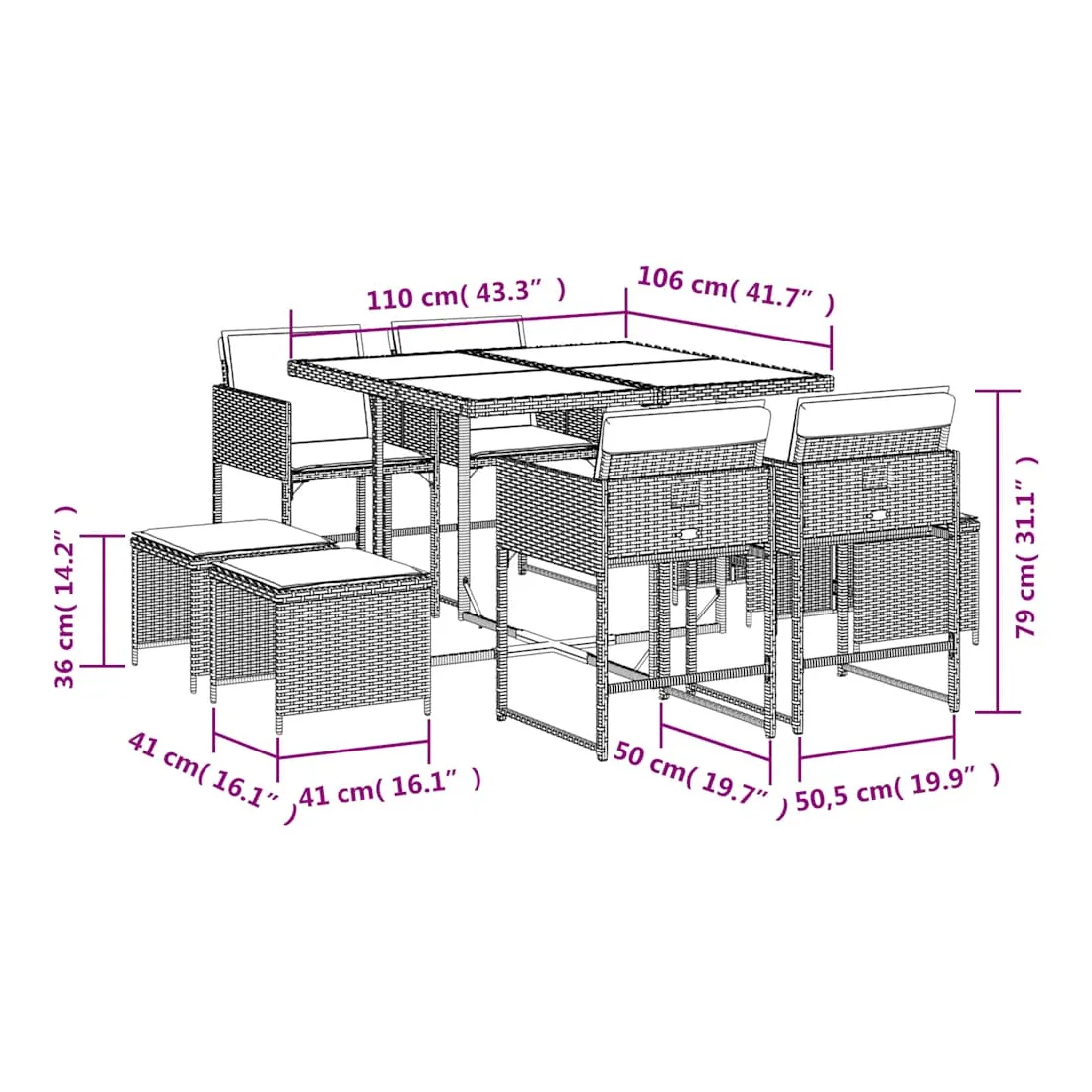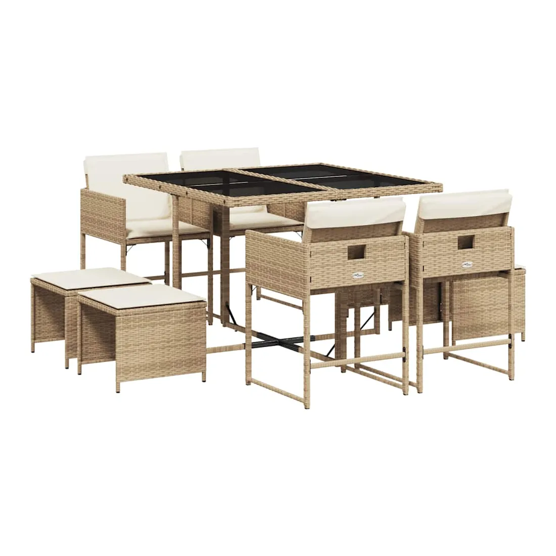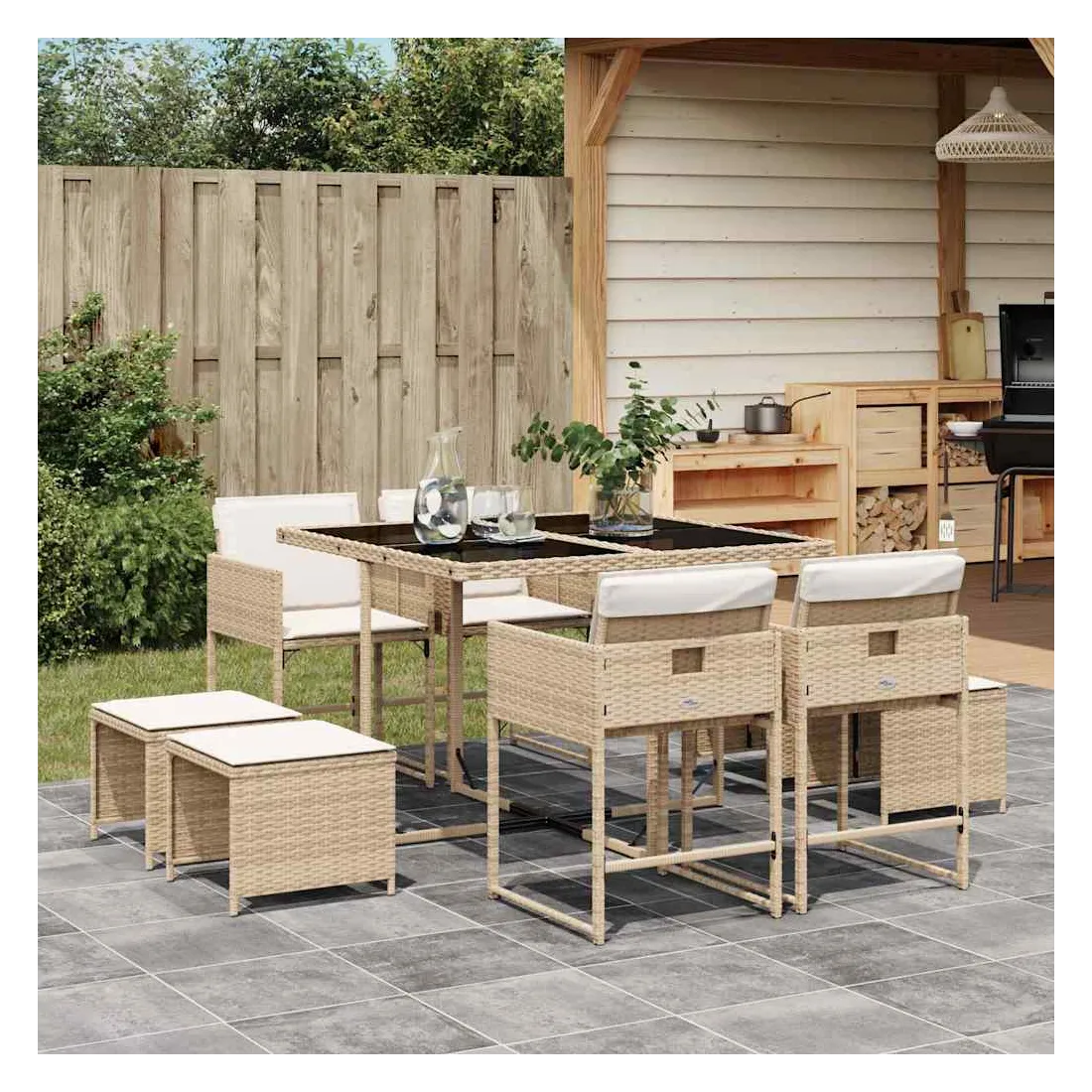 Cet ensemble de salle à manger de jardin est un excellent choix pour les repas en plein air ou pour vous détendre dans le jardin, dans l'arrière-cour ou sur la terrasse. Matériau durable : la résine tressée, également connue sous le nom de poly rotin, est un matériau synthétique solide et nécessitant peu d'entretien qui ressemble au rotin naturel. Il est léger, facile à nettoyer et couramment utilisé pour les meubles d'extérieur en raison de sa durabilité et de ses propriétés de résistance aux intempéries.Rangement compact : ces chaises sont dotées d'un dossier rabattable, ce qui permet de les ranger facilement sous la table. Une fois pliées, elles se rangent parfaitement sous la table, formant un cube peu encombrant. De plus, les tabourets peuvent également être rangés sous les chaises, maximisant encore davantage l'efficacité de l'espace.Expérience d'assise confortable : ce mobilier d'extérieur, doté de coussins épais, offre une expérience d'assise confortable.Housse amovible et lavable : ces coussins de siège sont dotés de housses amovibles pour un lavage et un entretien faciles. Les housses de coussin ont un rabat à l'arrière pour une fixation facile aux dossiers.Dessus en verre : le dessus de la table d'extérieur est fabriqué en verre trempé solide et durable, ce qui le rend facile à nettoyer avec un chiffon humide et ajoute une touche d'élégance à votre espace extérieur. Bon à savoir : Pour que vos meubles d'extérieur restent beaux, nous vous recommandons de les protéger avec une housse imperméable.