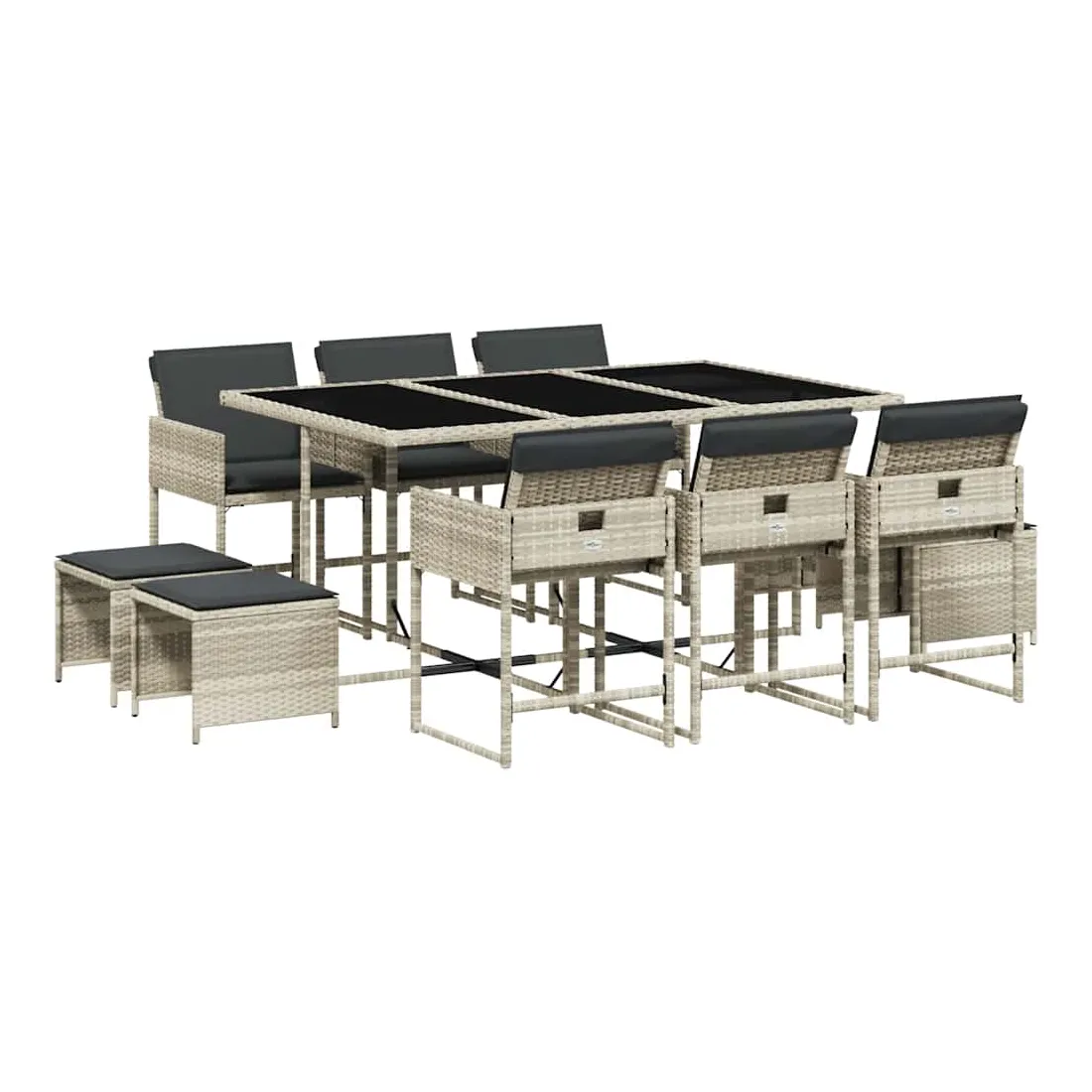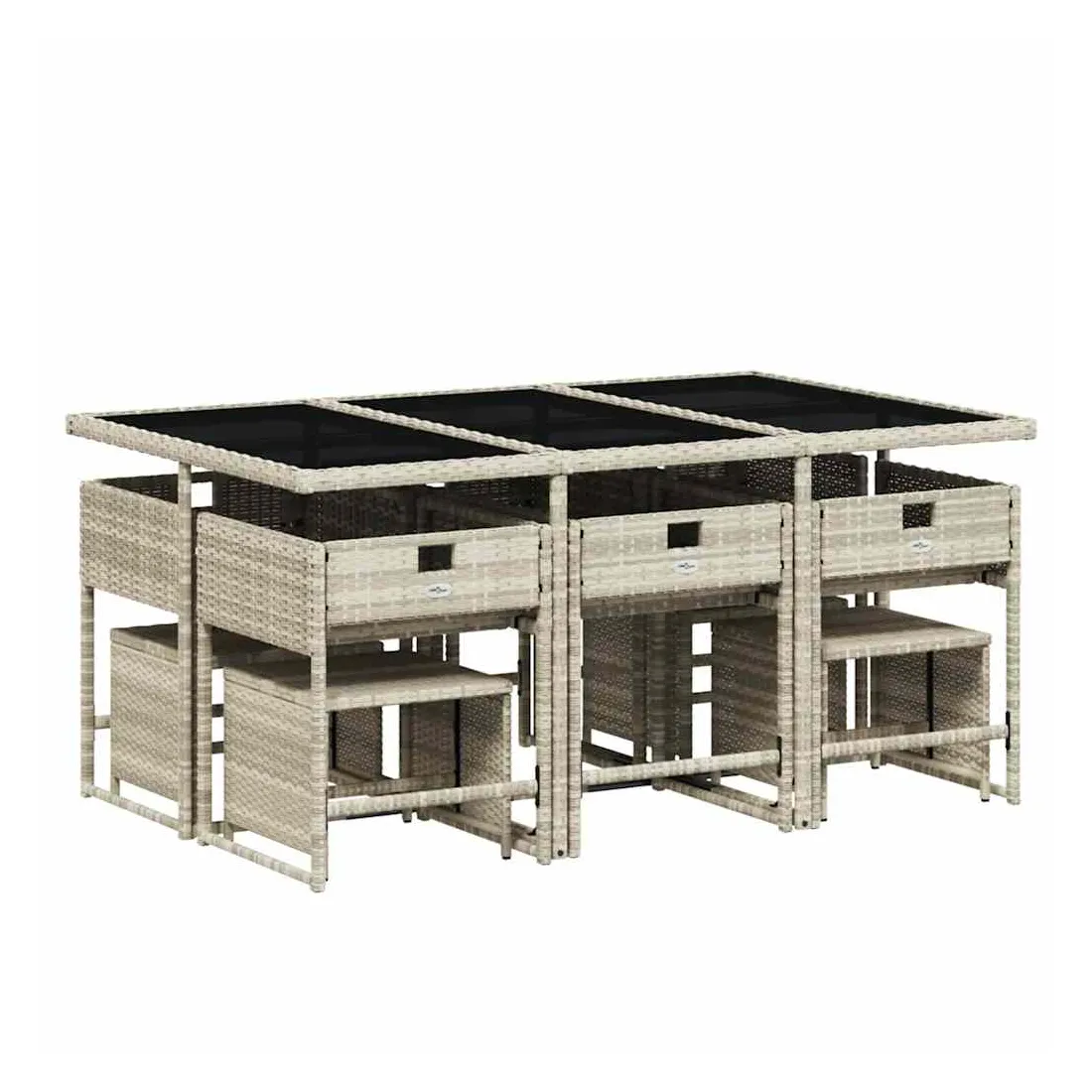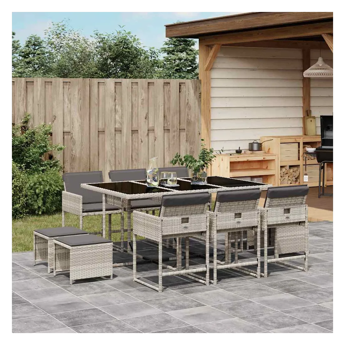 Cet ensemble de salle à manger de jardin est un excellent choix pour les repas en plein air ou pour vous détendre dans le jardin, dans l'arrière-cour ou sur la terrasse. Matériau durable : la résine tressée, également connue sous le nom de poly rotin, est un matériau synthétique solide et nécessitant peu d'entretien qui ressemble au rotin naturel. Il est léger, facile à nettoyer et couramment utilisé pour les meubles d'extérieur en raison de sa durabilité et de ses propriétés de résistance aux intempéries.Rangement compact : ces chaises sont dotées d'un dossier rabattable, ce qui permet de les ranger facilement sous la table. Une fois pliées, elles se rangent parfaitement sous la table, formant un cube peu encombrant. De plus, les tabourets peuvent également être rangés sous les chaises, maximisant encore davantage l'efficacité de l'espace.Expérience d'assise confortable : ce mobilier d'extérieur, doté de coussins épais, offre une expérience d'assise confortable.Housse amovible et lavable : ces coussins de siège sont dotés de housses amovibles pour un lavage et un entretien faciles. Les housses de coussin ont un rabat à l'arrière pour une fixation facile aux dossiers.Dessus en verre : le dessus de la table d'extérieur est fabriqué en verre trempé solide et durable, ce qui le rend facile à nettoyer avec un chiffon humide et ajoute une touche d'élégance à votre espace extérieur. Bon à savoir : Pour que vos meubles d'extérieur restent beaux, nous vous recommandons de les protéger avec une housse imperméable.