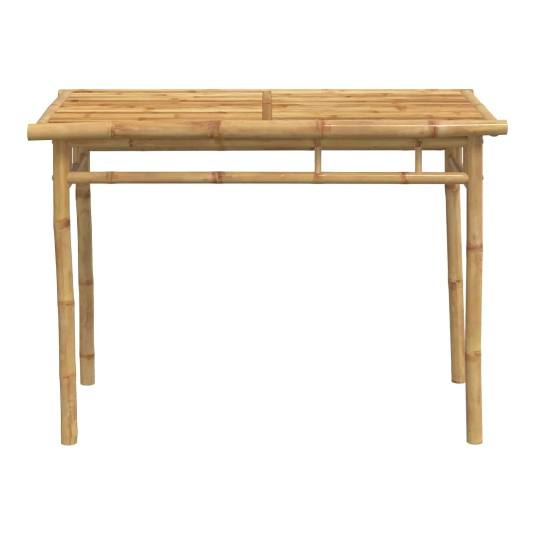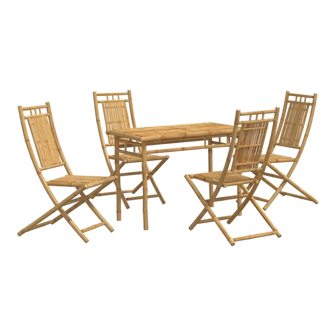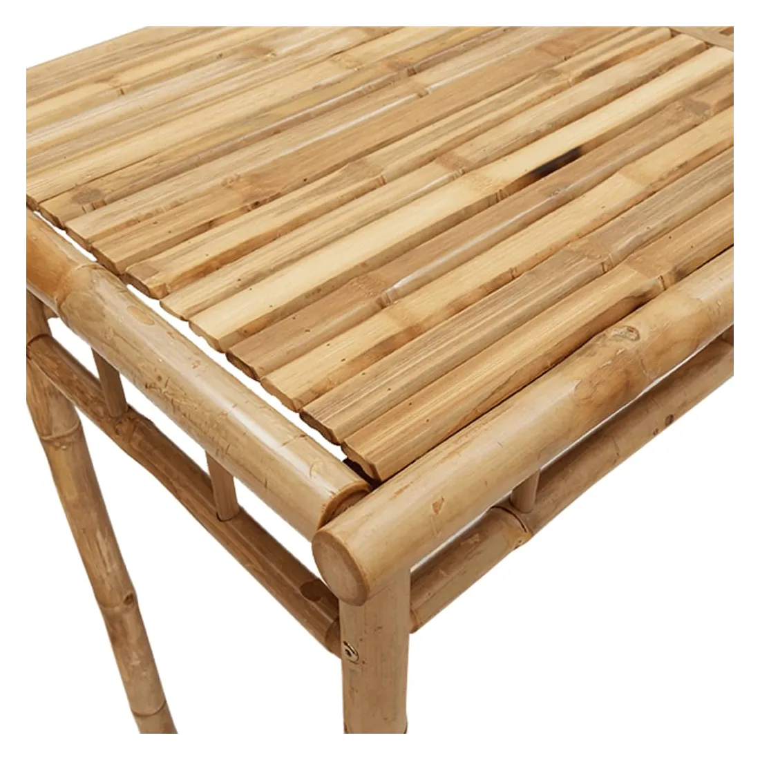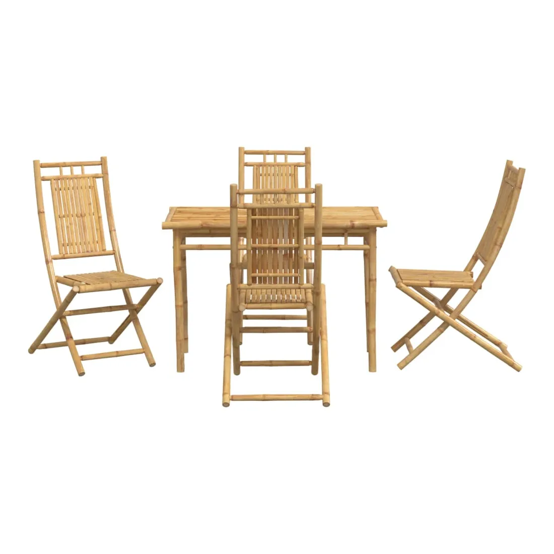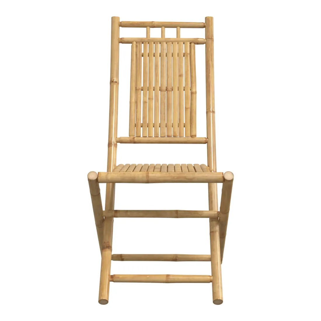 Cet ensemble de salle à manger de jardin, au design élégant et contemporain, sera un excellent choix pour manger ou vous détendre dans le jardin. Durable : en tant que matériau naturel, le bambou offre une bonne respirabilité et une faible odeur. Ces qualités rendent l’ensemble à manger de jardin durable, résistant à l’eau et de longue durée.Design pliable : la chaise à manger peut être facilement pliée lorsqu'elle n'est pas utilisée, pour un rangement et un transport faciles.Dessus stable : le dessus stable de la table de jardin est idéal pour placer votre boisson ou toute autre nécessité dont vous avez besoin à portée de main.Une expérience d'assise confortable : dotée d'un dossier, la chaise d'extérieur vous offre un confort optimal. Bon à savoir :Pour que vos meubles d'extérieur restent beaux, nous vous recommandons de les protéger avec une housse imperméable.