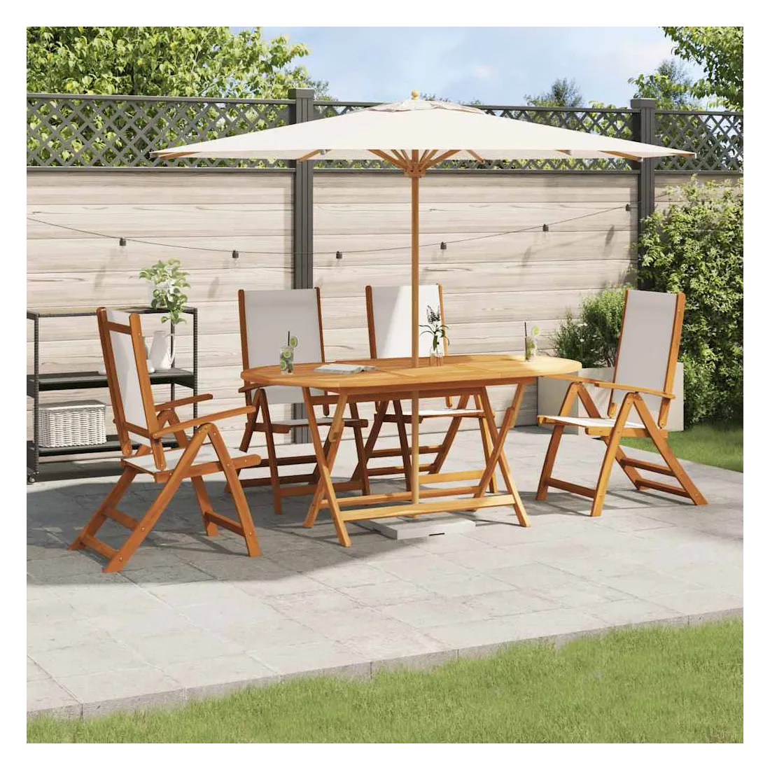Profitez d'un bon repas en plein air avec votre famille et vos amis avec cet ensemble de salle à manger de jardin en bois ! Bois d'acacia massif : l'ensemble à manger d’extérieur est fabriqué en bois d'acacia massif. Le bois d'acacia massif est un beau matériau naturel. Le bois d'acacia est un bois dur tropical, dense, robuste et durable. Fonction réglable et pliable : la chaise de jardin peut être réglée en 5 positions, afin que vous puissiez toujours trouver la position d'assise la plus confortable. Elle peut également être repliée pour économiser de l'espace lorsqu'elle n'est pas utilisée. Design pratique : grâce à son design spécial, cette table de jardin peut être rallongée lorsque de l'espace supplémentaire est nécessaire. De plus, il y a un trou pour parasol dans le dessus de la table, ce qui vous permet de fixer facilement un parasol pour créer un endroit ombragé. Dessus de table robuste : cette table à manger de jardin vous offre un dessus de table solide. Vous pouvez placer vos collations, boissons et n'importe laquelle de vos décorations préférées. Surface facile à nettoyer : la surface à finition à l'huile rend cette table et ces chaises de jardin faciles à nettoyer avec un chiffon humide. Bon à savoir :Pour que vos meubles d'extérieur restent beaux, nous vous recommandons de les protéger avec une housse imperméable.