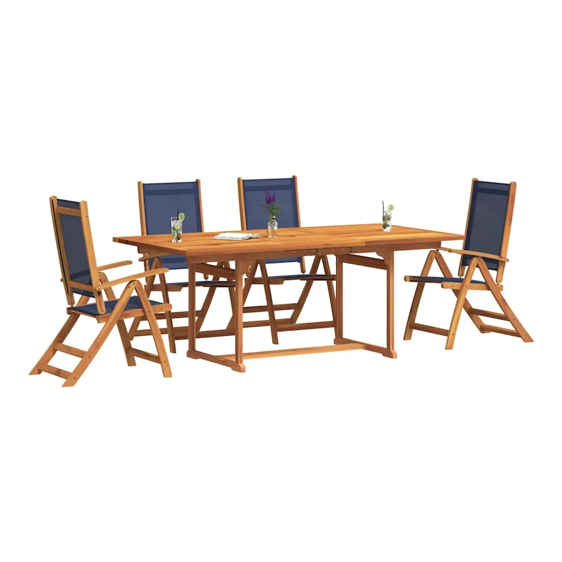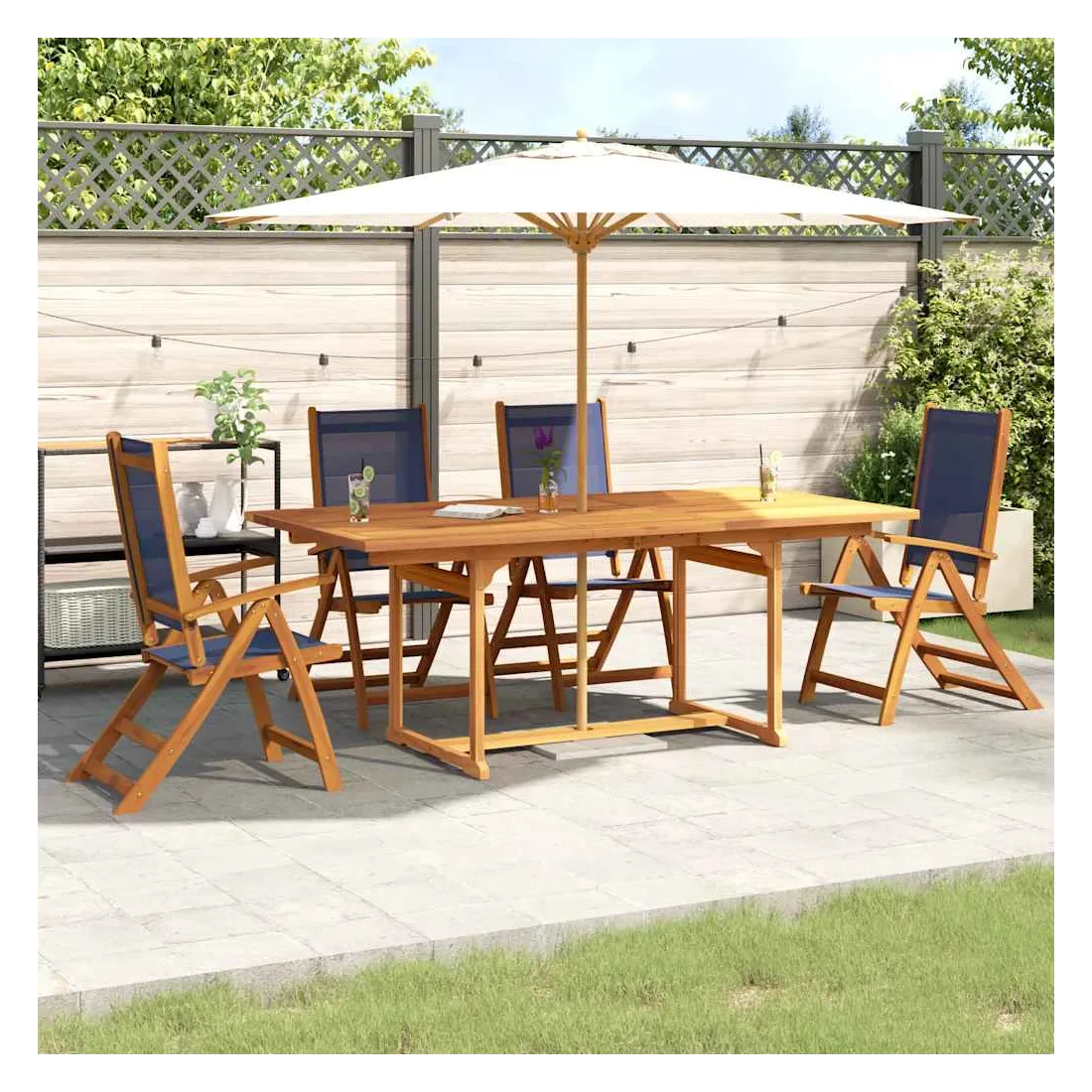 Profitez d'un bon repas en plein air avec votre famille et vos amis avec cet ensemble de salle à manger de jardin en bois ! Bois d'acacia massif : l'ensemble à manger d’extérieur est fabriqué en bois d'acacia massif. Le bois d'acacia massif est un beau matériau naturel. Le bois d'acacia est un bois dur tropical, dense, robuste et durable. Fonction réglable et pliable : la chaise de jardin peut être réglée en 5 positions, afin que vous puissiez toujours trouver la position d'assise la plus confortable. Elle peut également être repliée pour économiser de l'espace lorsqu'elle n'est pas utilisée. Design pratique : grâce à son design spécial, cette table de jardin peut être rallongée lorsque de l'espace supplémentaire est nécessaire. De plus, il y a un trou pour parasol dans le dessus de la table, ce qui vous permet de fixer facilement un parasol pour créer un endroit ombragé. Dessus de table robuste : cette table à manger de jardin vous offre un dessus de table solide. Vous pouvez placer vos collations, boissons et n'importe laquelle de vos décorations préférées. Surface facile à nettoyer : la surface à finition à l'huile rend cette table et ces chaises de jardin faciles à nettoyer avec un chiffon humide. Bon à savoir :Pour que vos meubles d'extérieur restent beaux, nous vous recommandons de les protéger avec une housse imperméable.