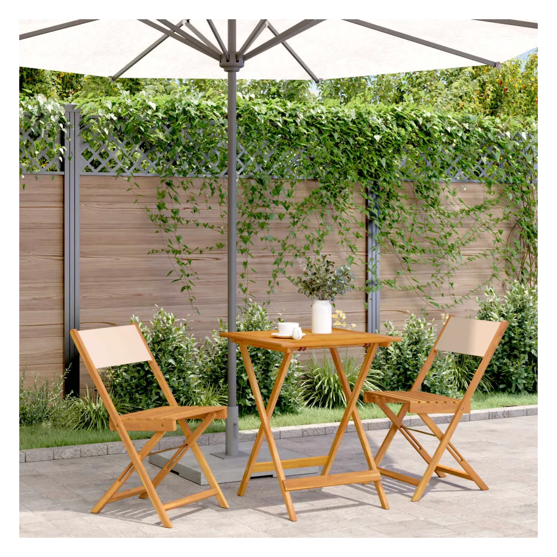 Savourez une tasse de café ou discutez avec votre famille et vos amis dans le jardin, l'arrière-cour ou sur le balcon avec cet ensemble de bistro ! Robuste et stable : le bois d'acacia massif est connu pour sa solidité et sa durabilité. Ses couleurs variées et ses grains uniques lui confèrent un aspect attrayant. Sa stabilité et sa résistance aux intempéries en font un matériau idéal pour la fabrication de meubles d'intérieur et d'extérieur.Conception pratique : la chaise d'extérieur ne comporte pas d'accoudoir, mais uniquement un dossier, ce qui vous permet d'être plus libre de vos mouvements tout en bénéficiant d'un grand confort.Dessus de table robuste : la table d'extérieur offre un excellent support pour accueillir vos boissons, collations, corbeilles de fruits et vos décorations préférées.Design pliable : la table et les chaises de salle à manger d'extérieur peuvent être facilement repliées lorsqu'elles ne sont pas utilisées pour faciliter le rangement et le transport. Bon à savoir :Pour que vos meubles d'extérieur restent beaux, nous vous recommandons de les protéger avec une housse imperméable.