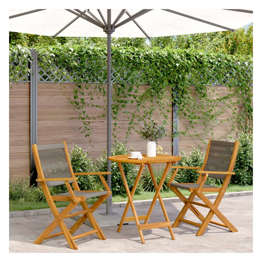 Savourez une tasse de café ou discutez avec votre famille et vos amis dans le jardin, l'arrière-cour ou sur le balcon avec cet ensemble de bistro ! Robuste et stable : le bois d'acacia massif est connu pour sa solidité et sa durabilité. Ses couleurs variées et ses grains uniques lui confèrent un aspect attrayant. Sa stabilité et sa résistance aux intempéries en font un matériau idéal pour la fabrication de meubles d'intérieur et d'extérieur.Conception pratique : la main courante en bois, pratique et plate, vous permet de poser vos mains dessus tout en profitant d'un moment en plein air.Dessus de table robuste : la table d'extérieur offre un excellent support pour accueillir vos boissons, collations, corbeilles de fruits et vos décorations préférées.Design pliable : la table et les chaises de salle à manger d'extérieur peuvent être facilement repliées lorsqu'elles ne sont pas utilisées pour faciliter le rangement et le transport. Bon à savoir :Pour que vos meubles d'extérieur restent beaux, nous vous recommandons de les protéger avec une housse imperméable.