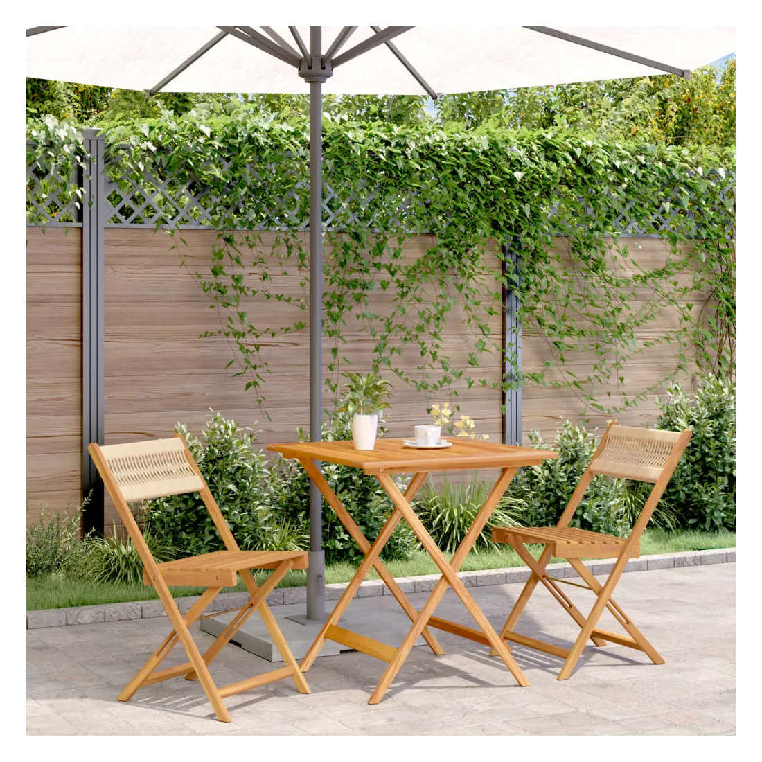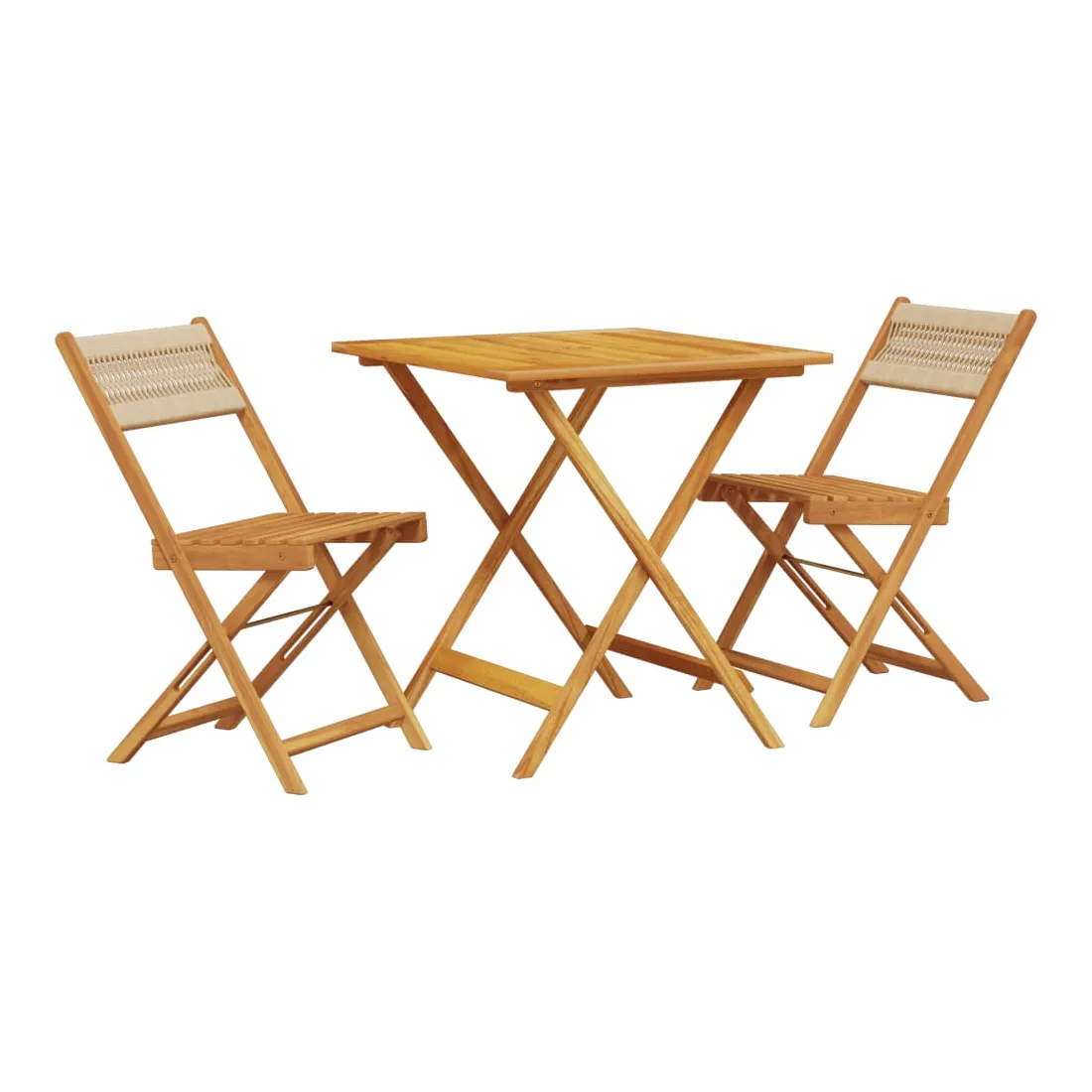 Savourez une tasse de café ou discutez avec votre famille et vos amis dans le jardin, l'arrière-cour ou sur le balcon avec cet ensemble de bistro ! Robuste et stable : le bois d'acacia massif est connu pour sa solidité et sa durabilité. Ses couleurs variées et ses grains uniques lui confèrent un aspect attrayant. Sa stabilité et sa résistance aux intempéries en font un matériau idéal pour la fabrication de meubles d'intérieur et d'extérieur.Conception pratique : la chaise d'extérieur ne comporte pas d'accoudoir, mais uniquement un dossier, ce qui vous permet d'être plus libre de vos mouvements tout en bénéficiant d'un grand confort.Dessus de table robuste : la table d'extérieur offre un excellent support pour accueillir vos boissons, collations, corbeilles de fruits et vos décorations préférées.Design pliable : la table et les chaises de salle à manger d'extérieur peuvent être facilement repliées lorsqu'elles ne sont pas utilisées pour faciliter le rangement et le transport. Bon à savoir :Pour que vos meubles d'extérieur restent beaux, nous vous recommandons de les protéger avec une housse imperméable.