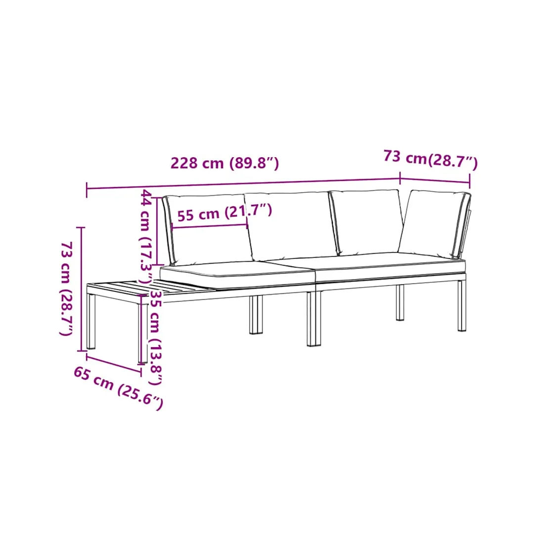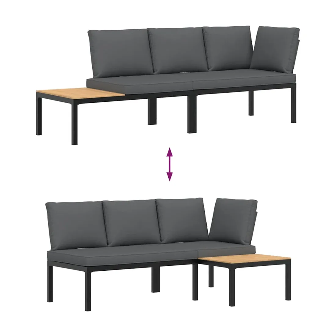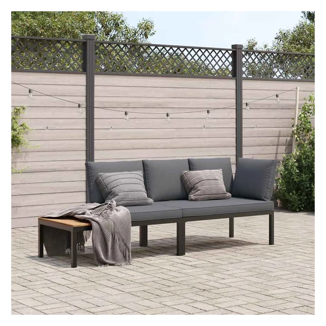 Cet ensemble de canapés de jardin est le complément parfait de votre arrière-cour, terrasse ou patio, offrant un espace confortable et accueillant pour discuter avec la famille et les amis ou simplement se détendre et profiter de l'extérieur. Durable et robuste : l'ensemble de canapés d'extérieur est fabriqué en aluminium, ce qui le rend résistant et durable.Table d'appoint pratique : ce mobilier d'extérieur comprend une table d'appoint, offrant un endroit pratique pour garder vos essentiels à portée de main.Expérience d'assise confortable : ce mobilier d'extérieur, doté de coussins épais, offre une expérience d'assise confortable. Housse amovible et lavable : ces coussins de siège sont dotés de housses amovibles pour un lavage et un entretien faciles.Conception modulaire : cet ensemble de meubles d'extérieur a une conception modulaire, ce qui le rend complètement flexible et facile à déplacer, afin que vous puissiez créer un agencement de meubles d'extérieur personnalisé. Bon à savoir :Pour que vos meubles d'extérieur restent beaux, nous vous recommandons de les protéger avec une housse imperméable.