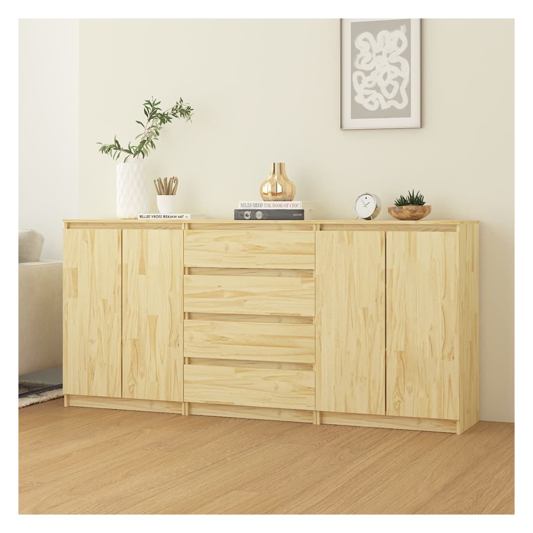 Ces armoires latérales en bois dégagent un charme rustique et font un excellent supplément à votre espace de vie. Ces tables de chevet sont fabriquées en bois de pin massif, ce qui garantit leur solidité et leur durabilité. Composées de 2 armoires avec 2 portes et 3 compartiments, 1 armoire avec 4 tiroirs, elles offrent un espace de rangement suffisant pour garder vos différents articles bien organisés et à portée de main. Le dessus de table robuste est également idéal pour exposer des objets décoratifs, des cadres photo ou des plantes en pot. De plus, ces tables de chevet sont faciles à nettoyer avec un chiffon humide. Redécorez votre intérieur avec ces armoires élégantes !