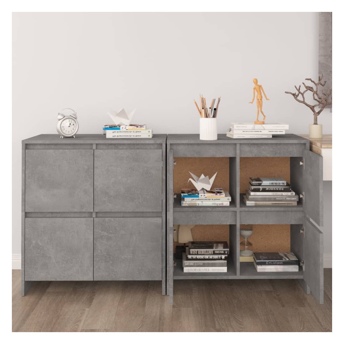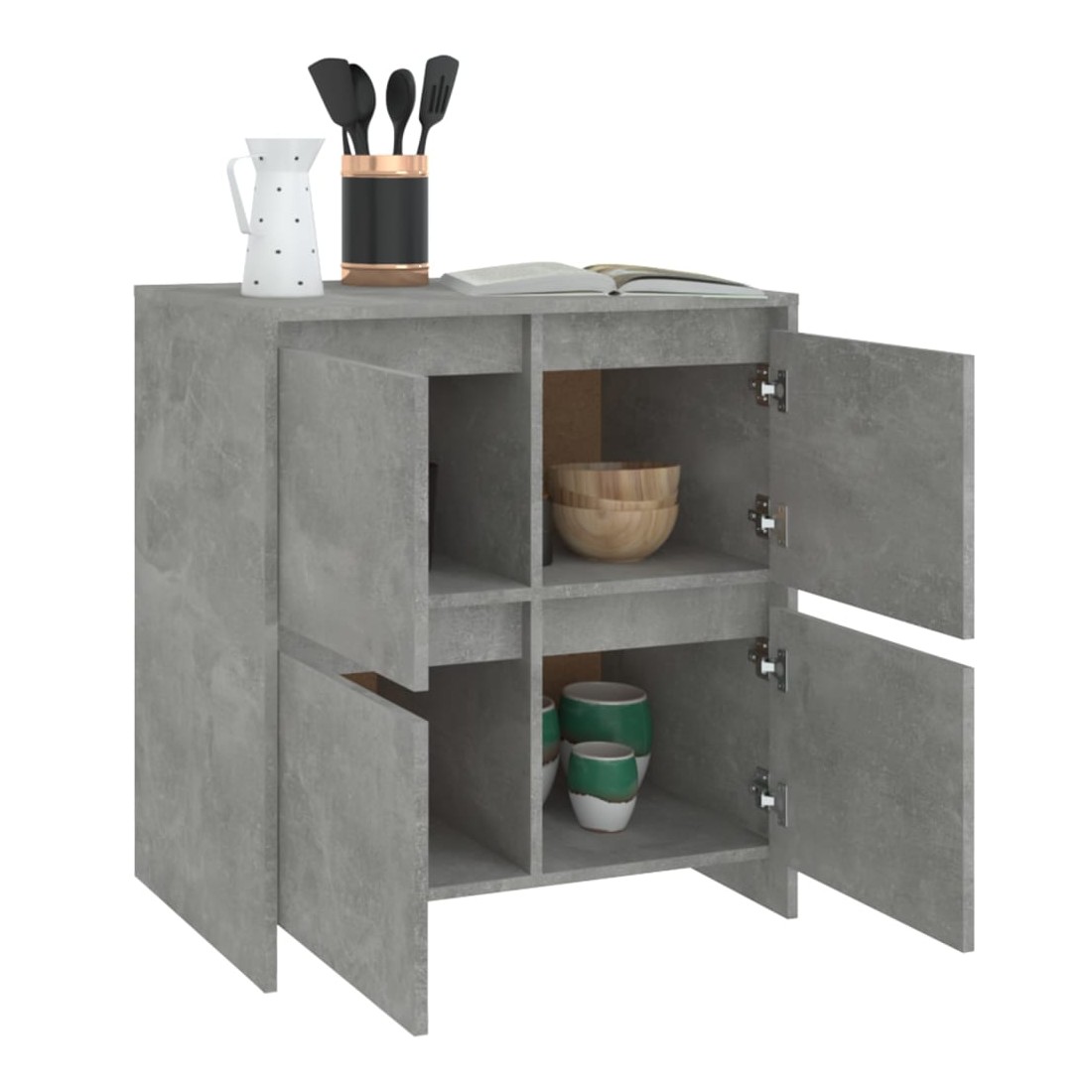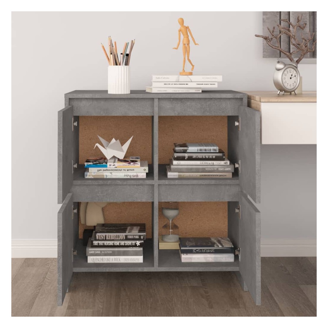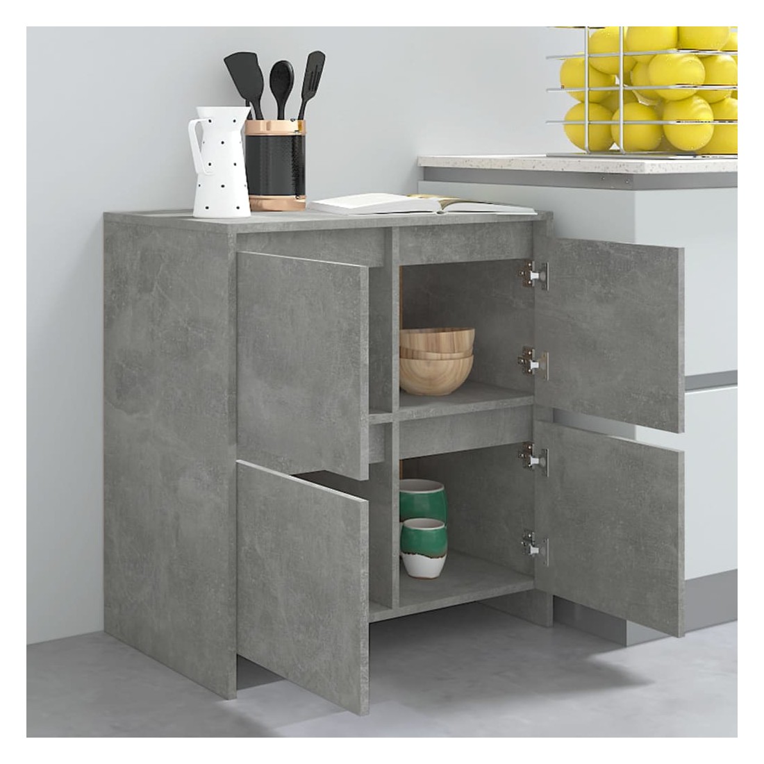 Ces buffets, dotés d'un design minimaliste, sont un supplément pratique mais également décoratif à votre maison. Avec 4 portes, l'armoire latérale offre un grand espace de rangement pour les livres, les appareils multimédia et d'autres articles. Le dessus de table robuste est idéal pour afficher des objets décoratifs, des cadres photo et des plantes en pot. De plus, l'armoire de rangement est facile à nettoyer avec un chiffon humide.