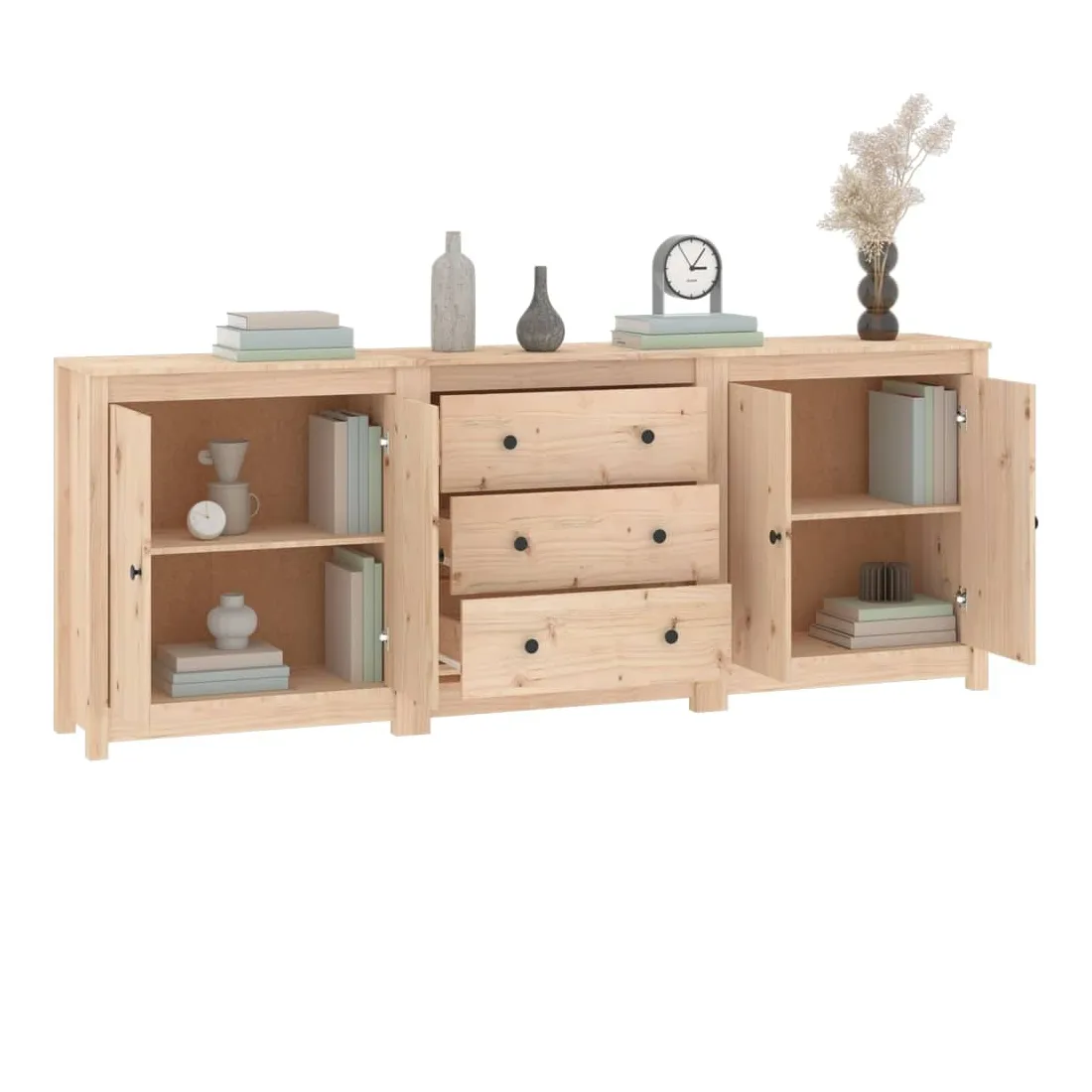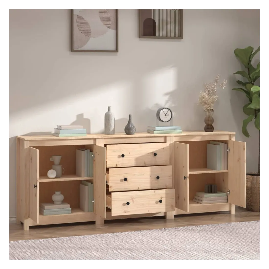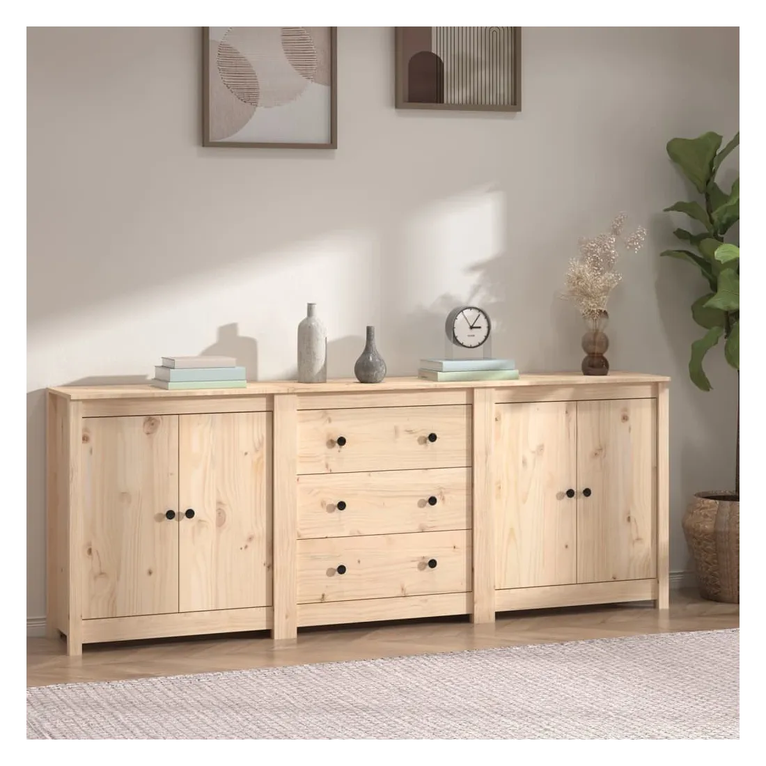Rangez vos objets précieux de manière élégante. Ce buffet est idéal pour tout salon, chambre à coucher ou bureau moderne pour garder les objets nécessaires à portée de main. Bois de pin massif : le bois de pin massif est un matériau naturel magnifique. Le bois de pin a un grain droit et les nœuds donnent au matériau son aspect caractéristique et rustique.Grand espace de rangement : l'armoire offre un grand espace de rangement pour garder vos différents articles essentiels quotidiens bien organisés et facilement accessibles.Dessus robuste : le dessus robuste de cette armoire est idéal pour exposer des objets décoratifs, des cadres photo ou des plantes en pot. Attention :Afin d'éviter qu'il ne bascule, ce produit doit être utilisé avec le dispositif de fixation murale fourni.Remarque :Chaque produit est livré avec un manuel de montage dans la boîte pour un montage facile.