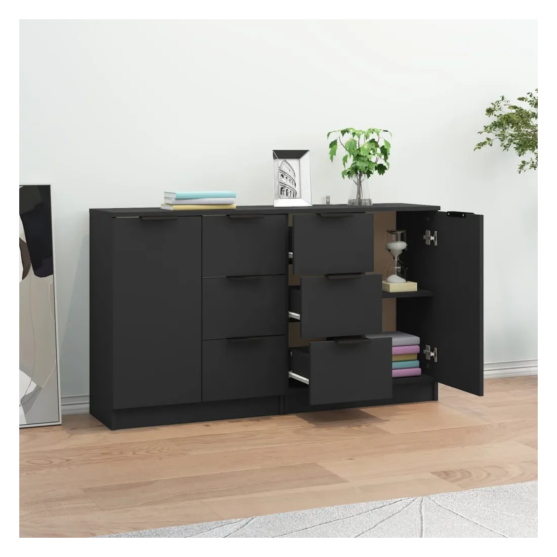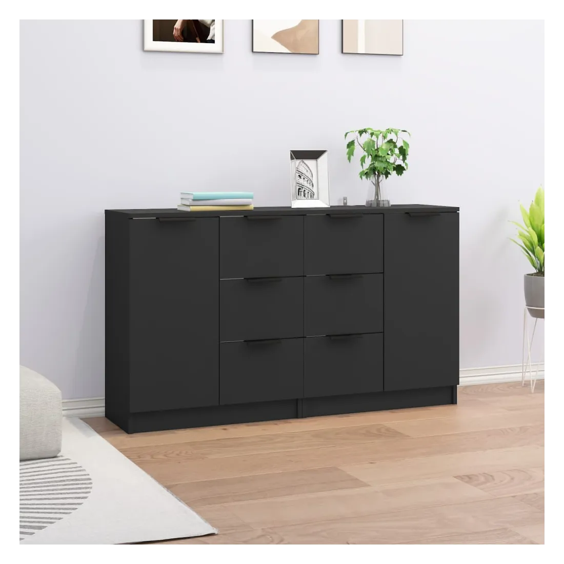Dotés d'un charme minimaliste, ces buffets sont destinés à satisfaire vos différentes exigences et à compléter idéalement votre pièce. Matériau facile à nettoyer : fabriquées en bois d'ingénierie, les armoires latérales sont faciles à nettoyer. Le bois d'ingénierie est d'une qualité exceptionnelle avec une surface lisse et présente également résistance, stabilité et résistance à l'humidité.Grand espace de rangement : l'espace de rangement rend ces buffets faciles à organiser.Armoire multifonctionnelle : le dessus robuste est idéal pour afficher des objets décoratifs, des cadres photo ou des plantes en pot. Elles peuvent également être utilisées comme armoires de console, armoires latérales, etc. ATTENTION :Afin d'éviter le basculement, ces produits doivent être utilisés avec le dispositif de fixation murale fourni.