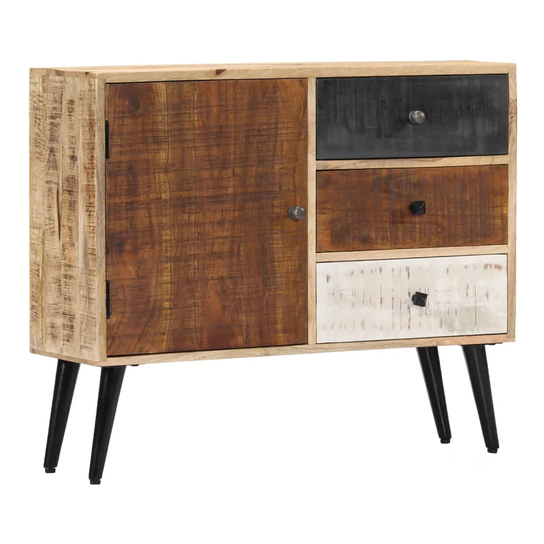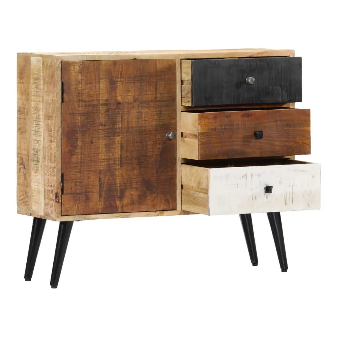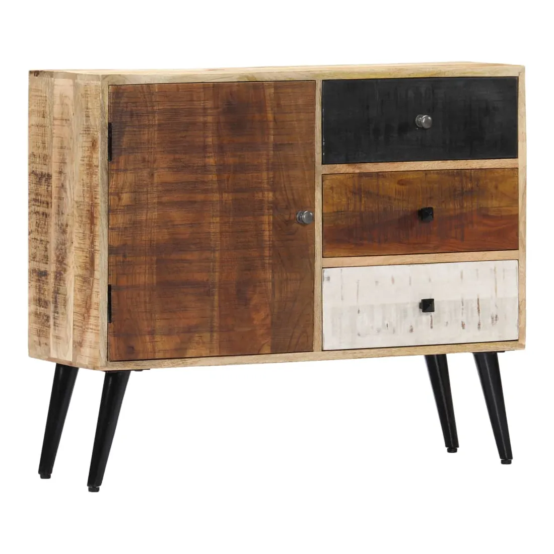Apportez le luxe d'un design inspiré du milieu du siècle dans votre intérieur avec notre magnifique buffet ! Fabriquée en bois massif de manguier, le buffet a reçu une belle finition par polissage et laquage, ce qui lui donne un aspect raffiné. Le bois de manguier est un bois dur dense et robuste qui a de belles stries et des contours bruns ou dorés sur sa surface. Il dispose de 3 tiroirs et d'une porte, offrant un grand espace pour ranger vos chaussures, vos livres, ainsi que divers autres objets. Le buffet est facile à assembler et à nettoyer avec un chiffon humide. Remarque importante : les couleurs et les grains de bois peuvent varier d'une pièce à l'autre, ce qui rend chaque pièce unique et légèrement différente l'une de l'autre. La livraison est aléatoire, ce qui garantit l'exclu