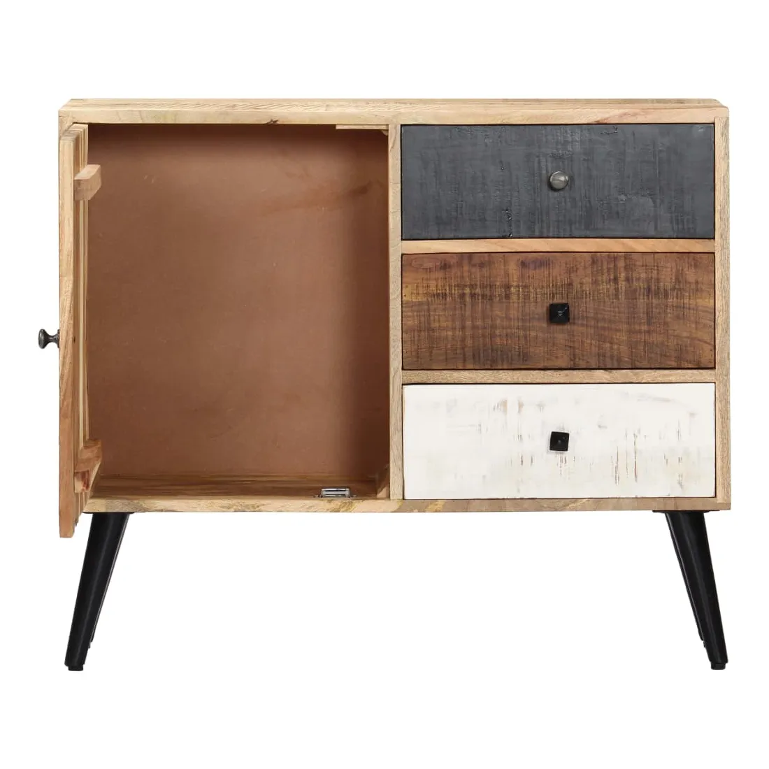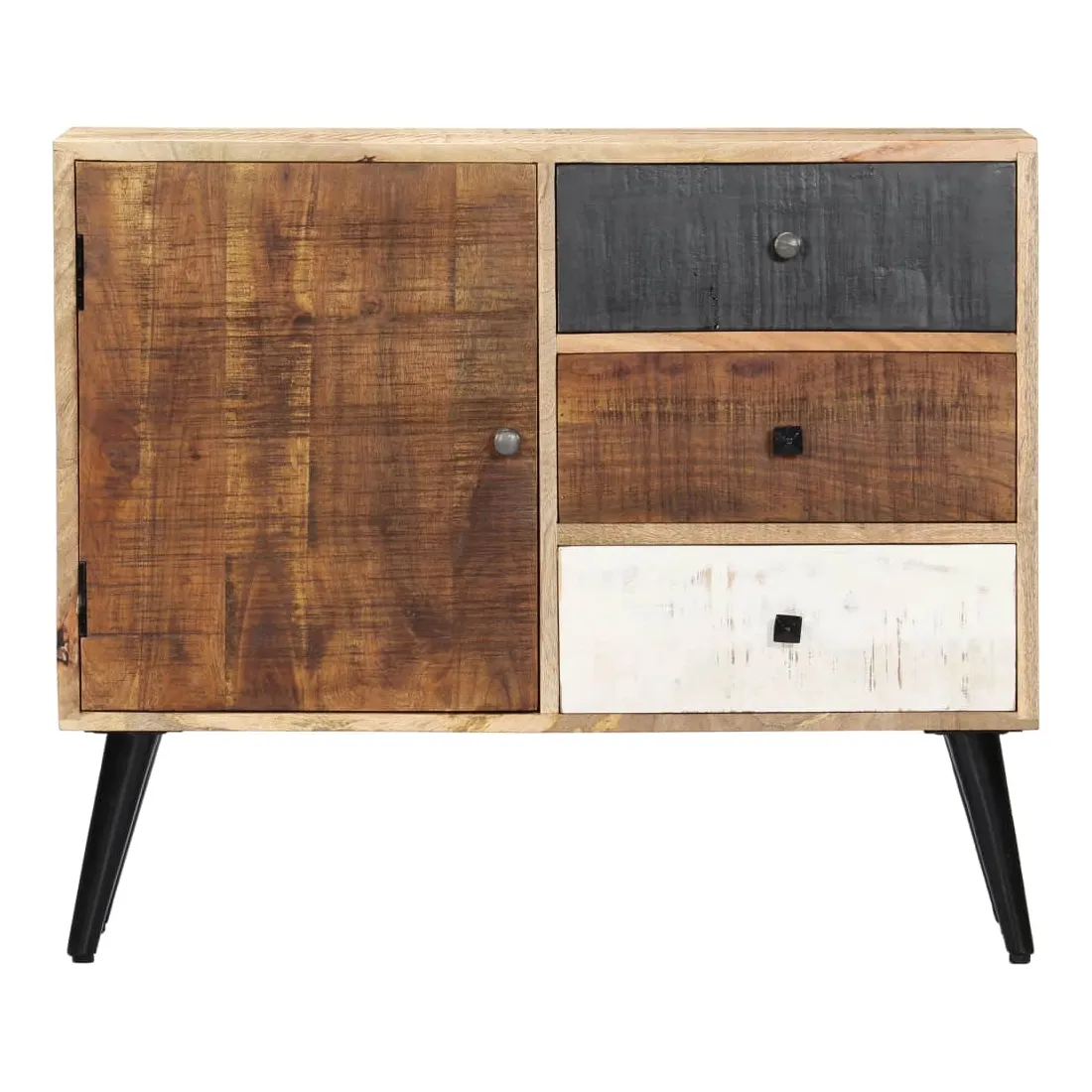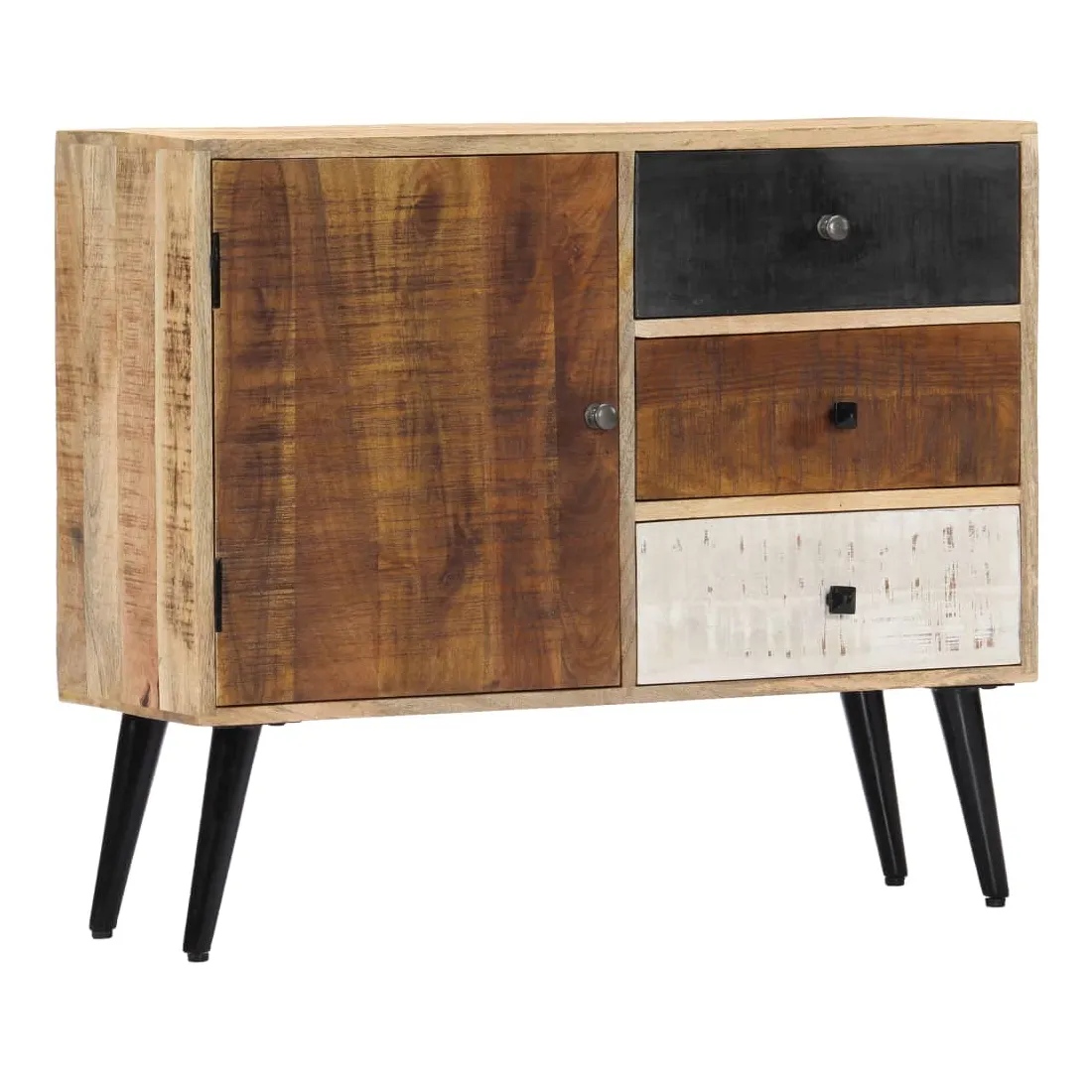 Apportez le luxe d'un design inspiré du milieu du siècle dans votre intérieur avec notre magnifique buffet ! Fabriquée en bois massif de manguier, le buffet a reçu une belle finition par polissage et laquage, ce qui lui donne un aspect raffiné. Le bois de manguier est un bois dur dense et robuste qui a de belles stries et des contours bruns ou dorés sur sa surface. Il dispose de 3 tiroirs et d'une porte, offrant un grand espace pour ranger vos chaussures, vos livres, ainsi que divers autres objets. Le buffet est facile à assembler et à nettoyer avec un chiffon humide. Remarque importante : les couleurs et les grains de bois peuvent varier d'une pièce à l'autre, ce qui rend chaque pièce unique et légèrement différente l'une de l'autre. La livraison est aléatoire, ce qui garantit l'exclu