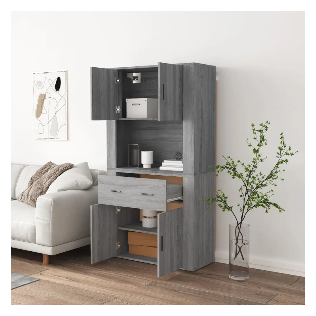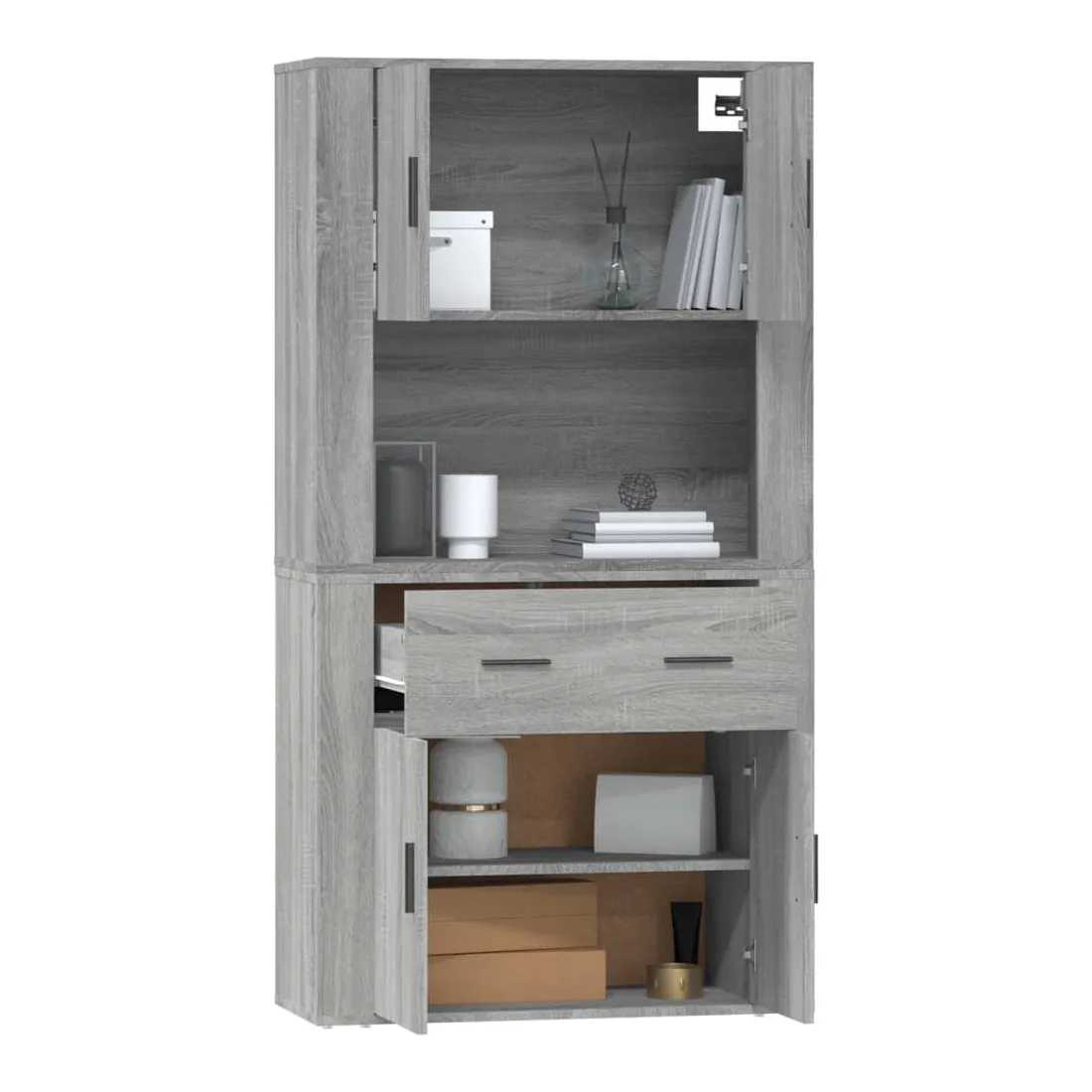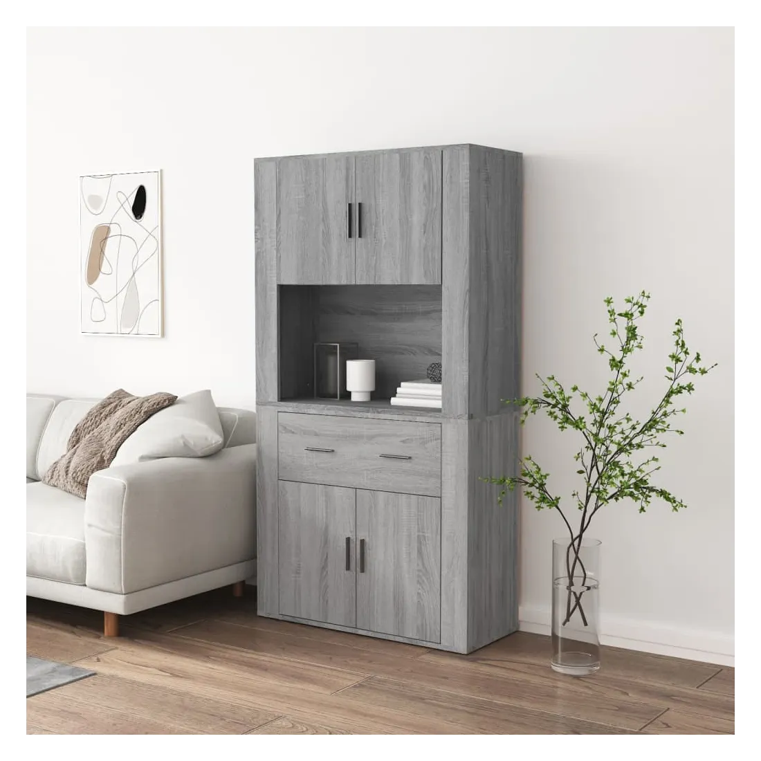 Cherchez-vous un buffet haut de gamme stylé ? Ce buffet haut ajoute un charme unique à votre intérieur existant ! Matériau durable : le bois d'ingénierie est d'une qualité exceptionnelle avec une surface lisse et présente également résistance, stabilité et résistance à l'humidité.Grand espace de rangement : le buffet offre un grand espace de rangement pour garder vos différents articles essentiels quotidiens bien organisés et facilement accessibles.Fonction murale : le meuble de rangement peut être fixé au mur sur le dessus du buffet pour créer un buffet haut, ce qui permet de gagner de l'espace au sol. Ainsi, vous pouvez maximiser votre espace de vie et garder la zone propre et bien rangée. Bon à savoir :Pour faciliter au maximum le montage, chaque produit est livré avec des instructions.Les vis et les chevilles pour l'intérieur du mur ne sont pas incluses. Nous vous conseillons de trouver et d'utiliser des vis et des chevilles adaptées spécifiquement à vos murs. Si vous n'êtes pas sûr, vous pouvez consulter un professionnel. Veuillez lire et suivre chaque étape des instructions. Attention :Pour éviter qu'il ne soit renversé, ce produit doit être utilisé avec le dispositif de fixation au mur fourni.