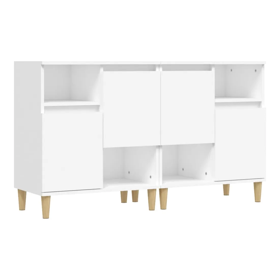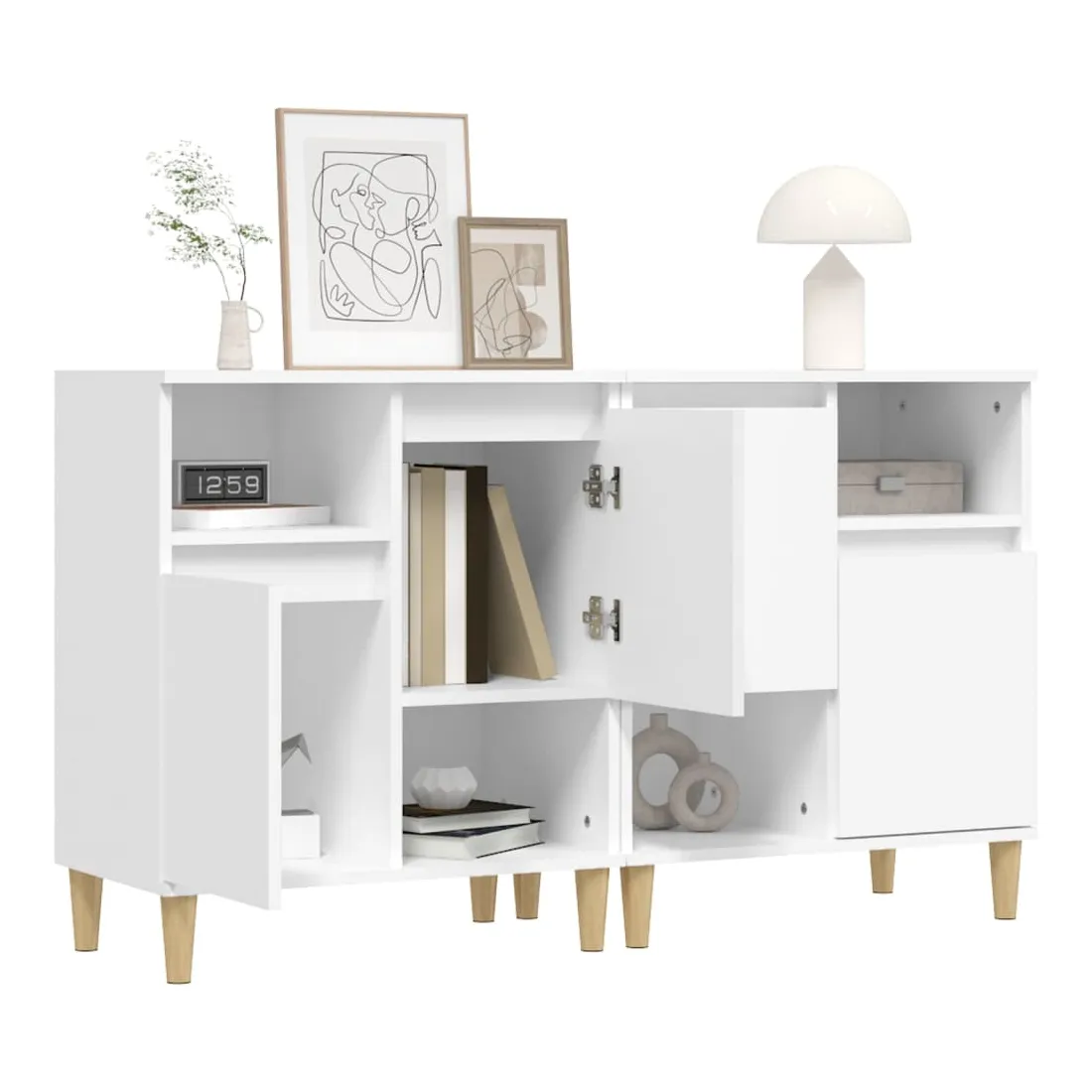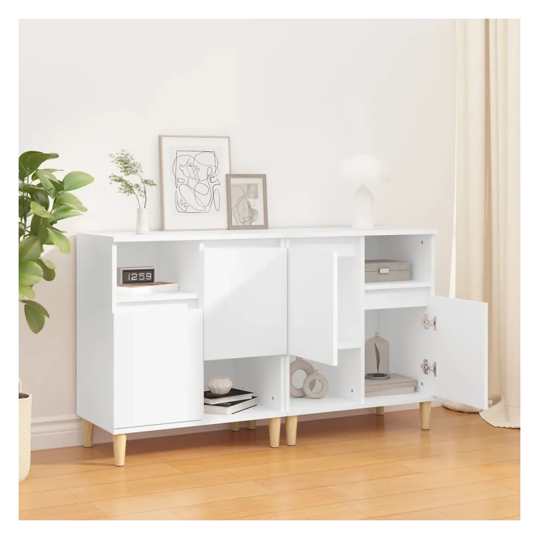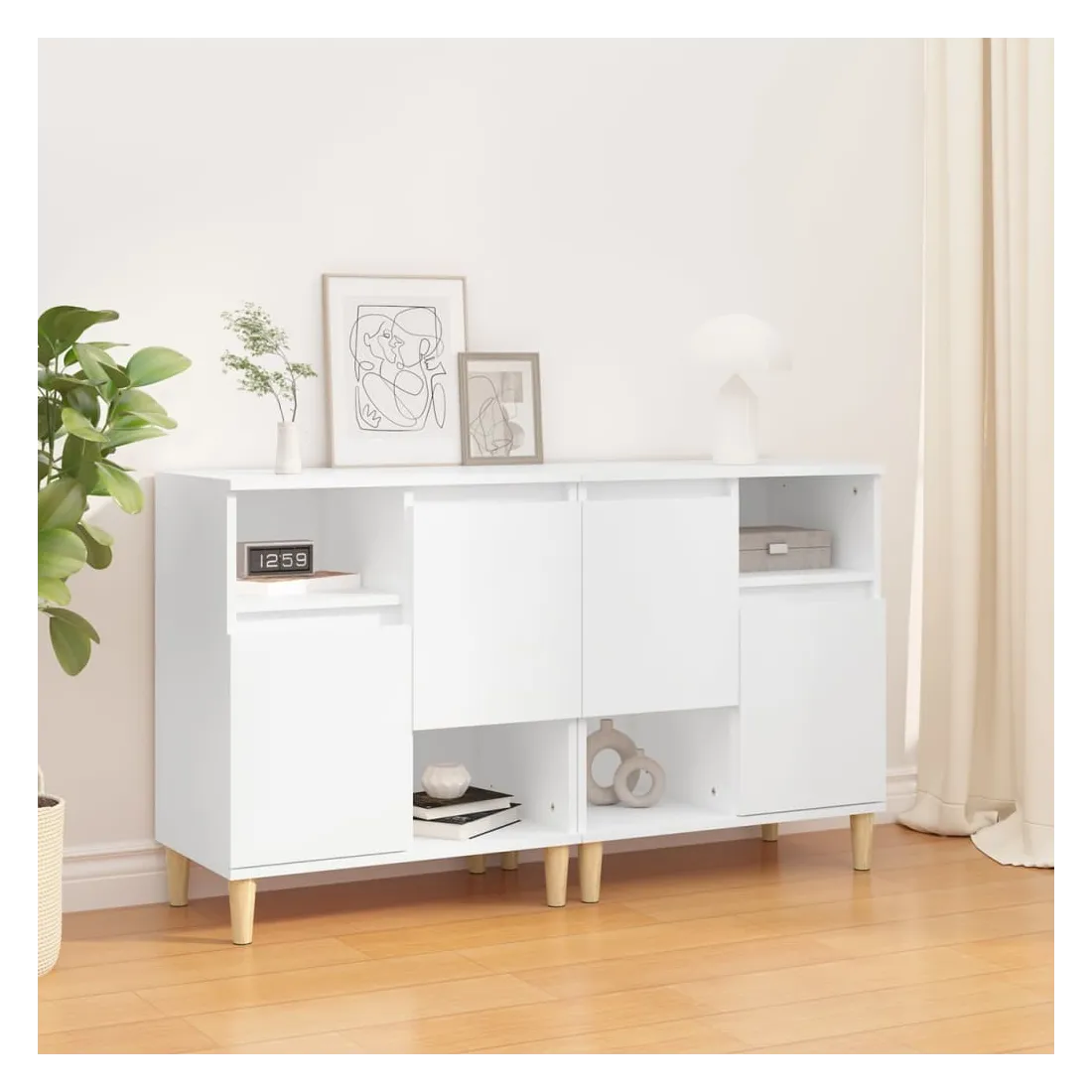 Ces buffets tendance, au design élégant et classique, sont destinés à améliorer votre intérieur. Matériau durable : le bois d'ingénierie est d'une qualité exceptionnelle avec une surface lisse et présente également une résistance, une stabilité et une résistance à l'humidité. Fabriquée en bois d'ingénierie, l'armoire est facile à nettoyer avec un chiffon humide.Grand espace de rangement : ce buffet dispose de 4 compartiments et de 2 portes, offrant un grand espace de rangement pour garder vos magazines, livres, DVD, appareils multimédias et autres objets essentiels bien organisés et à portée de main.Pieds en bois : les pieds en bois d'eucalyptus massif confèrent à l'armoire de rangement un aspect naturel et agréable tout en assurant sa stabilité.Fonction d'exposition : le haut de l'armoire est idéal pour placer des plantes en pot, des photos encadrées et d'autres objets décoratifs. Bon à savoir :Les portes peuvent être installées de deux manières. Attention :Pour éviter qu'il ne soit renversé, ce produit doit être utilisé avec le dispositif de fixation au mur fourni.