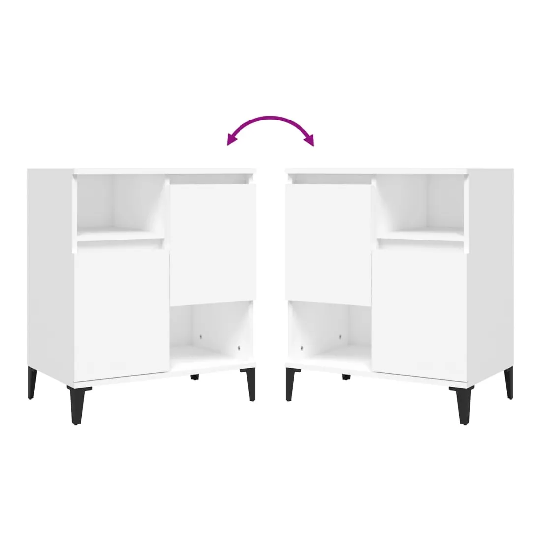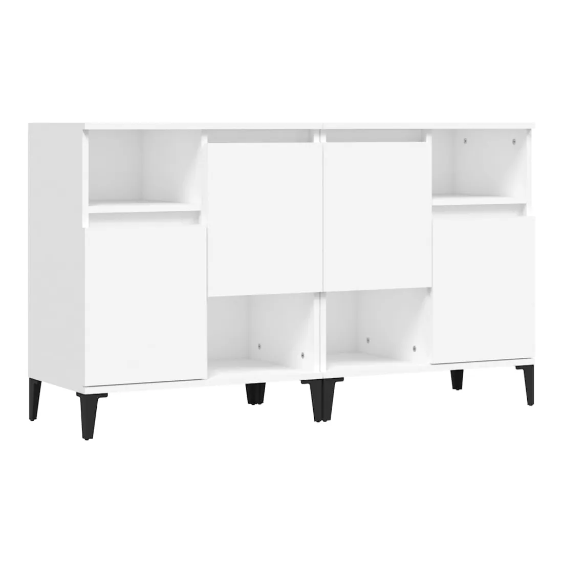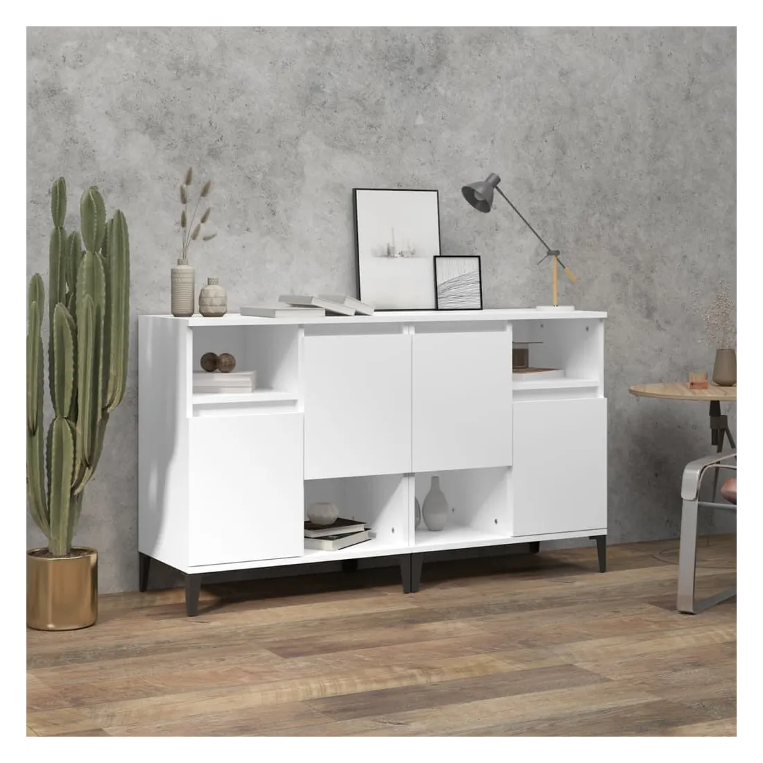 Ces buffets classiques, au look intemporel, sont conçus pour être un excellent supplément à votre maison. Matériau durable : le bois d'ingénierie est d'une qualité exceptionnelle avec une surface lisse et présente également résistance, stabilité et résistance à l'humidité. Fabriquée en bois d'ingénierie, l'armoire est facile à nettoyer avec un chiffon humide.Grand espace de rangement : équipé de 4 compartiments, le meuble buffet offre un grand espace de rangement pour garder vos différents articles essentiels quotidiens bien organisés et facilement accessibles.Fonction d'affichage : le dessus du placard est idéal pour exposer vos objets décoratifs, albums photo ou petites plantes. Bon à savoir :Les portes peuvent être installées de deux manières. Attention :Pour éviter qu'il ne soit renversé, ce produit doit être utilisé avec le dispositif de fixation au mur fourni.