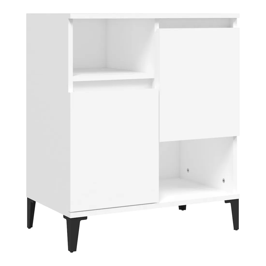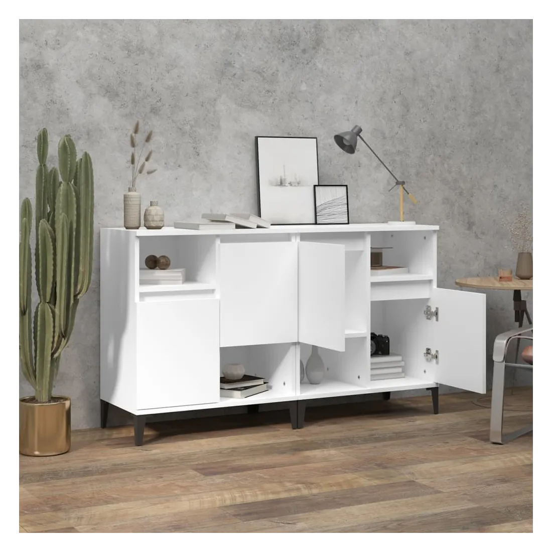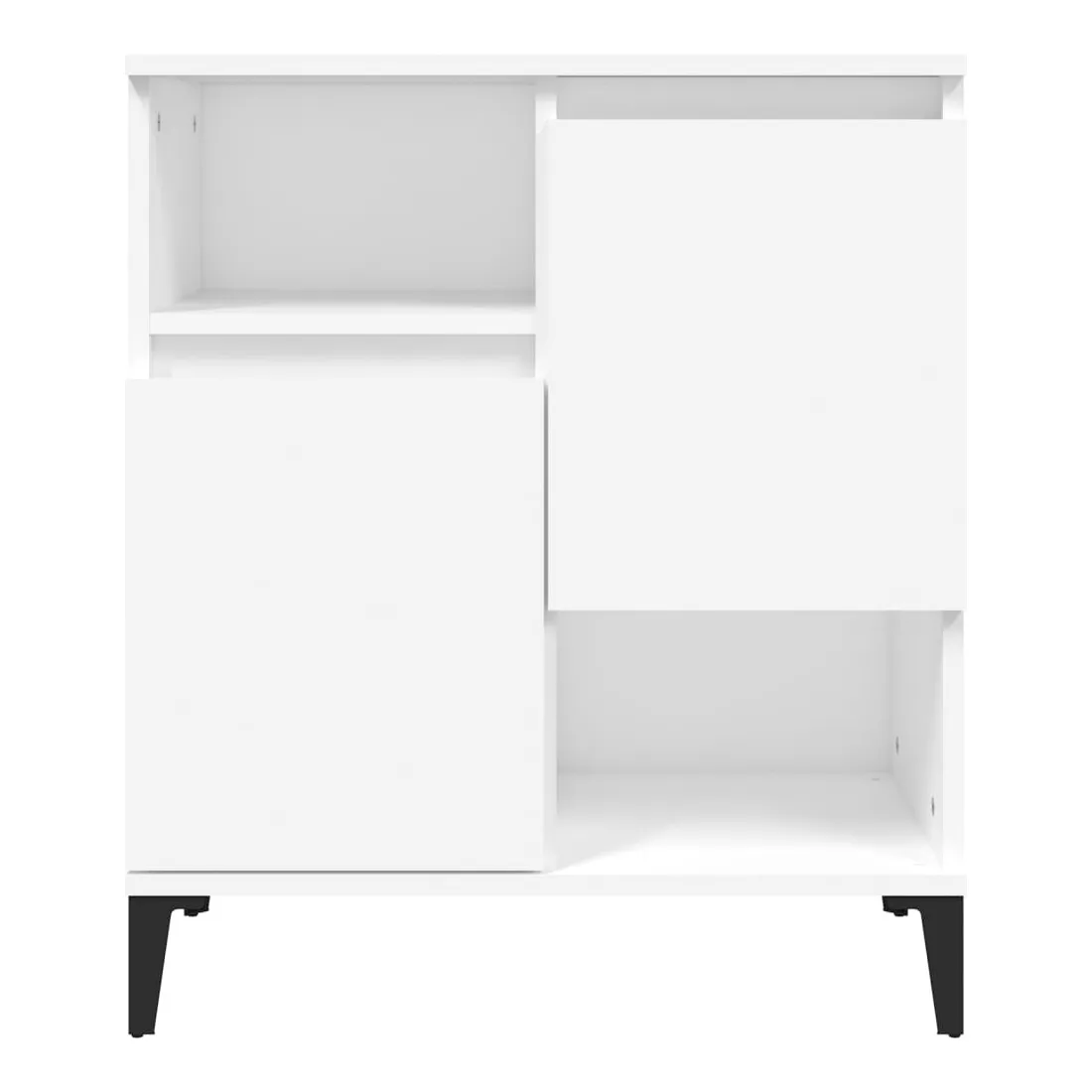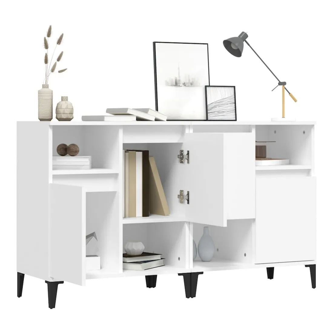Ces buffets classiques, au look intemporel, sont conçus pour être un excellent supplément à votre maison. Matériau durable : le bois d'ingénierie est d'une qualité exceptionnelle avec une surface lisse et présente également résistance, stabilité et résistance à l'humidité. Fabriquée en bois d'ingénierie, l'armoire est facile à nettoyer avec un chiffon humide.Grand espace de rangement : équipé de 4 compartiments, le meuble buffet offre un grand espace de rangement pour garder vos différents articles essentiels quotidiens bien organisés et facilement accessibles.Fonction d'affichage : le dessus du placard est idéal pour exposer vos objets décoratifs, albums photo ou petites plantes. Bon à savoir :Les portes peuvent être installées de deux manières. Attention :Pour éviter qu'il ne soit renversé, ce produit doit être utilisé avec le dispositif de fixation au mur fourni.