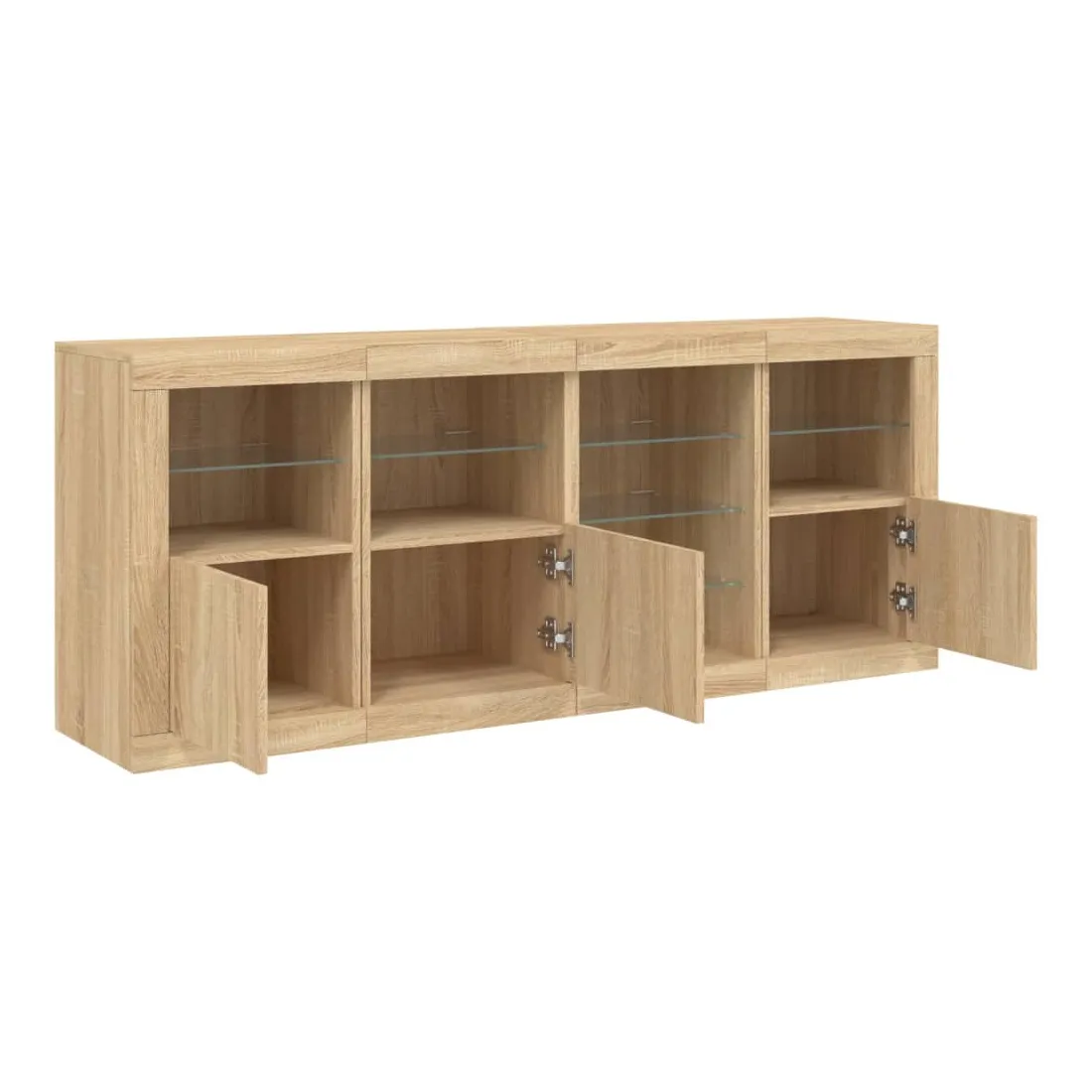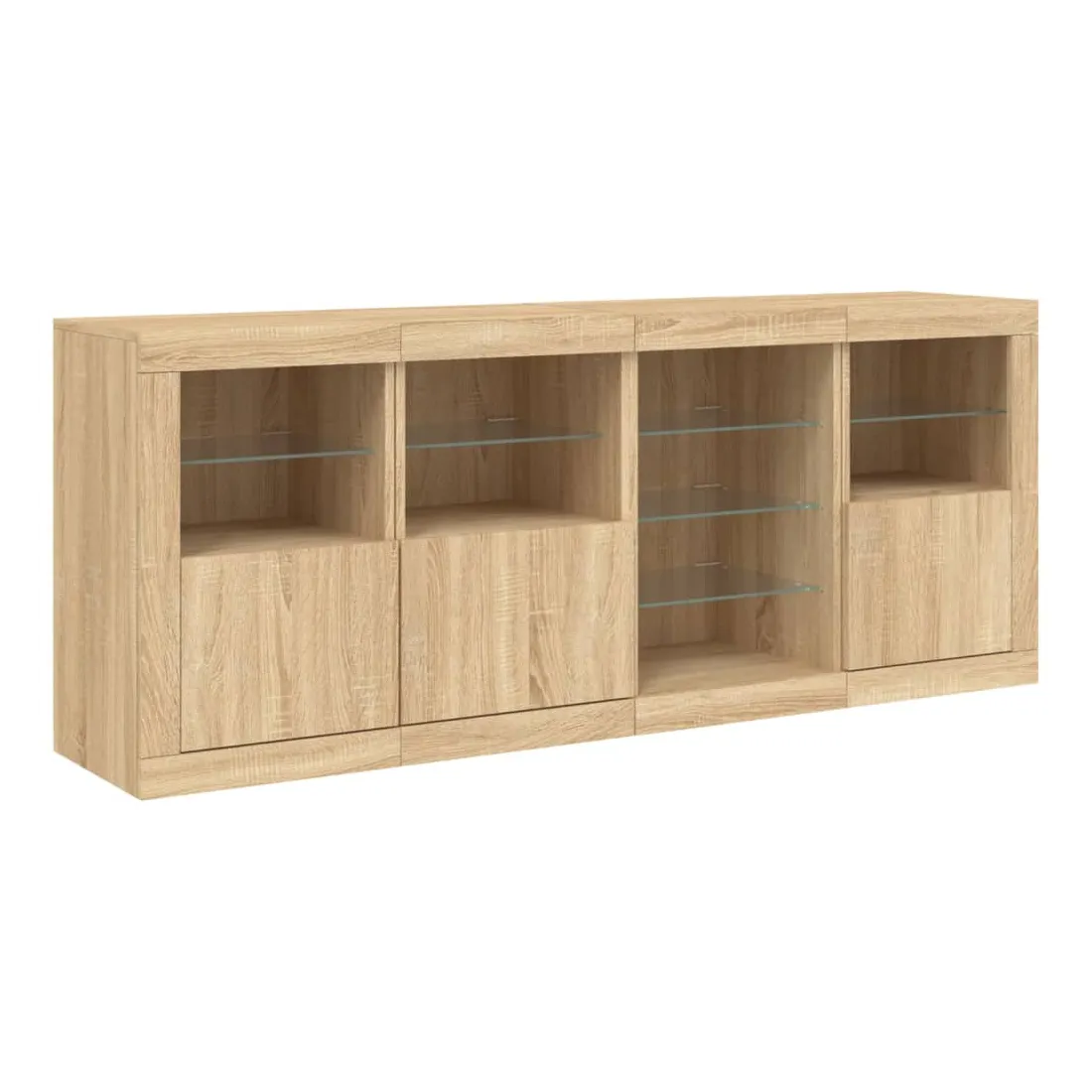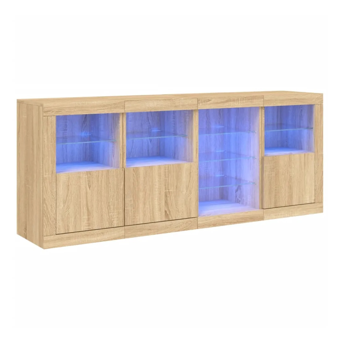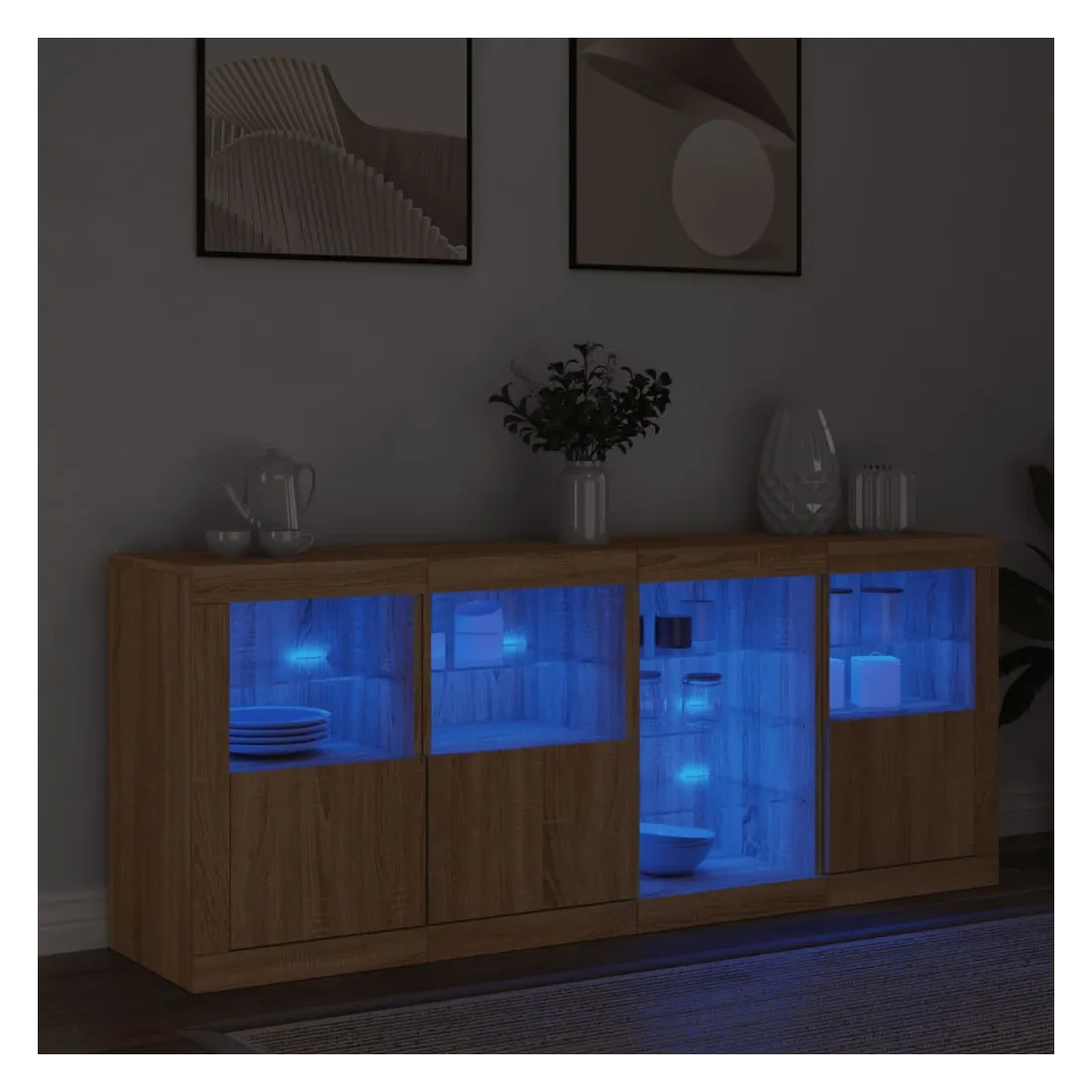 Décorez votre pièce avec ce buffet moderne avec éclairage LED, il s'harmonise facilement avec les meubles de tout style de votre maison. Matériau durable : le bois d'ingénierie est d'une qualité exceptionnelle avec une surface lisse et présente également résistance, stabilité et résistance à l'humidité.Lumières LED RVB : le buffet est équipé de lumières LED RVB vibrantes. Avec divers menus personnalisables, vous pouvez changer sans effort la couleur des lumières et même les régler automatiquement. Ces lumières LED renforcent non seulement l'aspect contemporain du buffet, mais aussi son attrait pour la mode.Grand espace de rangement : l'armoire de rangement offre beaucoup d'espace pour garder vos objets du quotidien bien rangés et facilement accessibles.Fonction d'exposition : la partie supérieure robuste de l'armoire d'entrée est idéale pour exposer des objets décoratifs, des cadres photo ou des plantes en pot.Porte pratiques : gardez vos essentiels à l'abri de la poussière en les cachant derrière les portes de l'armoire latérale. Bon à savoir :Ce produit est doté d'un connecteur USB qui nécessite une source d'alimentation USB de 5V certifiée (non incluse). Attention :Pour éviter qu'il ne soit renversé, ce produit doit être utilisé avec le dispositif de fixation au mur fourni.
