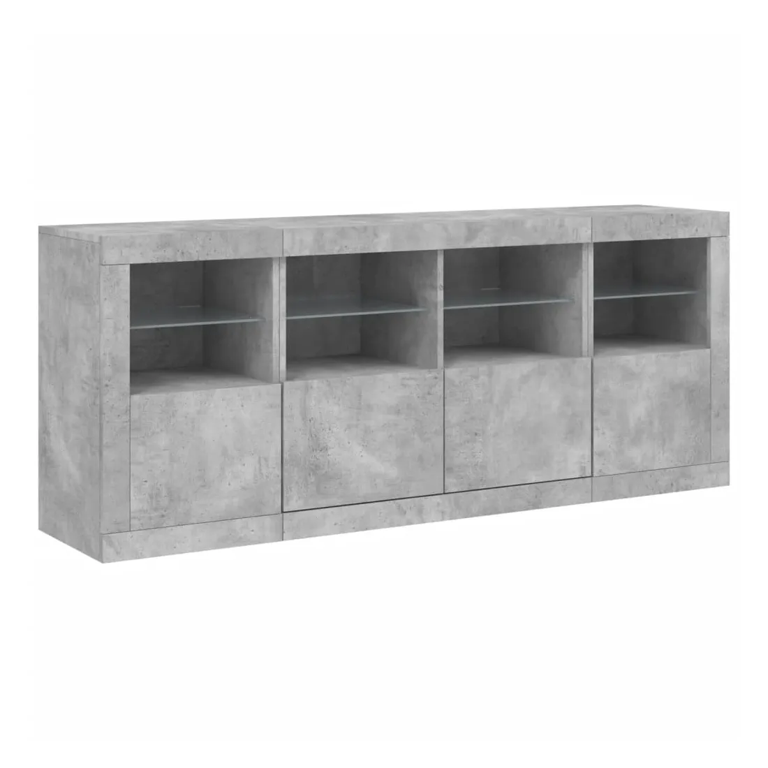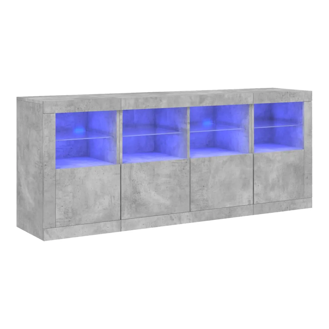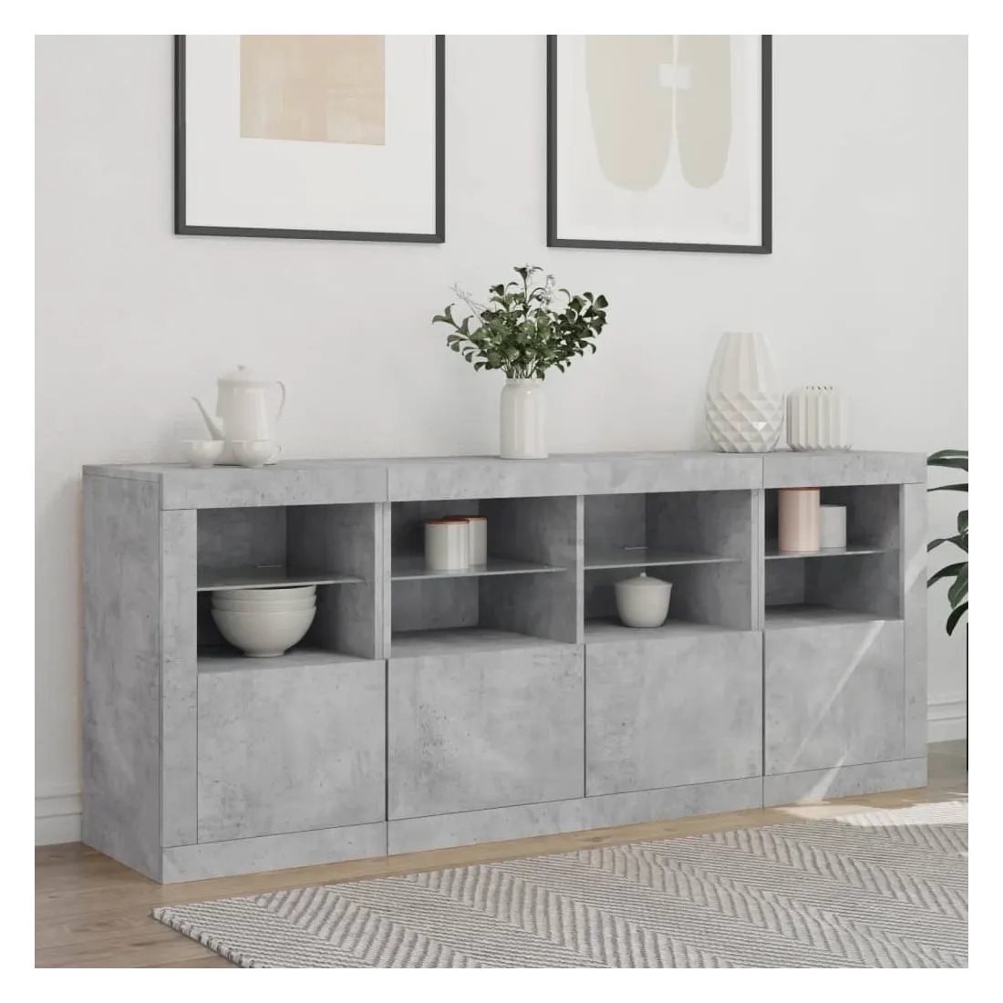 Décorez votre pièce avec ce buffet moderne avec éclairage LED, il s'harmonise facilement avec les meubles de tout style de votre maison. Matériau durable : le bois d'ingénierie est d'une qualité exceptionnelle avec une surface lisse et présente également résistance, stabilité et résistance à l'humidité.Lumières LED RVB : le buffet est équipé de lumières LED RVB vibrantes. Avec divers menus personnalisables, vous pouvez changer sans effort la couleur des lumières et même les régler automatiquement. Ces lumières LED renforcent non seulement l'aspect contemporain du buffet, mais aussi son attrait pour la mode.Grand espace de rangement : l'armoire de rangement offre beaucoup d'espace pour garder vos objets du quotidien bien rangés et facilement accessibles.Fonction d'exposition : la partie supérieure robuste de l'armoire d'entrée est idéale pour exposer des objets décoratifs, des cadres photo ou des plantes en pot.Porte pratiques : gardez vos essentiels à l'abri de la poussière en les cachant derrière les portes de l'armoire latérale. Bon à savoir :Ce produit est doté d'un connecteur USB qui nécessite une source d'alimentation USB de 5V certifiée (non incluse). Attention :Pour éviter qu'il ne soit renversé, ce produit doit être utilisé avec le dispositif de fixation au mur fourni.