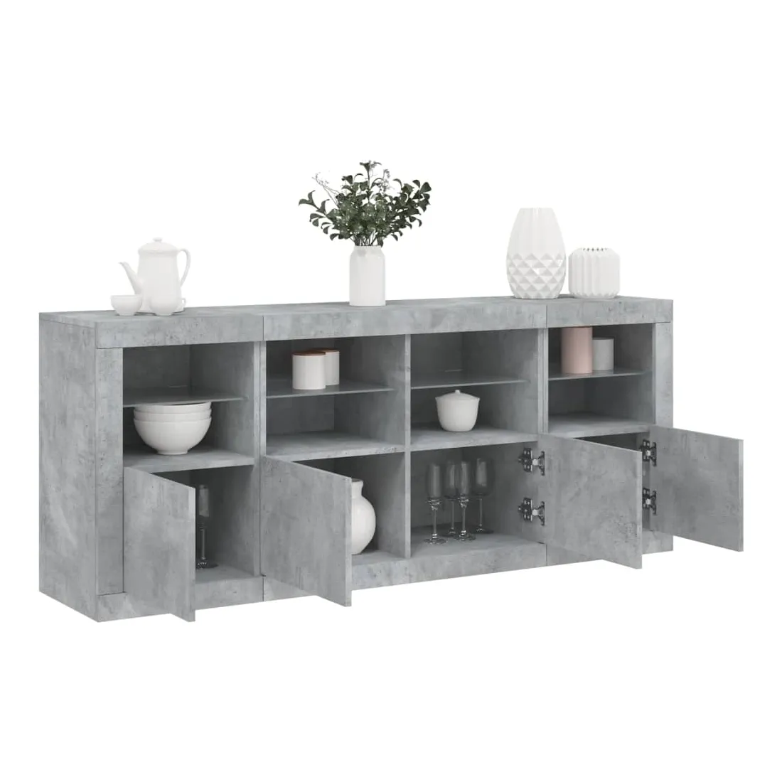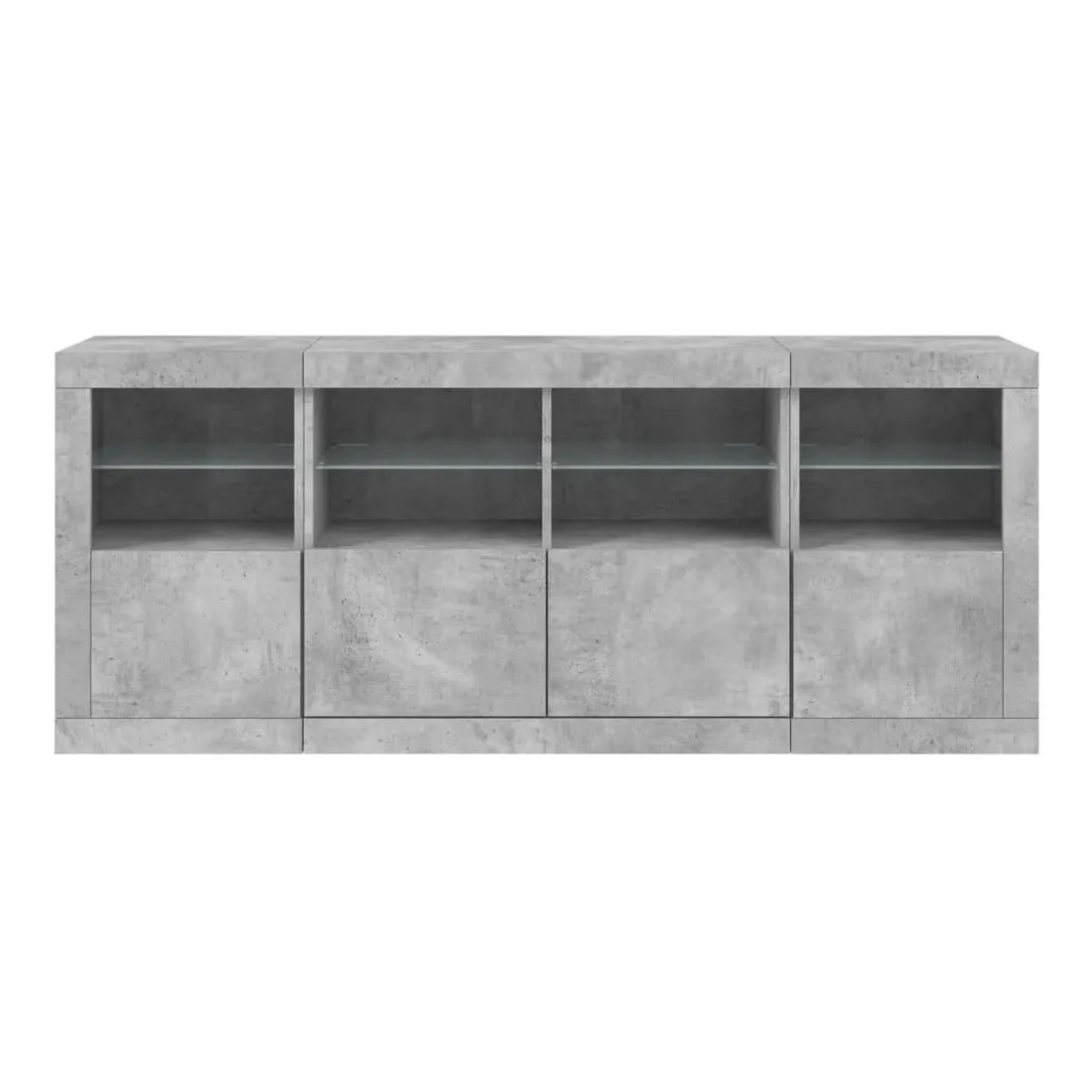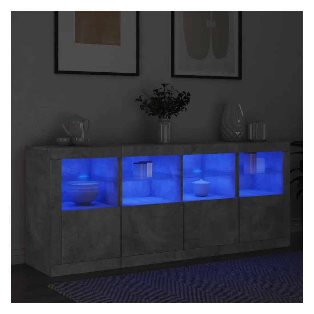Décorez votre pièce avec ce buffet moderne avec éclairage LED, il s'harmonise facilement avec les meubles de tout style de votre maison. Matériau durable : le bois d'ingénierie est d'une qualité exceptionnelle avec une surface lisse et présente également résistance, stabilité et résistance à l'humidité.Lumières LED RVB : le buffet est équipé de lumières LED RVB vibrantes. Avec divers menus personnalisables, vous pouvez changer sans effort la couleur des lumières et même les régler automatiquement. Ces lumières LED renforcent non seulement l'aspect contemporain du buffet, mais aussi son attrait pour la mode.Grand espace de rangement : l'armoire de rangement offre beaucoup d'espace pour garder vos objets du quotidien bien rangés et facilement accessibles.Fonction d'exposition : la partie supérieure robuste de l'armoire d'entrée est idéale pour exposer des objets décoratifs, des cadres photo ou des plantes en pot.Porte pratiques : gardez vos essentiels à l'abri de la poussière en les cachant derrière les portes de l'armoire latérale. Bon à savoir :Ce produit est doté d'un connecteur USB qui nécessite une source d'alimentation USB de 5V certifiée (non incluse). Attention :Pour éviter qu'il ne soit renversé, ce produit doit être utilisé avec le dispositif de fixation au mur fourni.